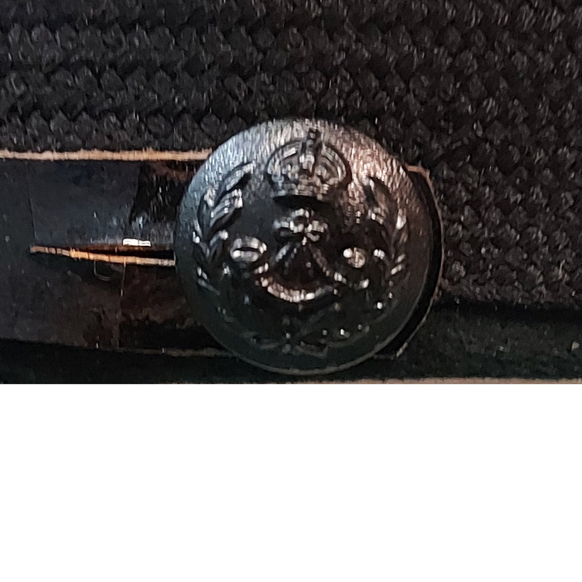 Rifle Regiment green wool body with leather peak having raised material oak leaves, and adjustable leather chinstrap with 2 small black Rifle Regiment King's Crown buttons to each side. Badge in place to the front of the cap. Manufacture marked leather sweatband, and manufactures label in place to the interior. Hand applied naming to the interior of the sweatband. SKU: 59046