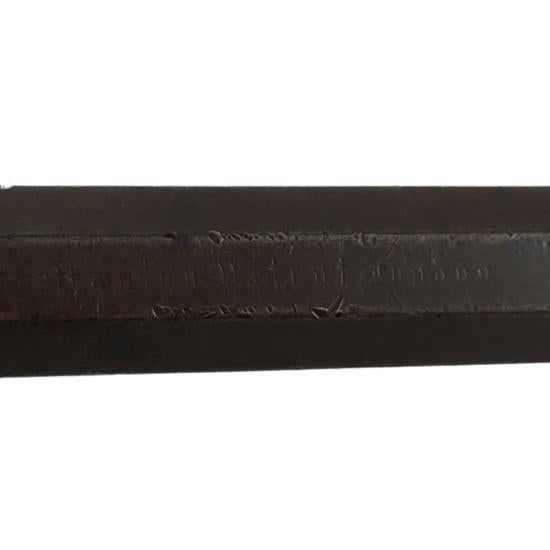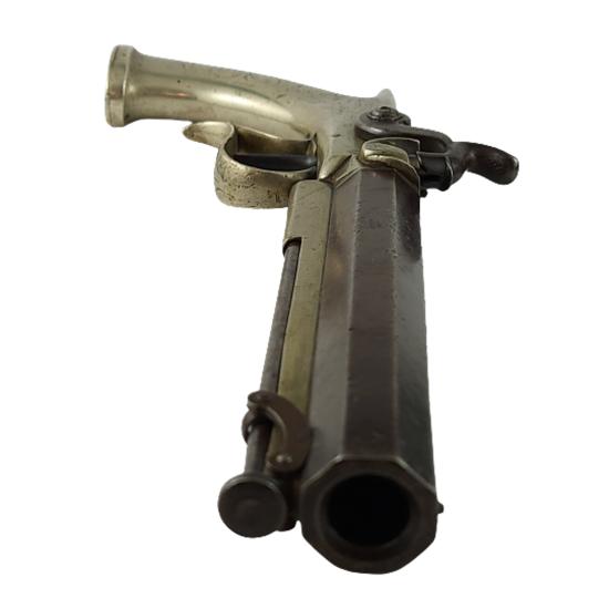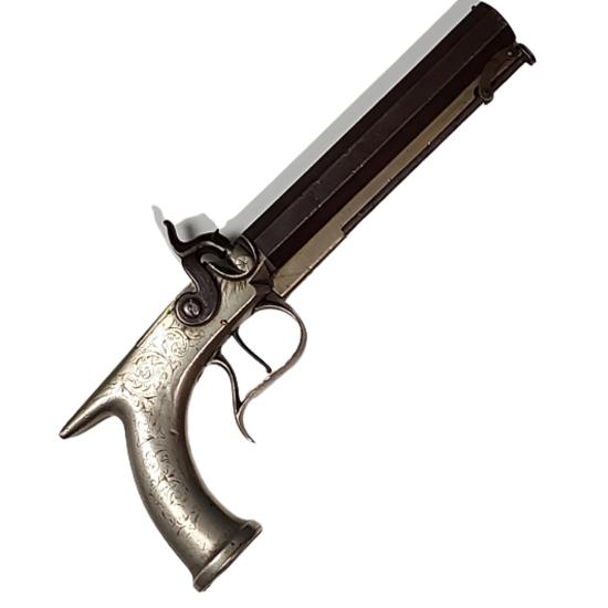 Measuring 9 1/2 inches overall with a 5 3/4 inch octagon 45 cal. percussion barrel, and captive swivel ramrod held in German Silver channel below. Marked "Manton Patent London" to the top of the barrel. Engraved German Silver sawhandle stock with an engraved hooked trigger guard and butt cap. Scroll engraved to the top, and each side of the stock. Functioning correctly with a good trigger spring. Barrel is turned to a nice aged brown finish with handling marks present to the barrel and stock.