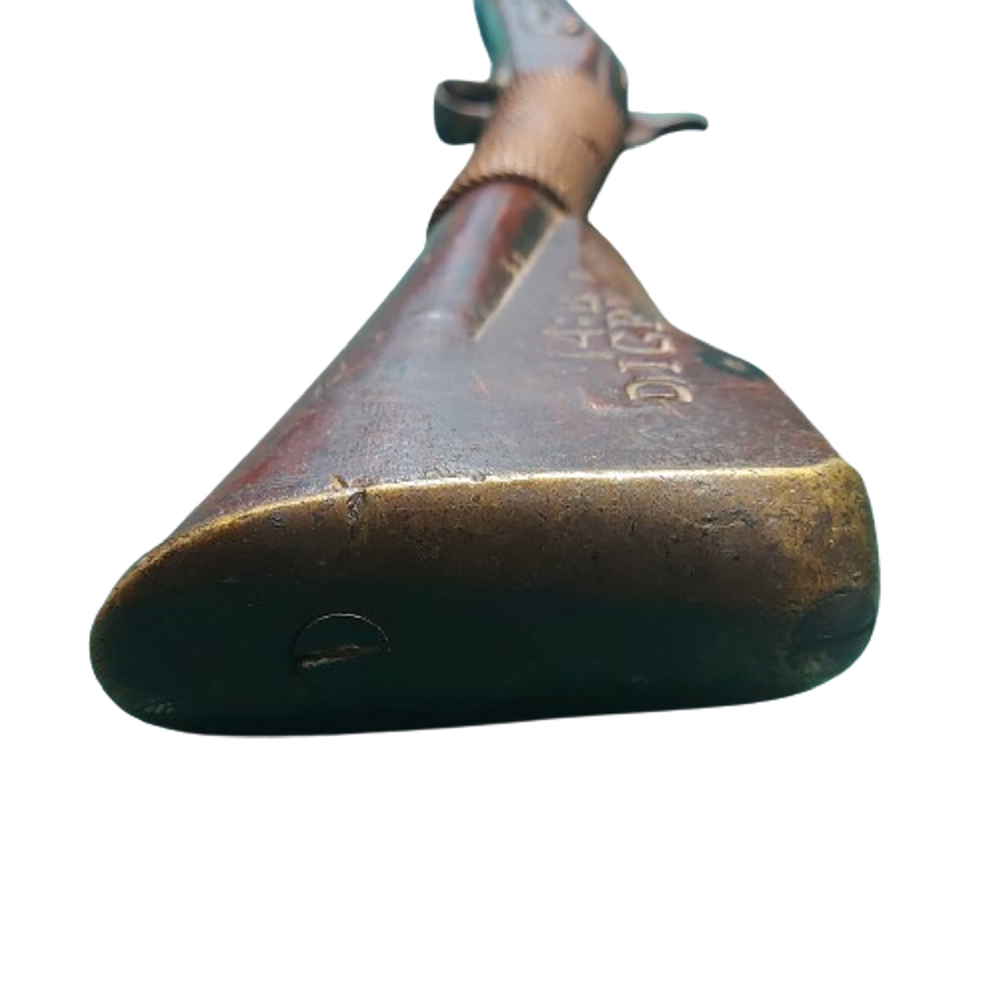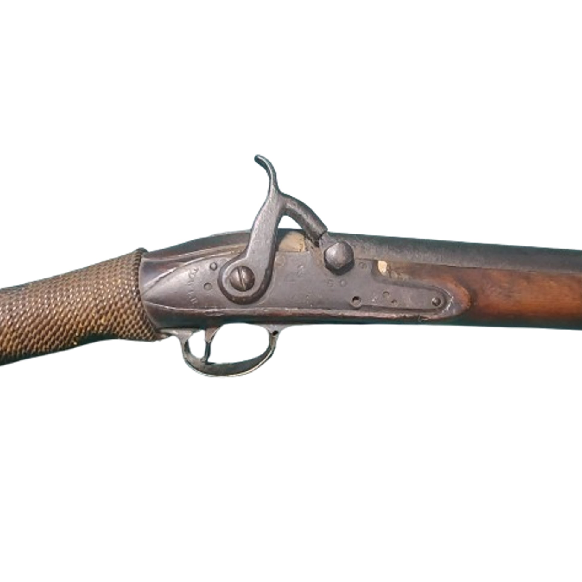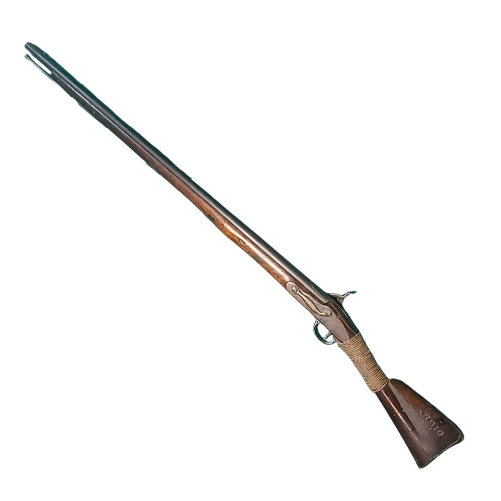 Antique India Pattern Brown Bess musket, with period conversion to percussion from flintlock. Full length wood stock with a 39 inch round barrel that is proof marked to the side, and a front blade sight that also serves to lock he triangular socket bayonet in place. Brass furniture with issue steel ramrod in place. Side of lock is marked Tower behind the hammer with a King George Crown and a British Broadarrow in front of the hammer. Stock is period applied by hand marked to the 14th Battalion Digby (Nova Scotia) to the left side of the stock. Period woven cord repair to the wrist that has been there for a very long time, and possibly applied in the battlefield. Shows use, wear, and age. A well marked and historical early Canadian Arm. SKU: 61357