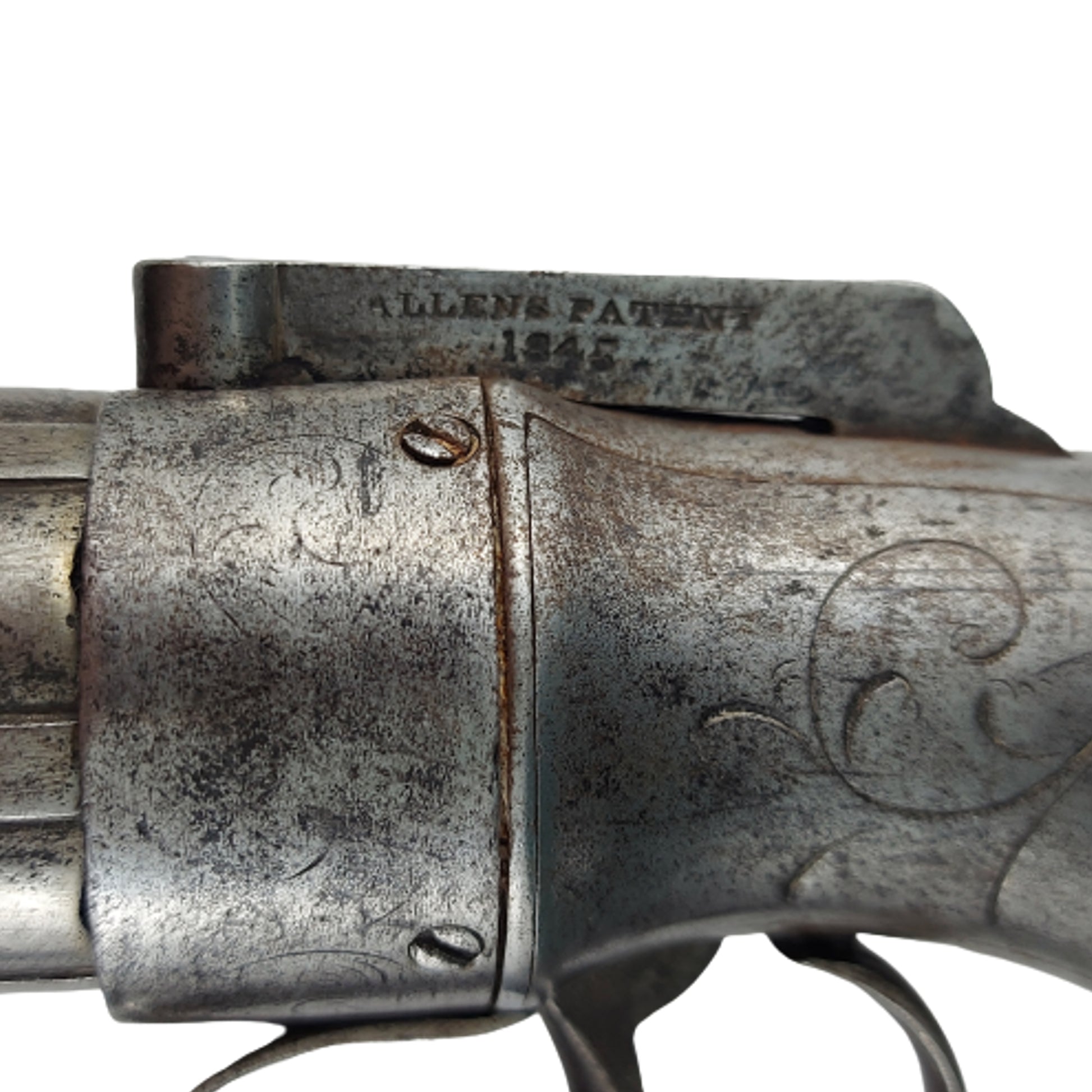 Worchester Connecticut production, 32 cal. cap and ball, six shot, double action pistol with a 4 inch length round barrel cluster with a raised rib between each barrel. Scroll engraved frame with an engraved circular nipple shield. Two piece American walnut grips showing wear, but with the original color and finish being present. Finish is grey from age and handling with the barrel markings being faint. Hammer is marked to the left side "Allen's Patent 1845". Bores are dark as to be expected, and mechanics are excellent with a strong spring, and cycling and functioning correctly.