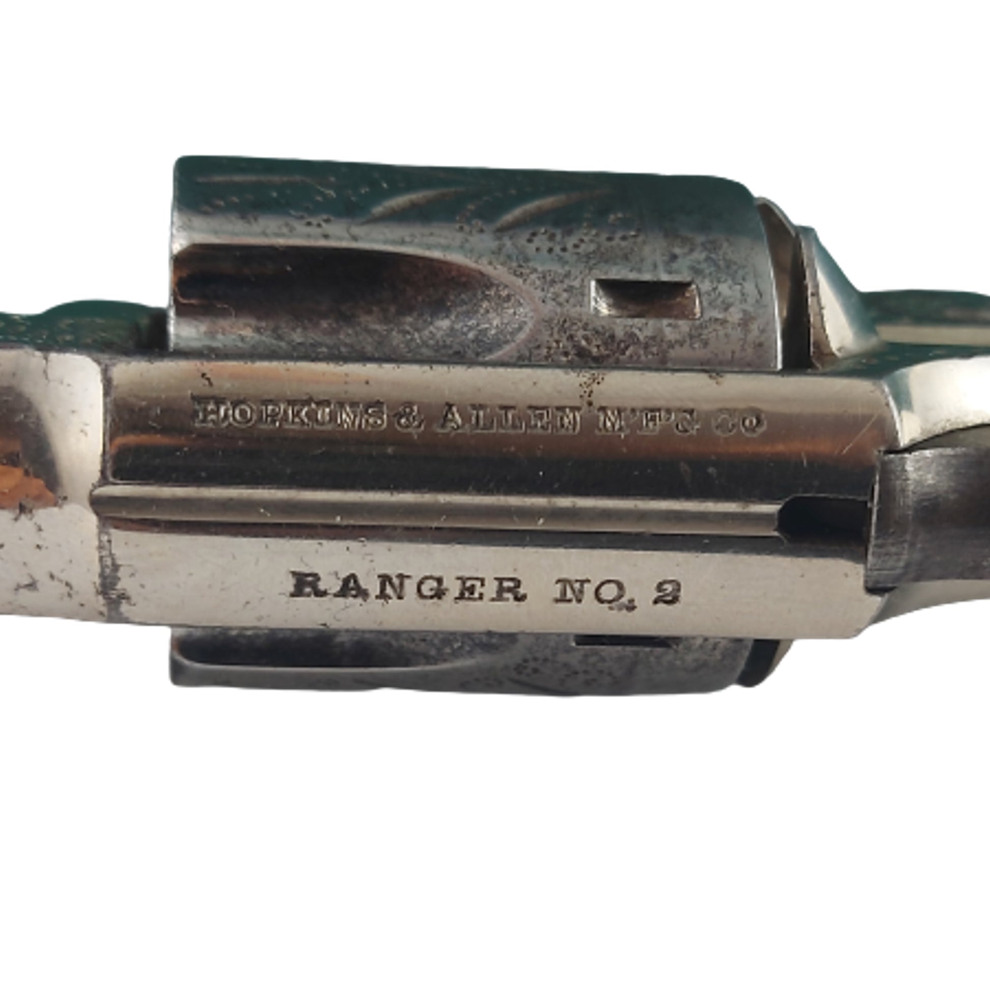 Antique Factory Engraved Hopkins And Allen Ranger No.2 Pocket Pistol with scroll engraving to both sides of the frame, around the cylinder, and to the sides of the 2 3/4 inch round barrel, and to the upper portion of the back strap. Chambered in 32 rimfire, single action 5 shot spur trigger revolver that retains approx. 90% of the original nickel finish. Manufacture marked to the top of the frame, "Hopkins And Allen Ranger No.2" and marked to the top of the barrel, "Pat. March 28, 1871". Checkered and designed deluxe 2 piece hard rubber grip panels are in excellent condition with no damage and only minor wear. Functioning correctly with a tight lock up, strong hammer spring and positive ignition, all being mechanically excellent. SKU: 59897
