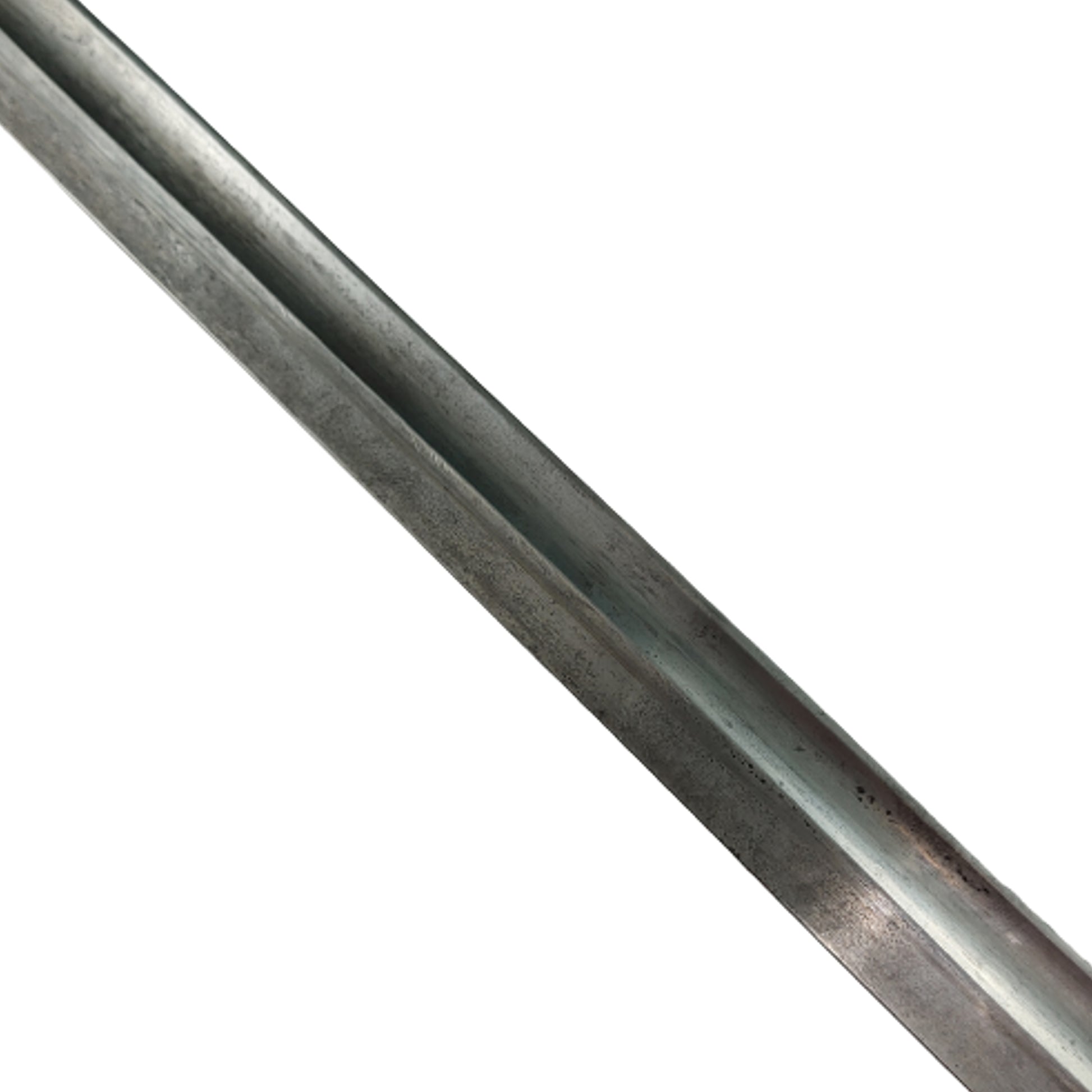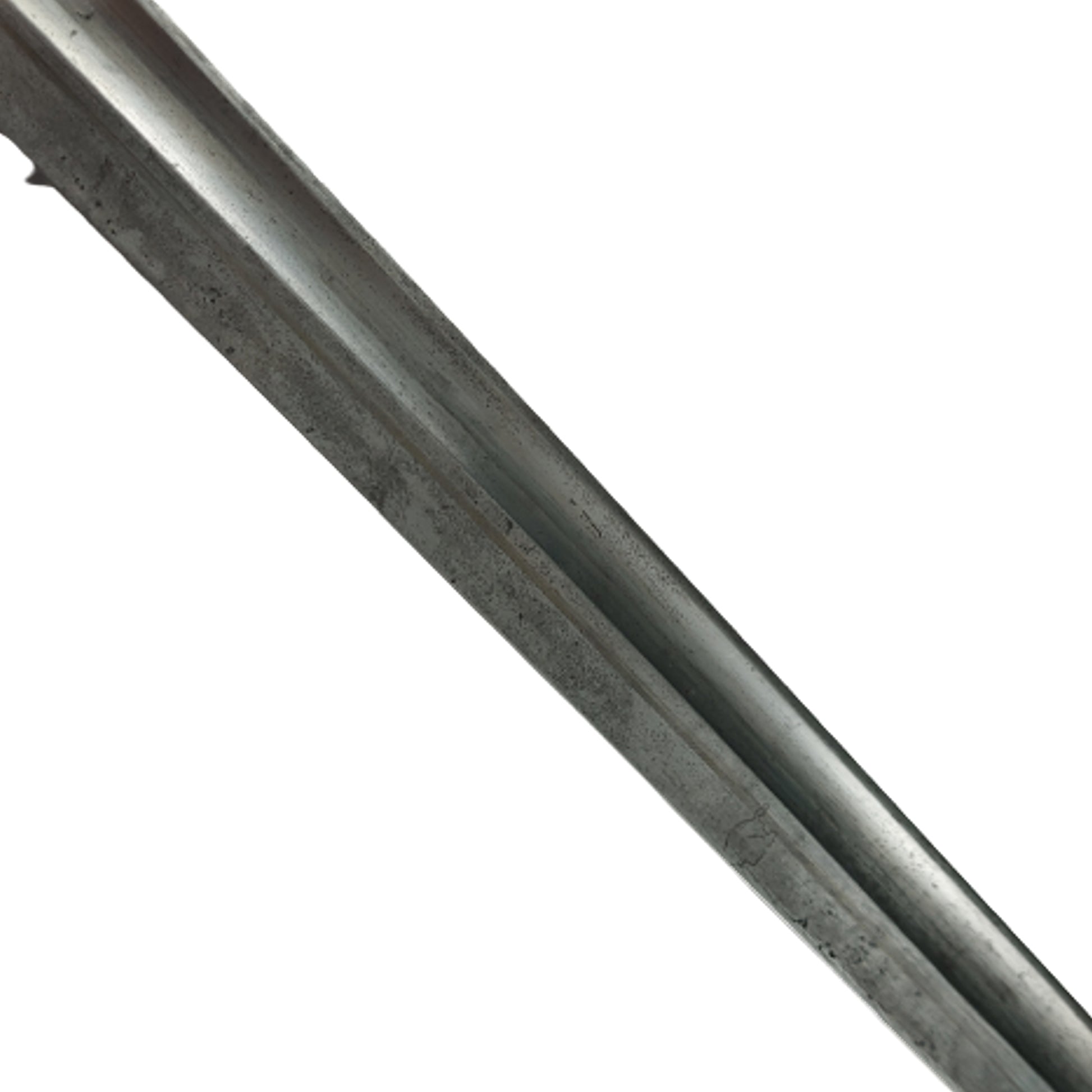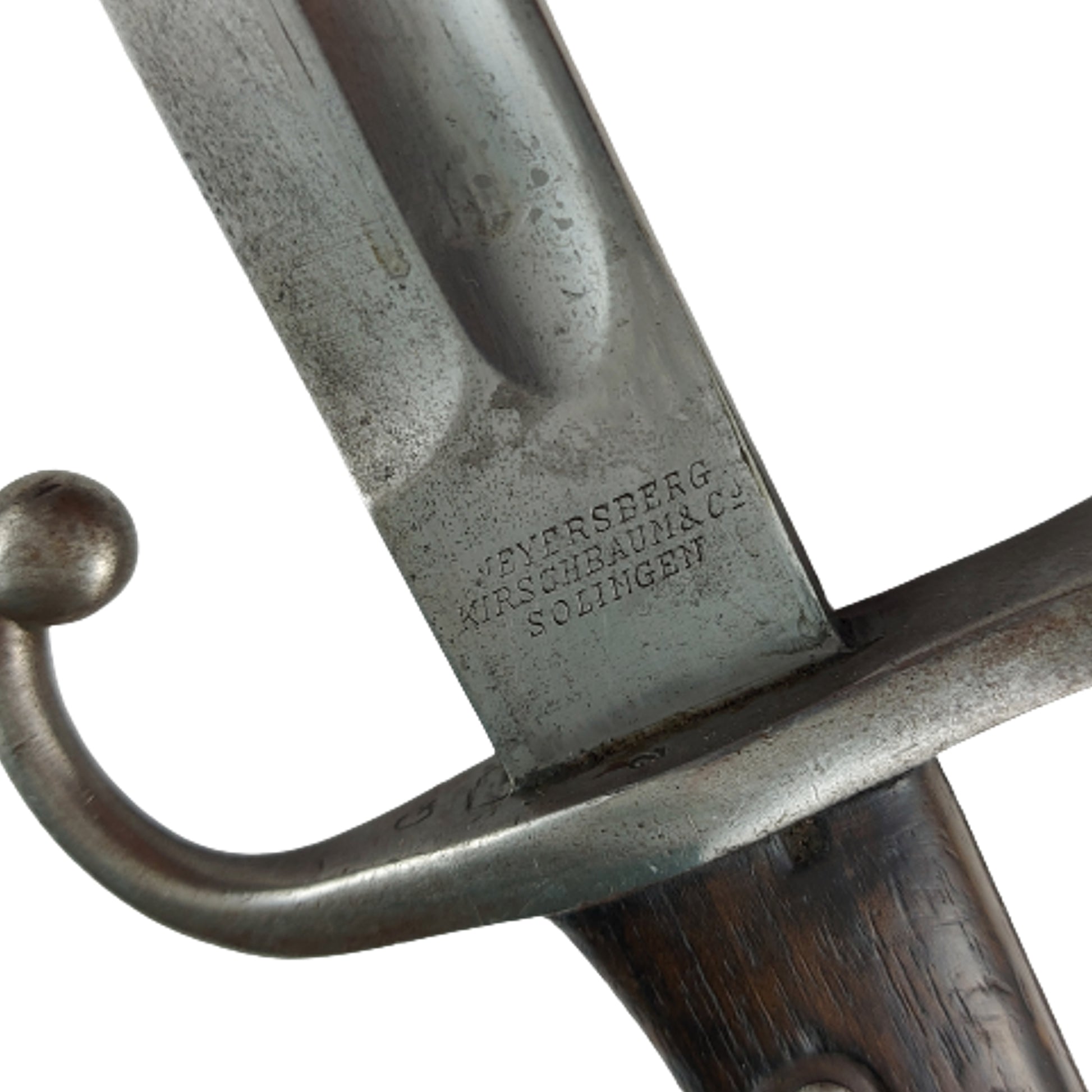Measuring 20 1/2 inches overall with a 15 3/4 inch single edged, fullered blade and 2 piece wood grip panels. Steel hooked cross guard and pommel with functioning release button in place. German maker marked to one side of the blade, Weyersberg Kirschbaum & Co. Solingen, and Modelo Agentino 1905 with the serial number and the crest being ground. In the steel field scabbard that is serial numbered, but not matching to the blade. SKU: 60195