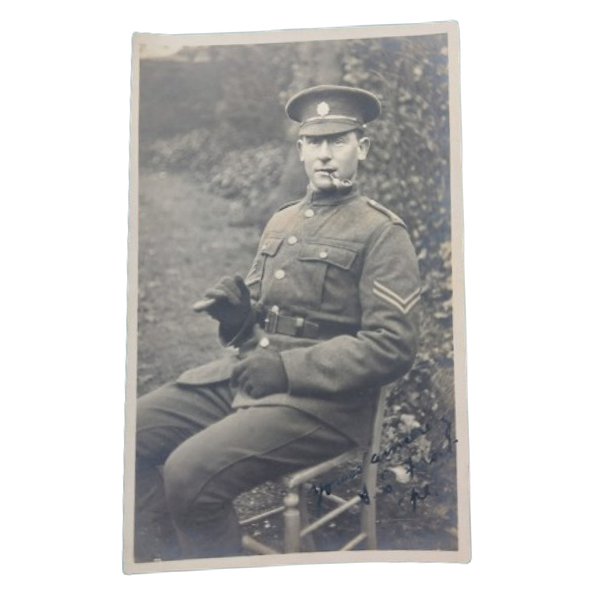 Black and white picture postcard showing a Corporal in uniform with visor cap. Period applied naming to the lower right corner. SKU: 61518