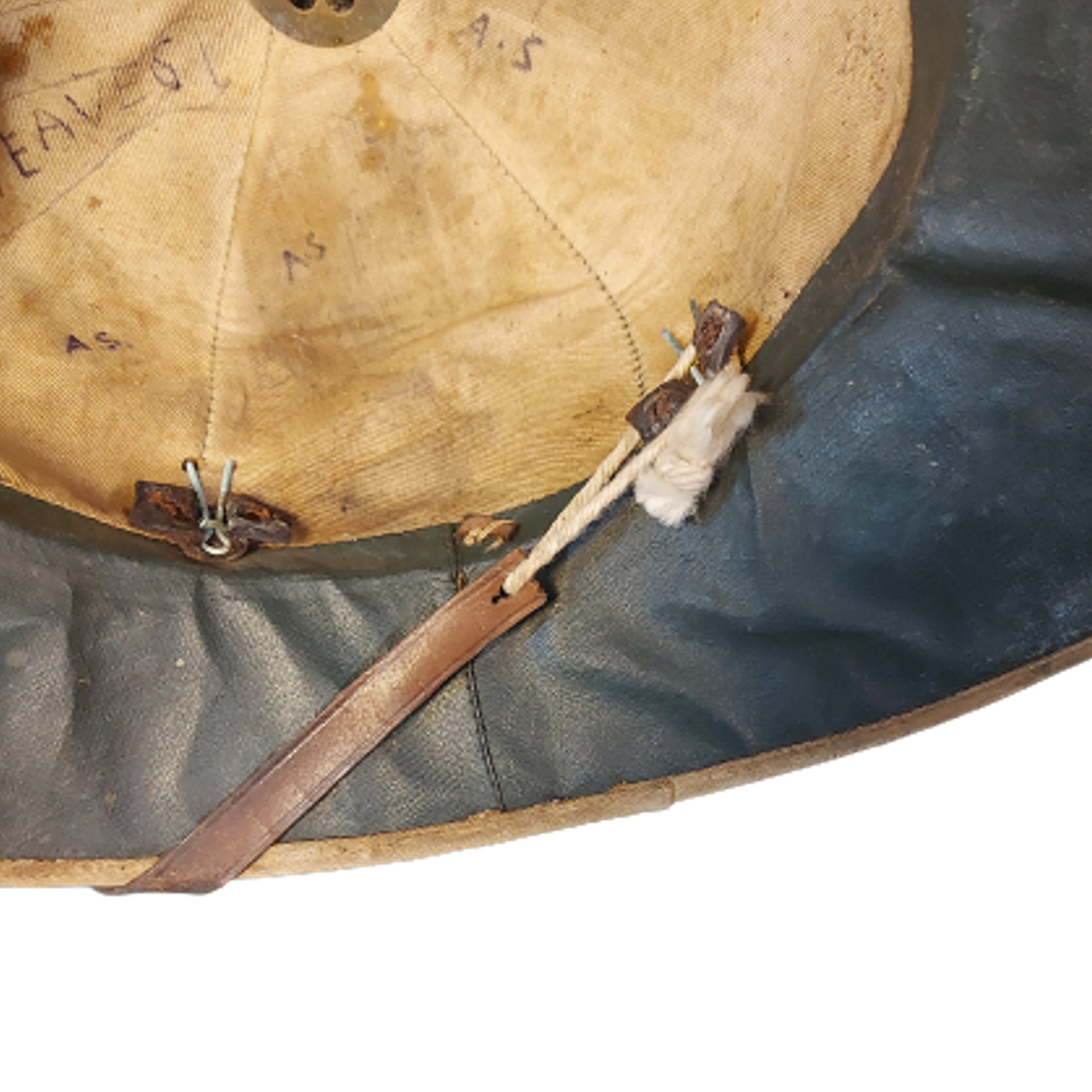 Canvas construction pith helmet with dark green oil cloth to the interior of the brim with chinstrap in place (shows damage). Hand applied colored Siege Park Insignia to the exterior left side. Period applied hand written naming to the interior "C. Sheaves" with the letters "A.S." in 4 places. Unresearched. Shows use and wear as to be expected. Rare with the Siege Park Insignia and the only one we have ever encountered. SKU: 59875