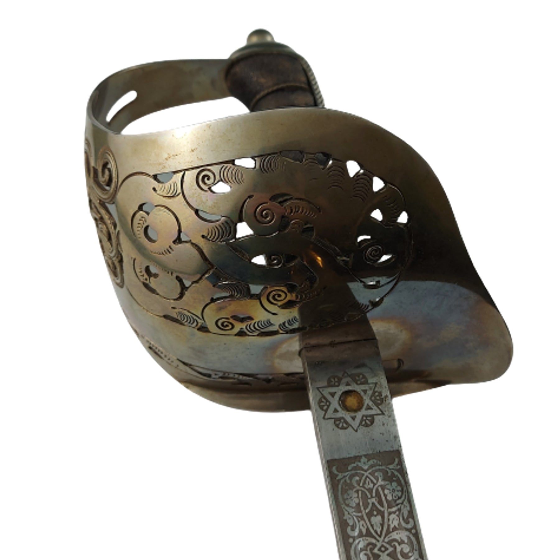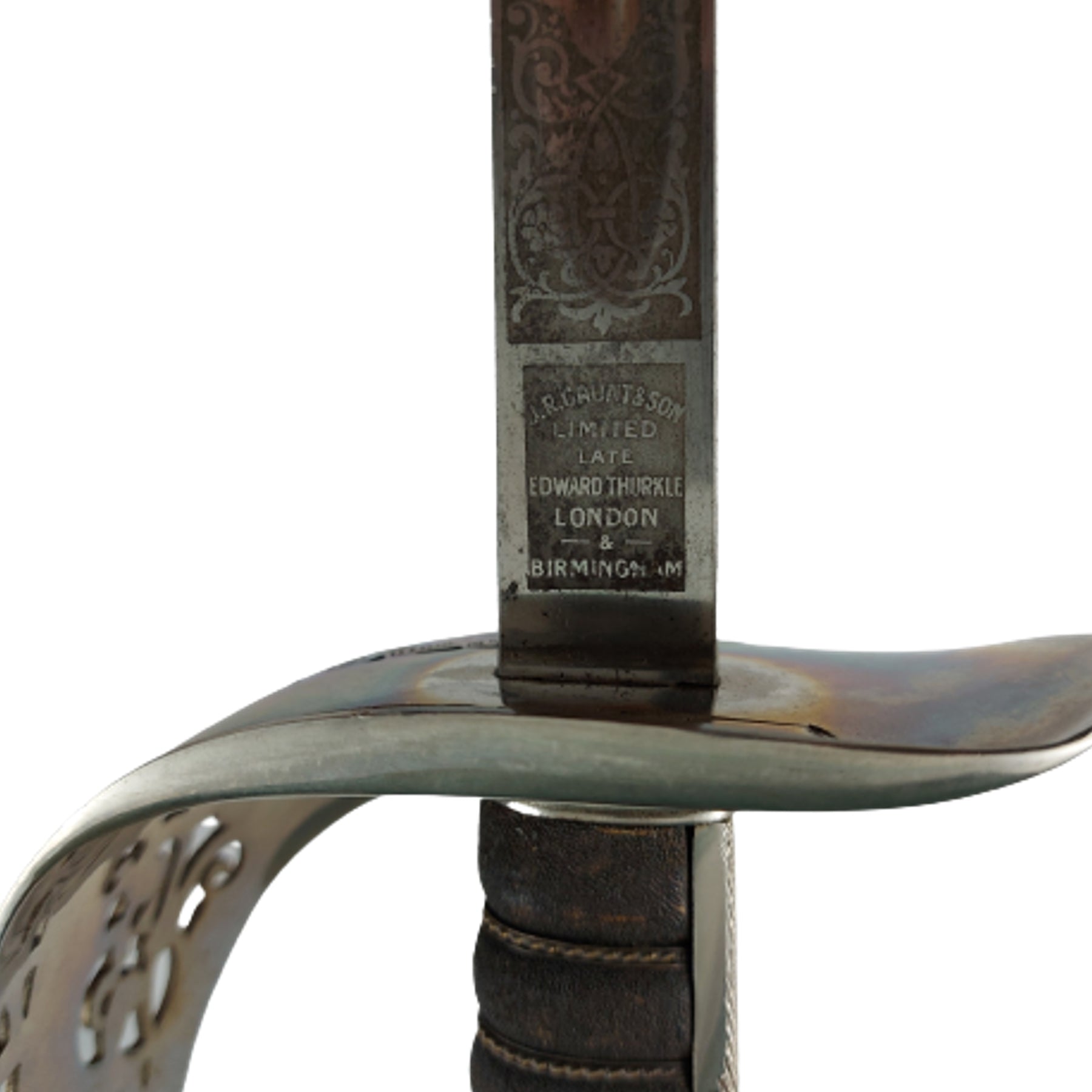 Measuring 39 inches overall with a 32 3/4 inch blade, etched to both sides and with a George V cypher and King's Crown. Proofed to one side and maker marked to the other, "J.R. Gaunt & Son Limited, Late Edward Thurkle London and Birmingham". Shark skin grip with wire wrapping. Numbered to the spine of the blade, "17017". Leather covered field scabbard in place. Very good condition overall with some minor age discoloration to the lower portion of the blade.