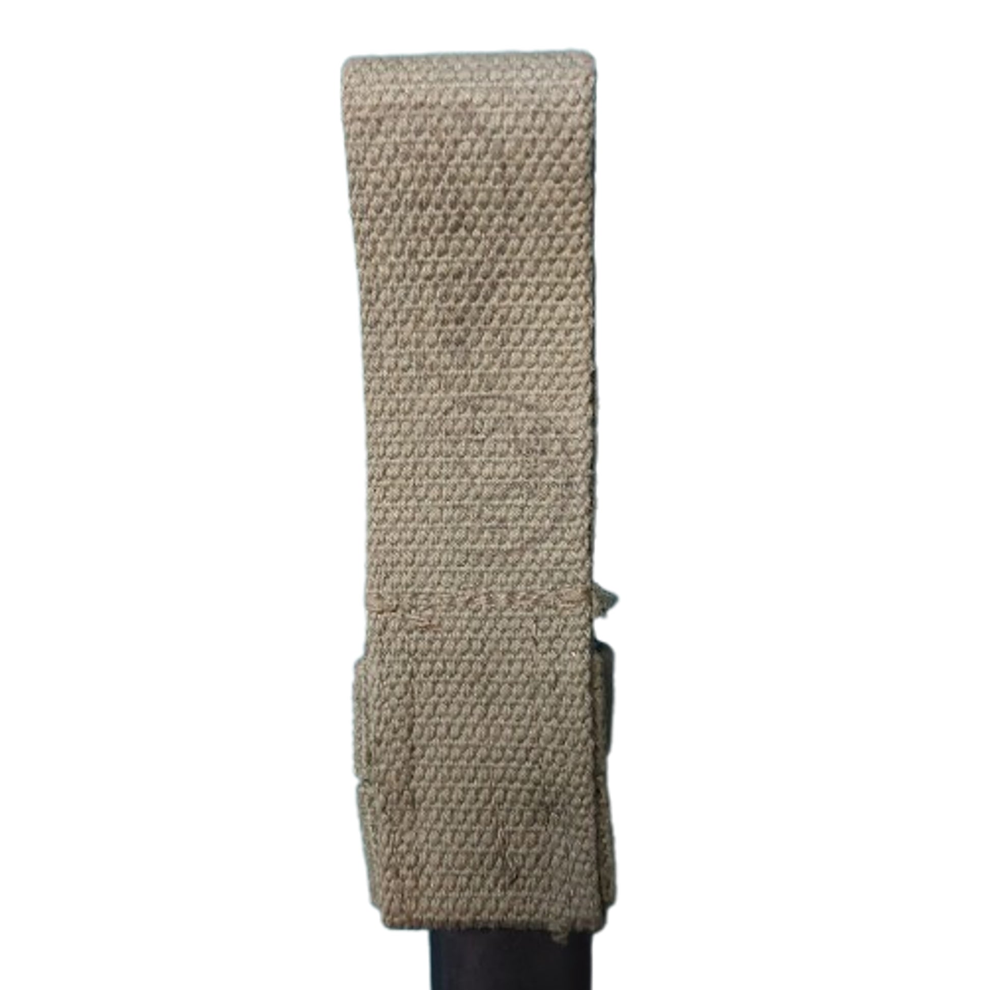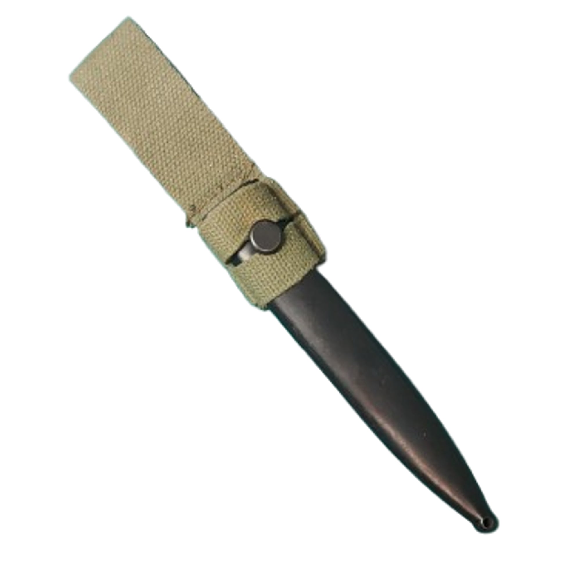 Belgian FN FAL M1965 Rifle Bayonet. All steel, tubular design is made to mount over the 22mm flash hider/grenade launcher muzzle and also be a handle for knife use. Measures 11 1/2 inches overall with a rounded top, flat bottomed, double edge 6 1/2 inch blade. In the issue molder plastic over steel field scabbard with Canadian issue marked, green webbed frog in place. Bayonet is in excellent condition and appears unused and unissued. SKU: 63027