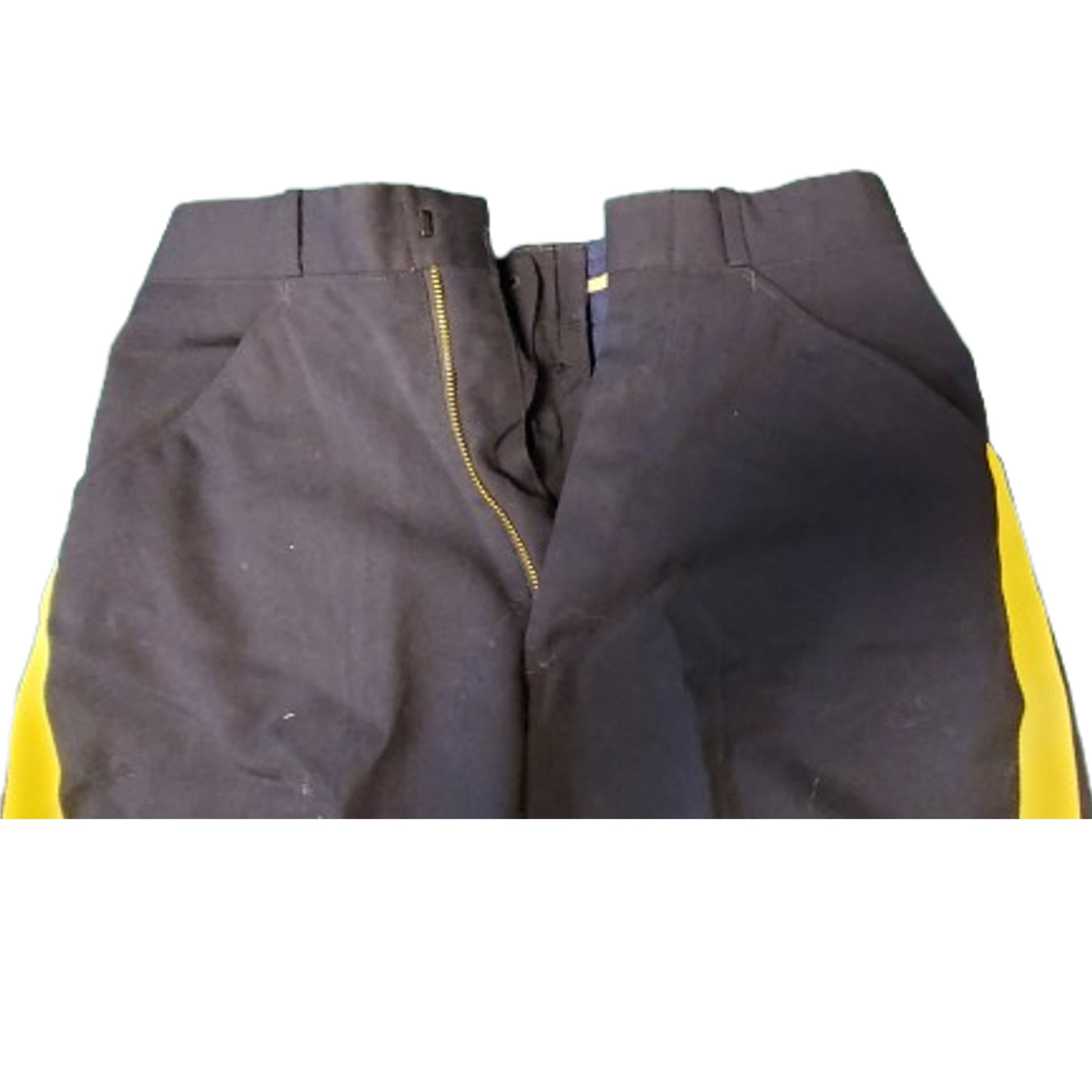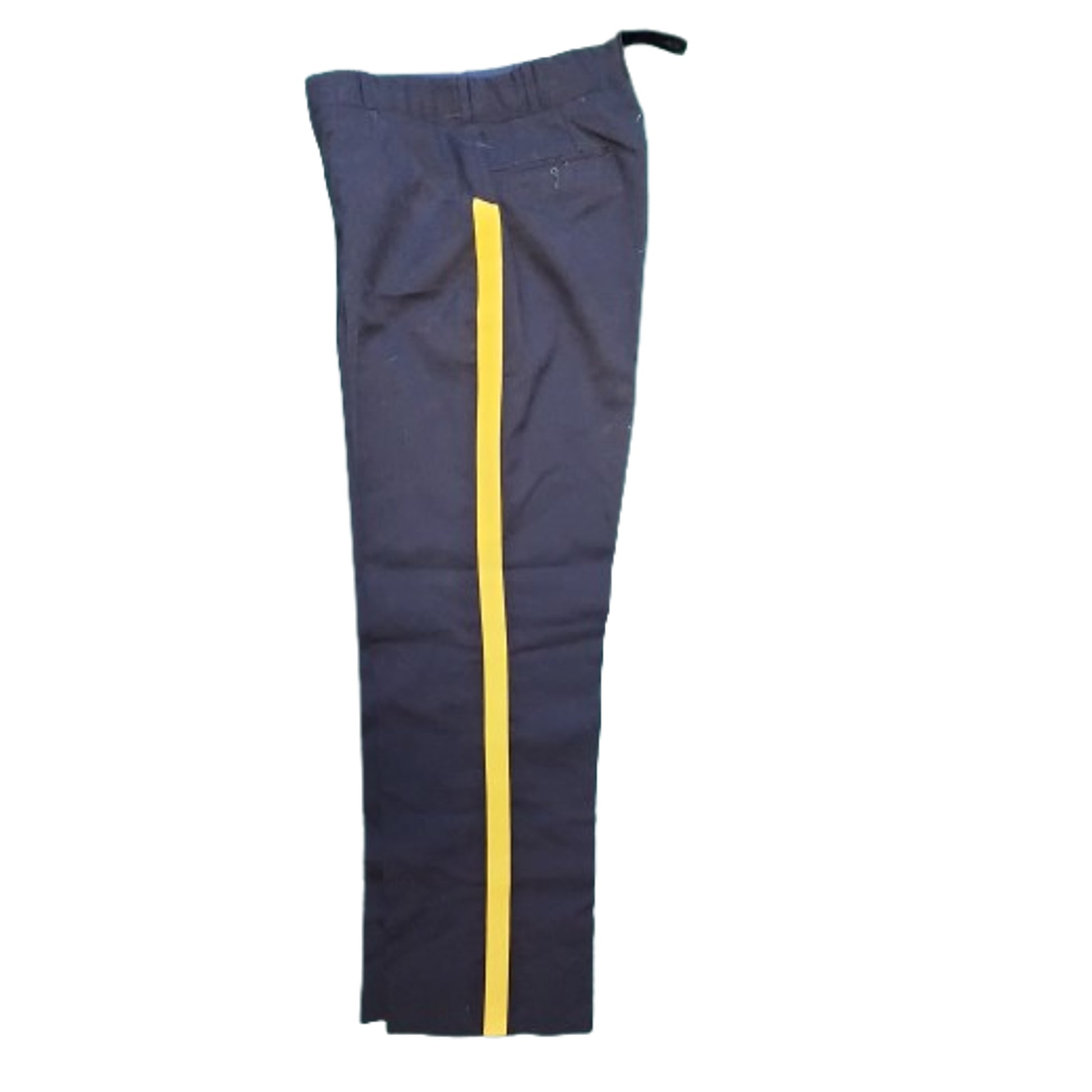 Cotton material with yellow stripe to the length of each leg. Missing one button to the back belt loop that can be replaced. 26 inch waist, 29 1/2 inch inseam. No label or visible markings in place. SKU: 63180