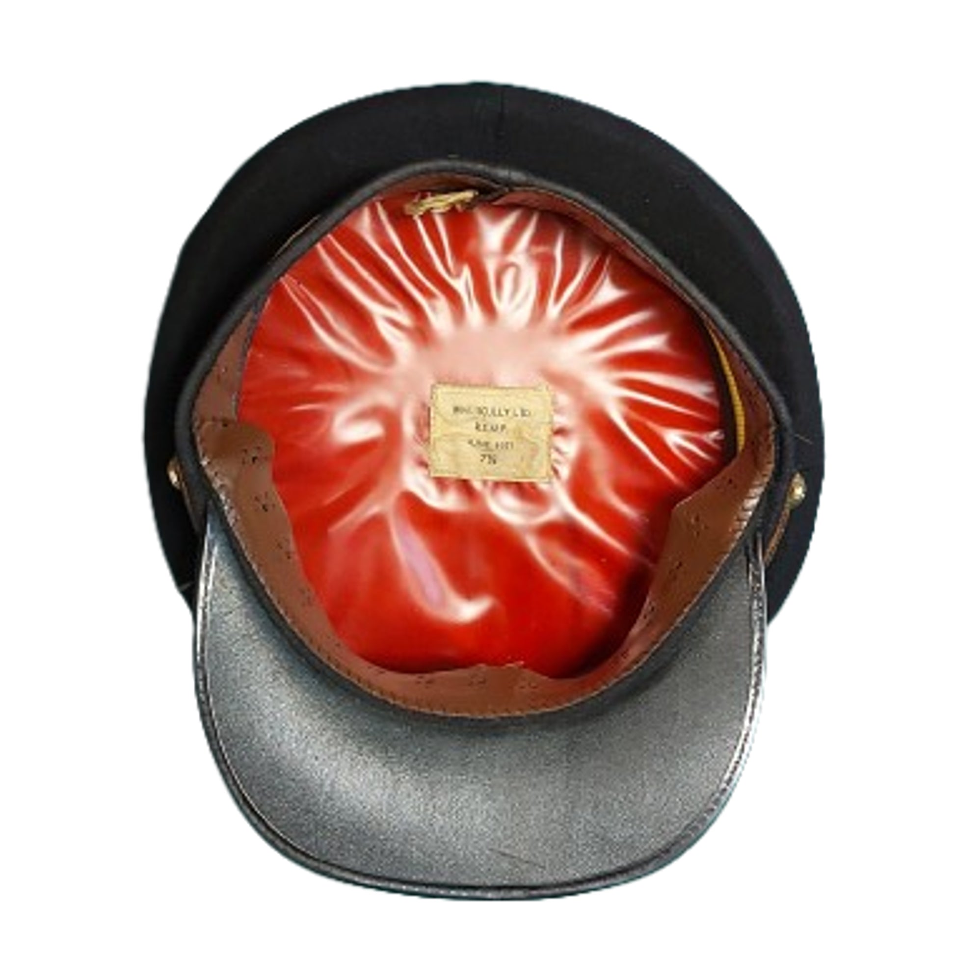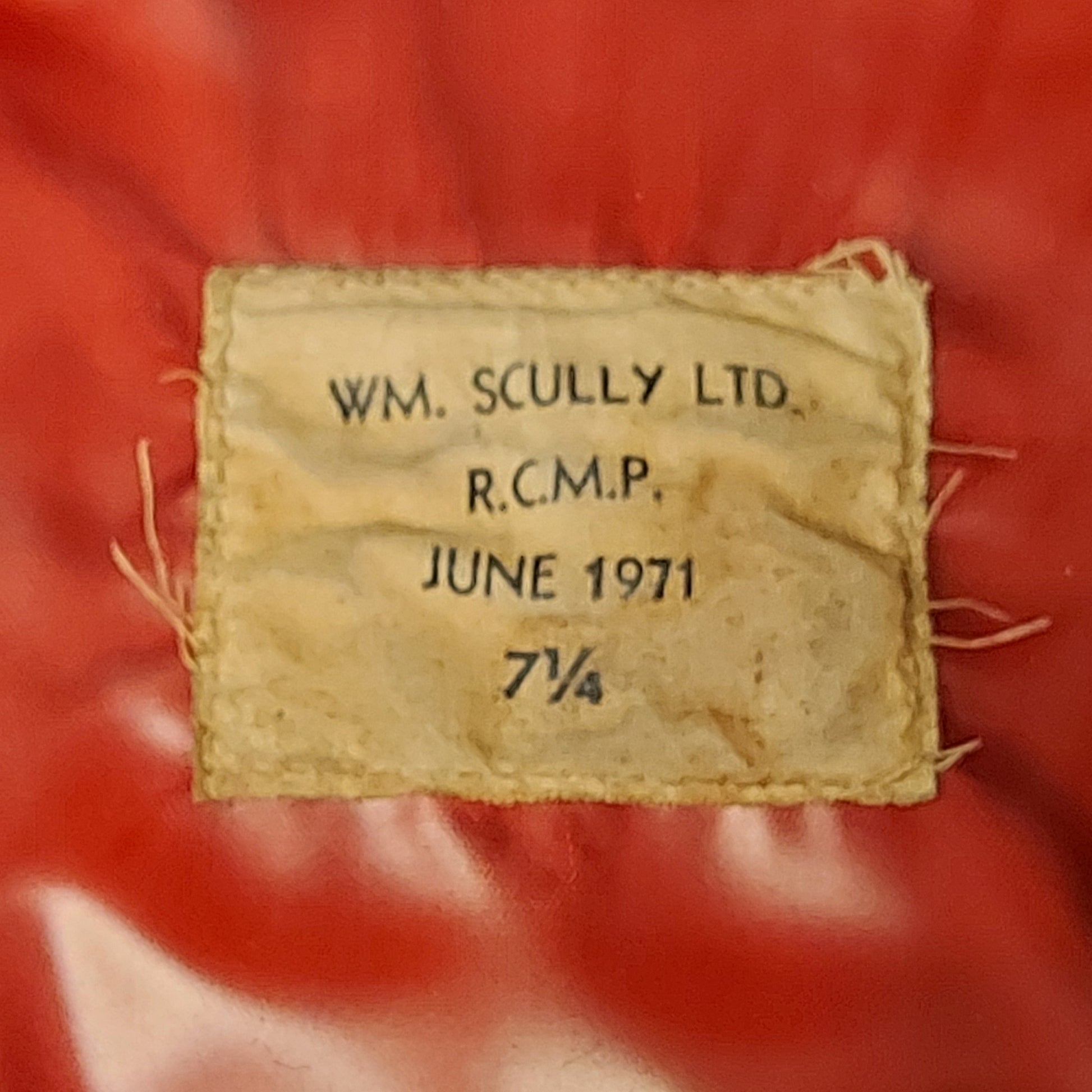 Wool material visor cap with meshed yellow nylon center band and adjustable leather chinstrap with 2 small brass RCMP side buttons. Issue cap badge in place to the front. Manufactures label in place to the interior, "WM. SCULLY LTD. RCMP JUNE 1971" Size 7 1/4. SKU: 63181
