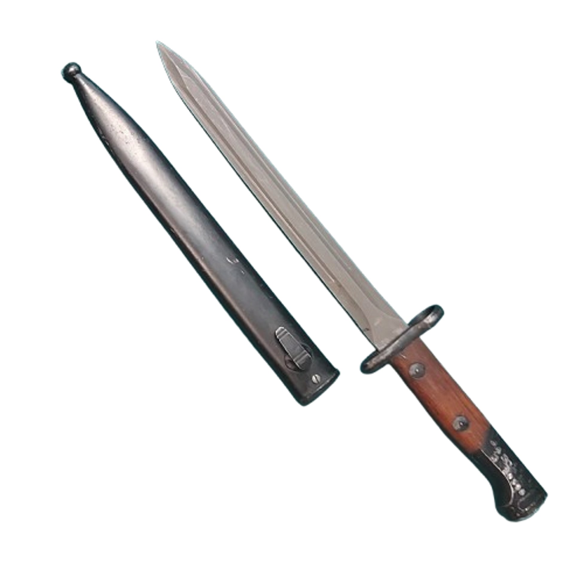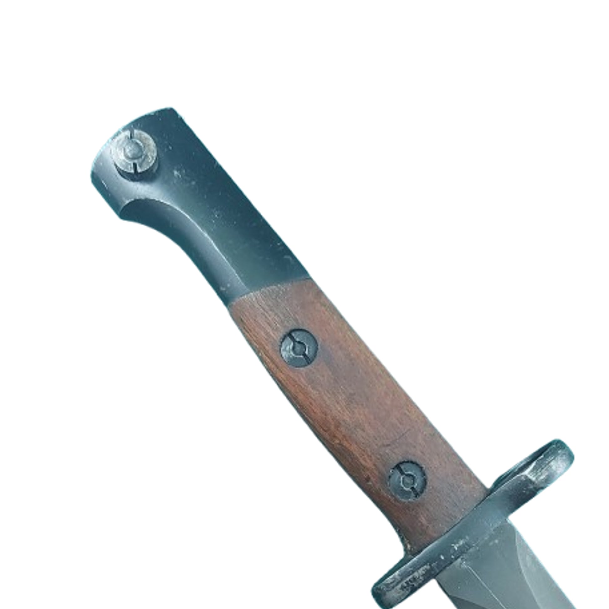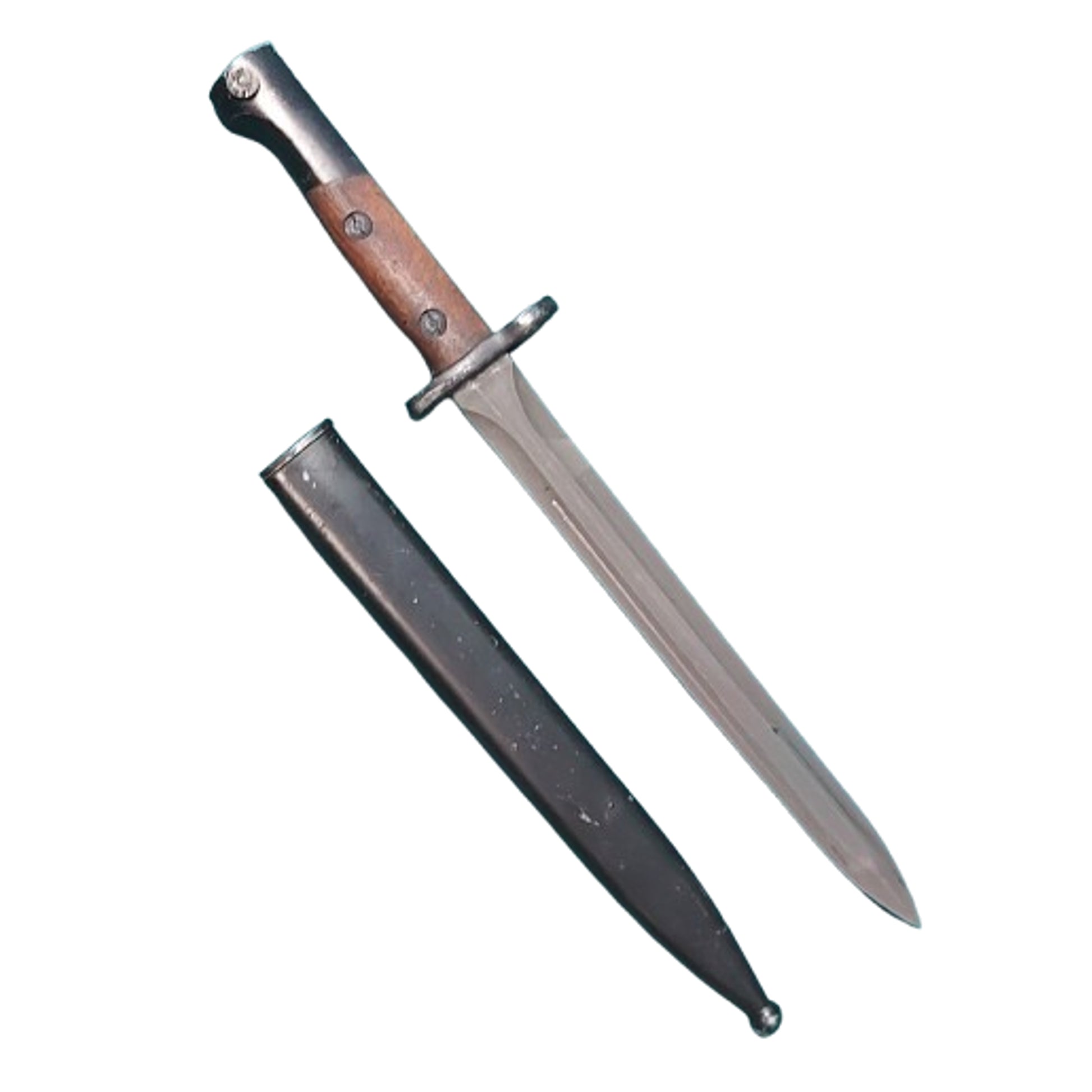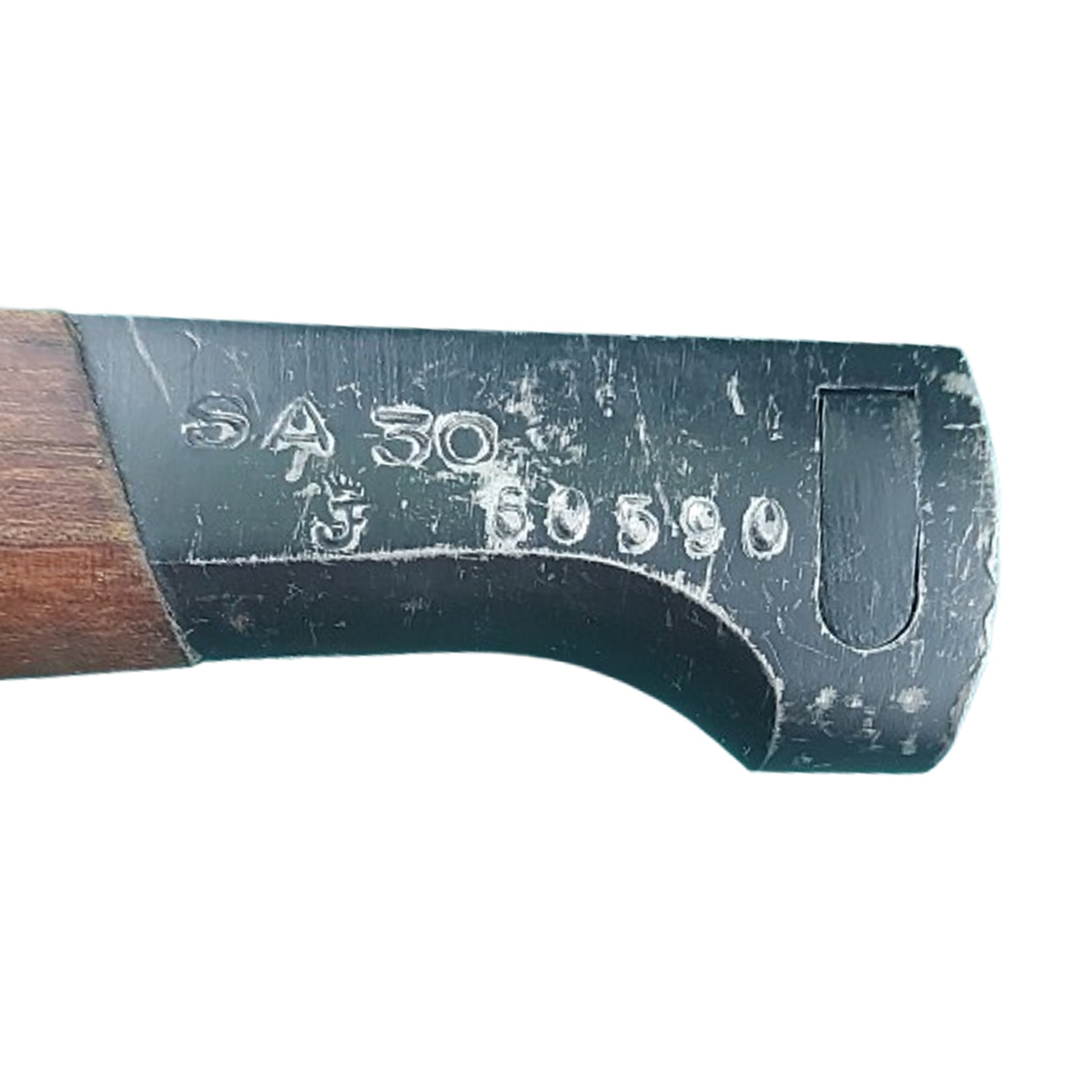 Measuring 14 1/2 inches in total length with a double edged 9 inch parkerized finish blade. 2 piece wood grip panels with functioning release button. Number stamped to the pommel with a single proof mark and SA30. Complete with the numbers matching steel field scabbard. SKU: 62819