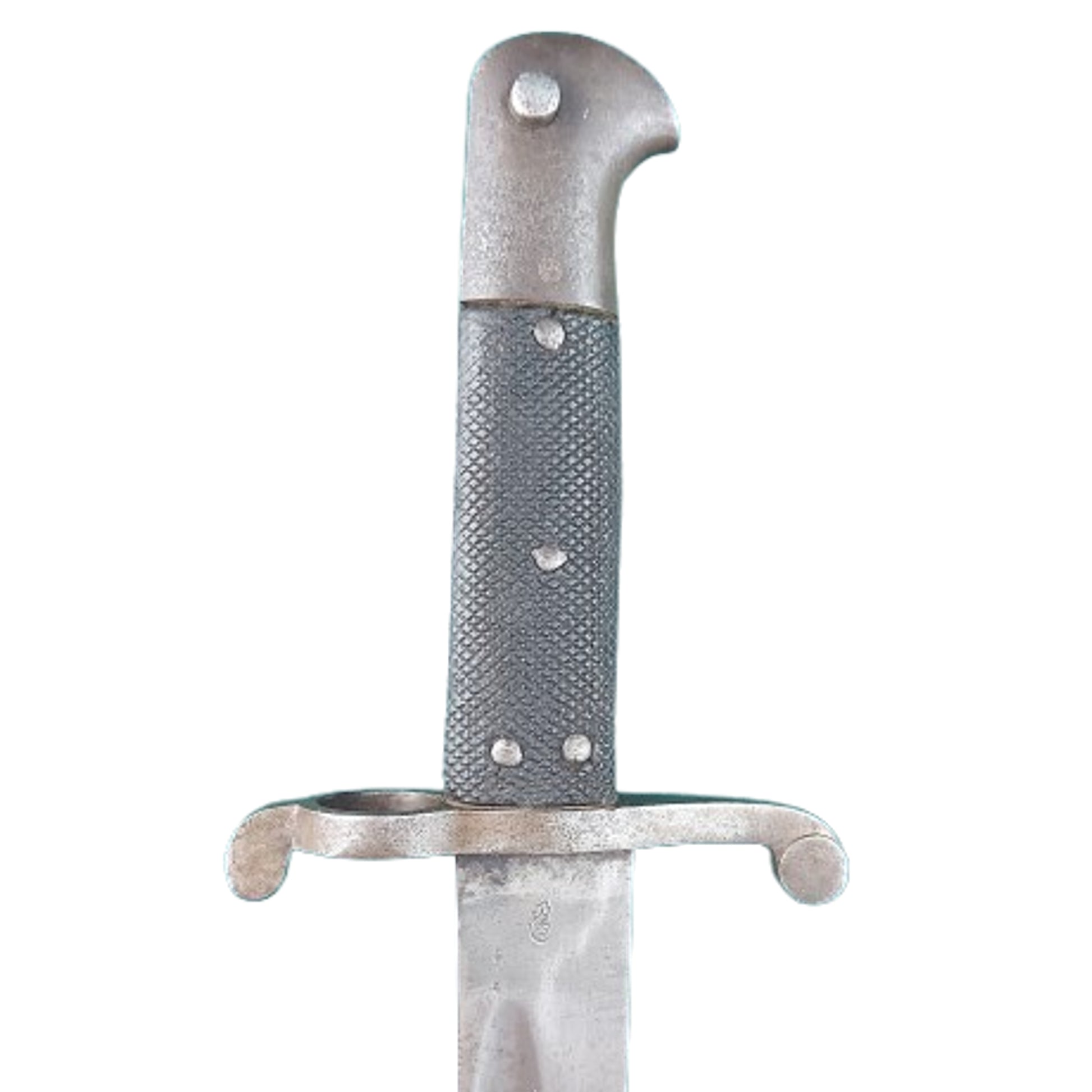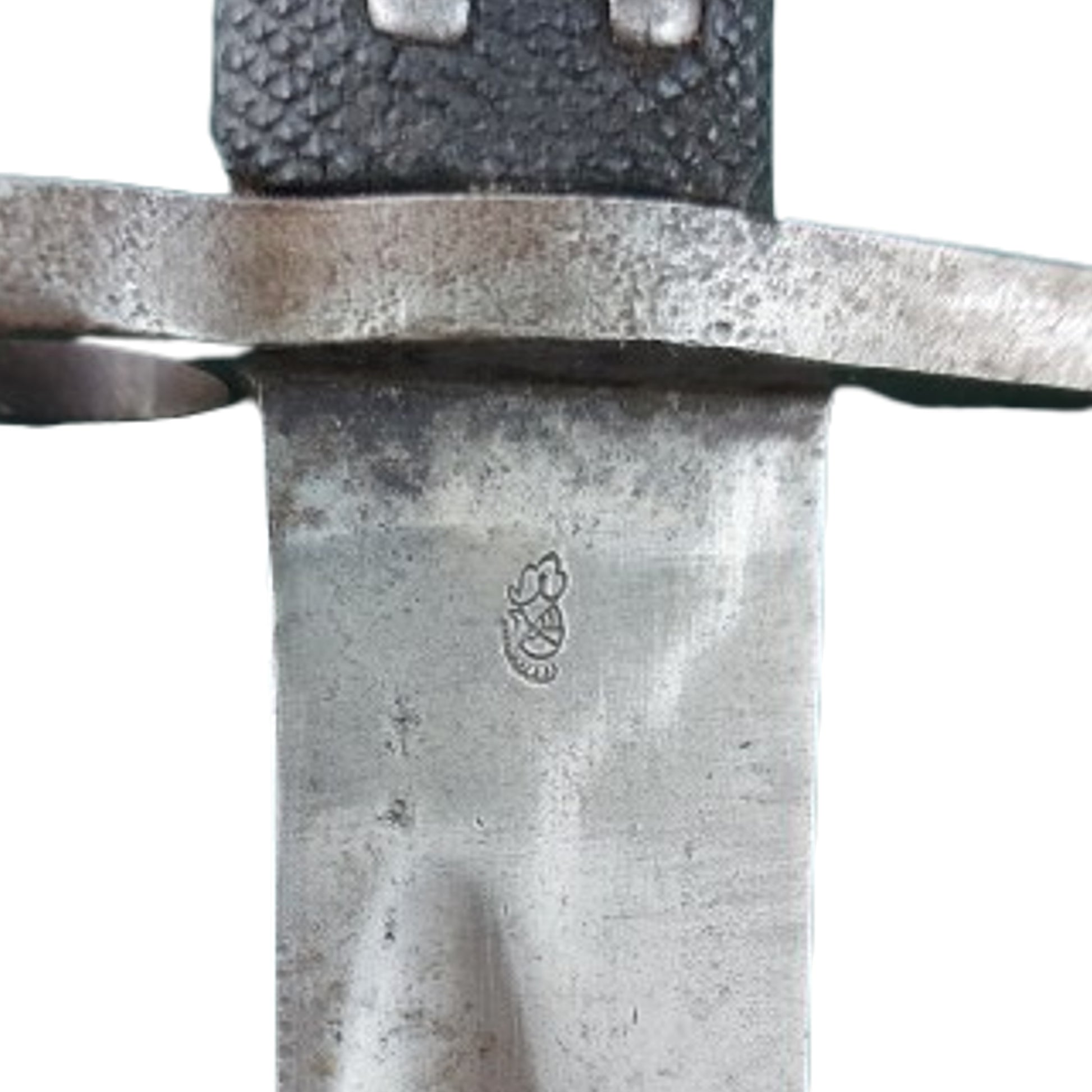 For use with the Enfield Pattern 1853 two band short rifle and later Snider Enfield conversions. Measures 28 inches overall with a slightly curved, 22 3/4 inch fullered blade that is proof marked to one side of the blade with a British War Department stamp and British Broadarrow, and manufactures mark to the opposite side. 2 piece checkered grip panels with a functioning release button in place. Stamped to the steel cross guard with the number 16. With the leather and steel field scabbard that is missing the stitching to the back of the scabbard. Still displays very well. SKU: 62977