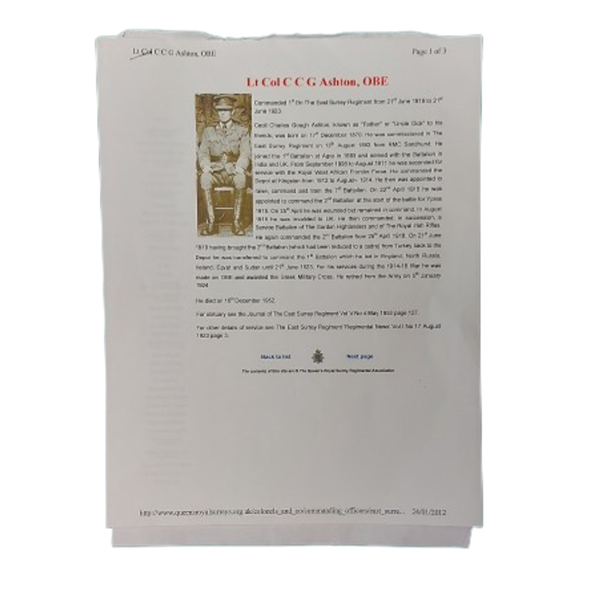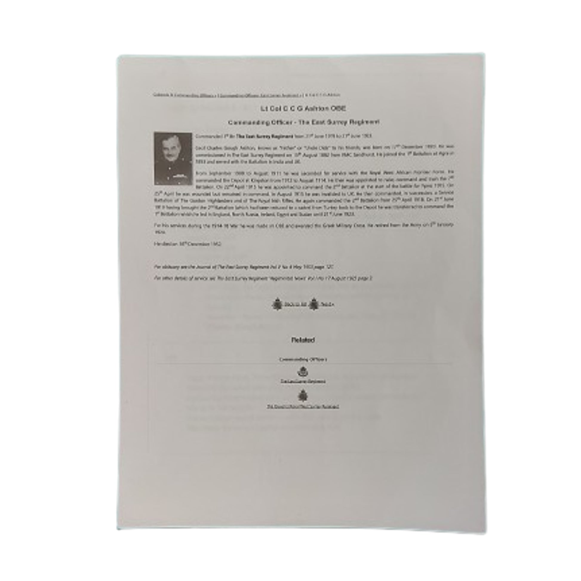 Lt Col C C G Ashton, OBE, Commanding Officer - The East Surrey Regiment Commanded the 1st Battalion, The East Surrey Regiment from June 21,1919, to June 21, 1923.