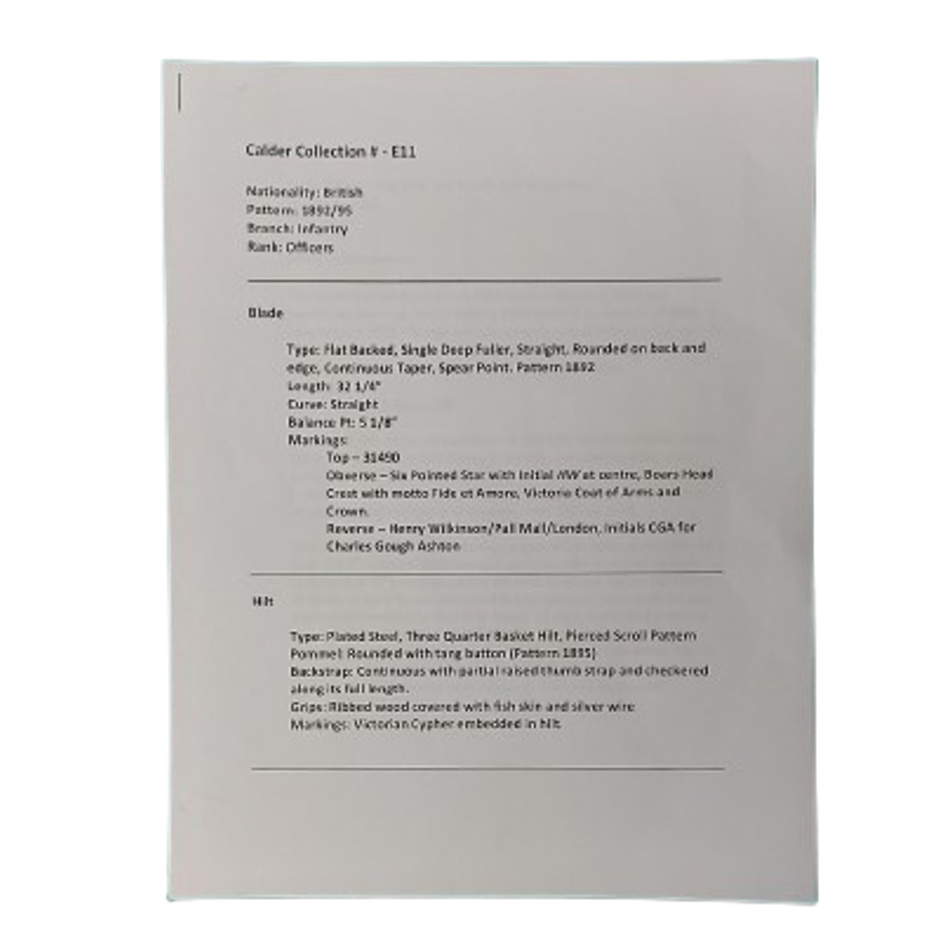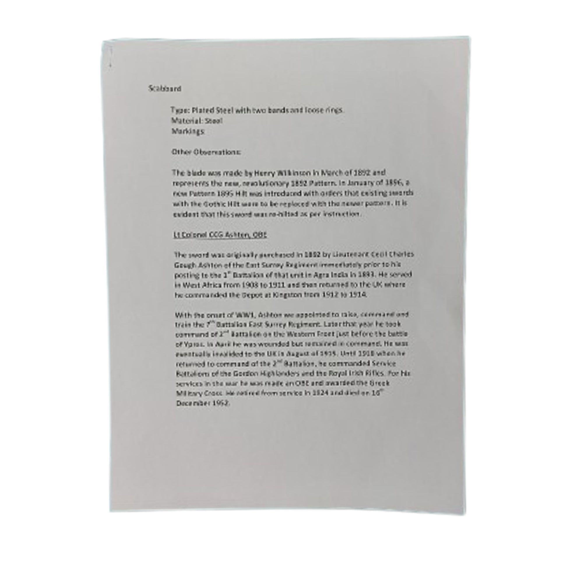 1892 Pattern sword, re-hilted with the 1895 pattern hilt. In January of 1896, a new Pattern 1895 hilt was introduced, with orders that existing swords with the 1892 hilt were to be replaced with the newer pattern. The sword was originally purchased in 1892 by Lieutenant (Later Lt. Col. OBE) Charles Gough Ashton of The East Surrey Regiment prior to his posting to the 1st Battalion of that unit in Arga India in 1893, where he carried this sword.