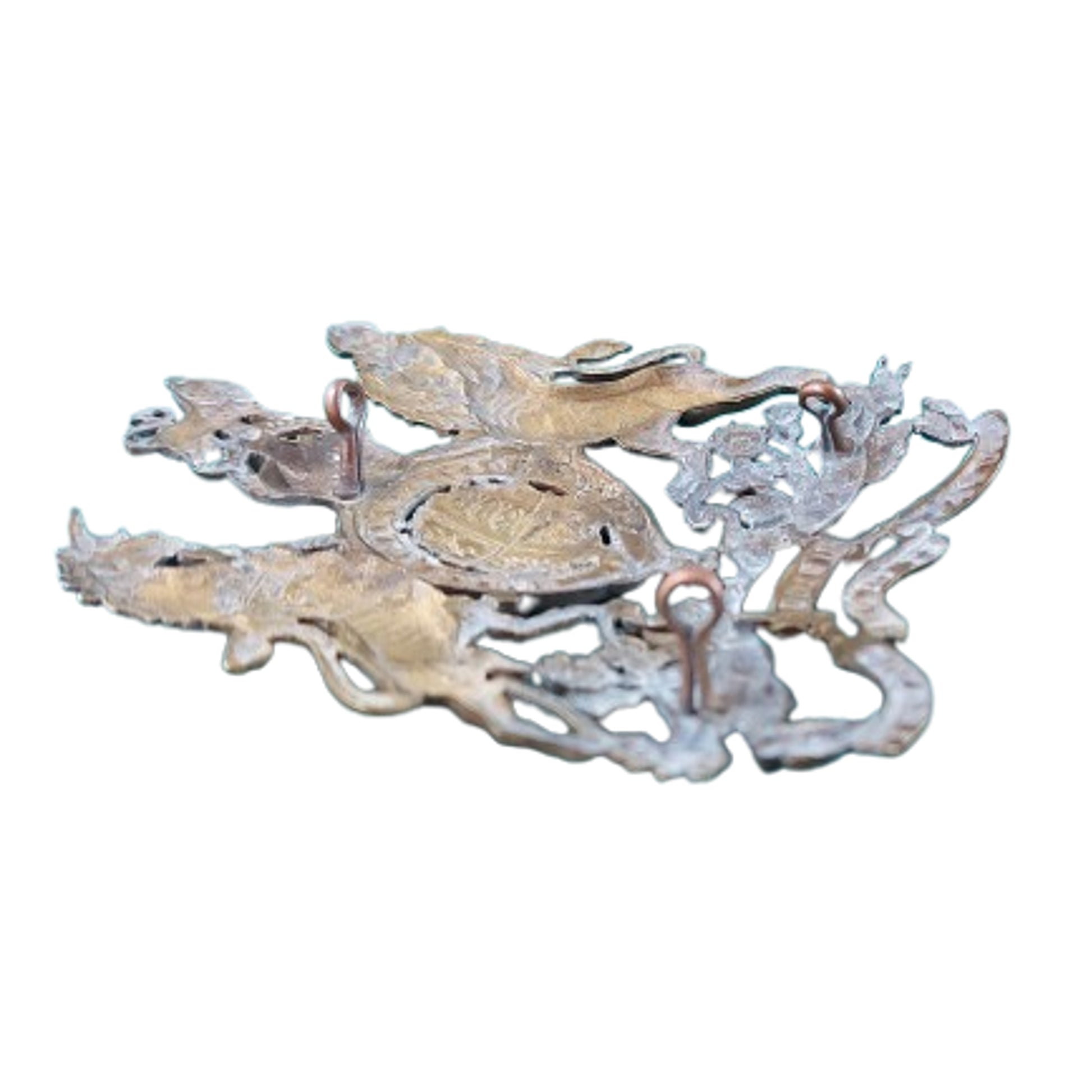 Post-1902 British Royal Engineers Helmet Plate. Brass with all 3 mounting lugs in place to the reverse. Measures 3 1/4 by 3 1/2 inches. SKU: 63230