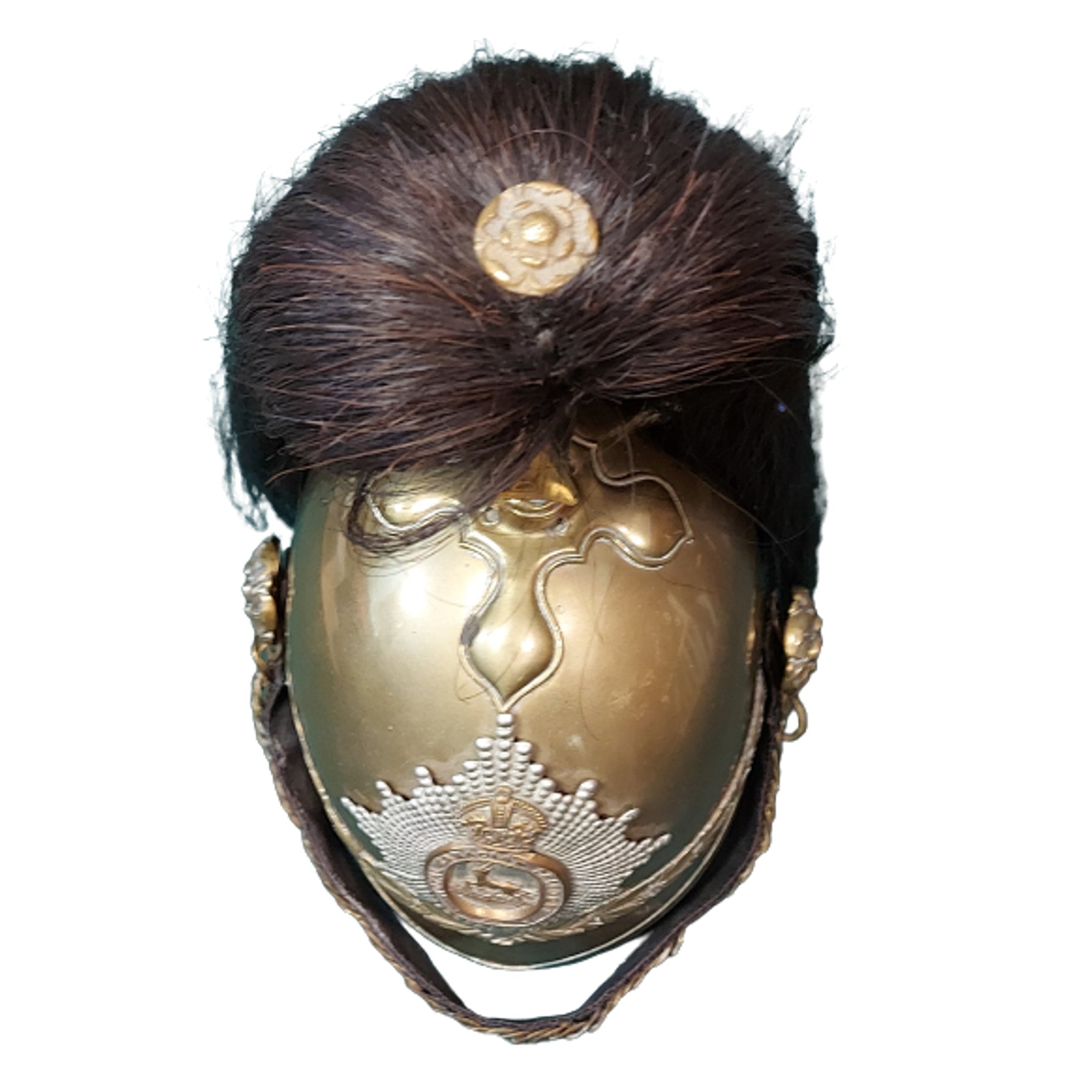 Brass parade helmet with bi-metal 2 piece RCD helmet plate to the front. Lobster tail brass on leather  chinstrap in place with black horsehair to the top and leather liner to the interior. SKU: 58913