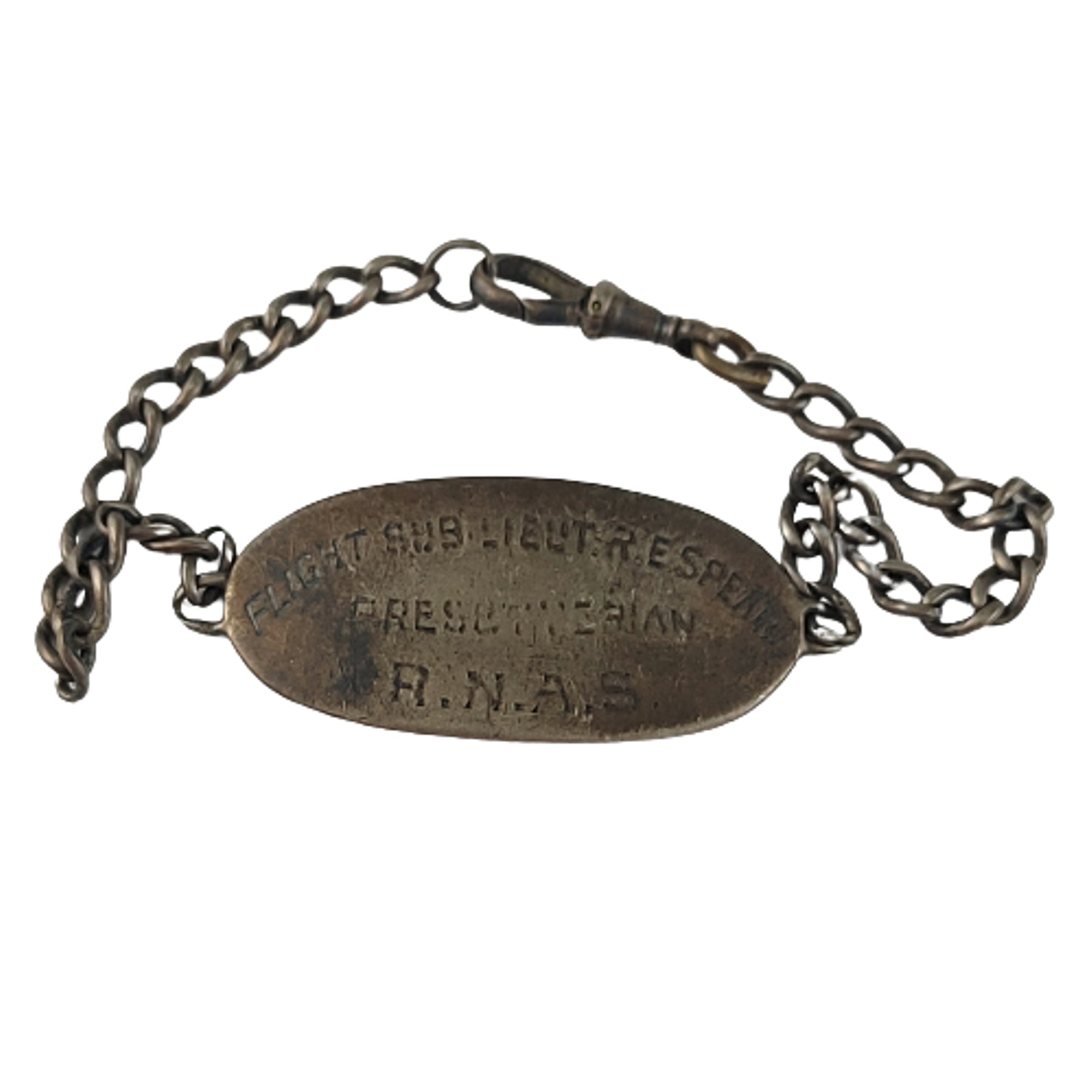 Name engraved to Flight Sub-Lieut. R.E. Spear, R.N.A.S. Sterling silver hallmarked to the reverse with wrist chain and catch.