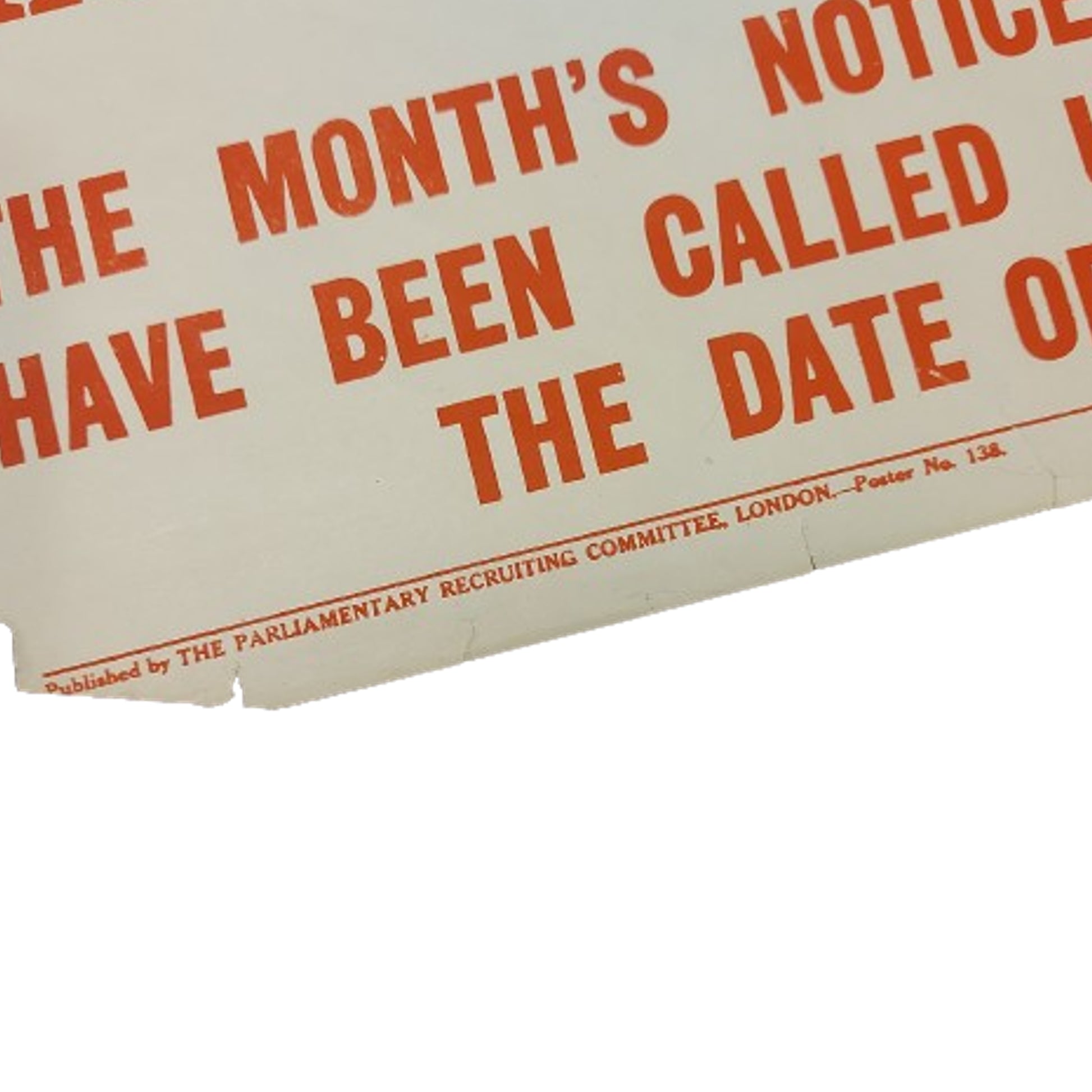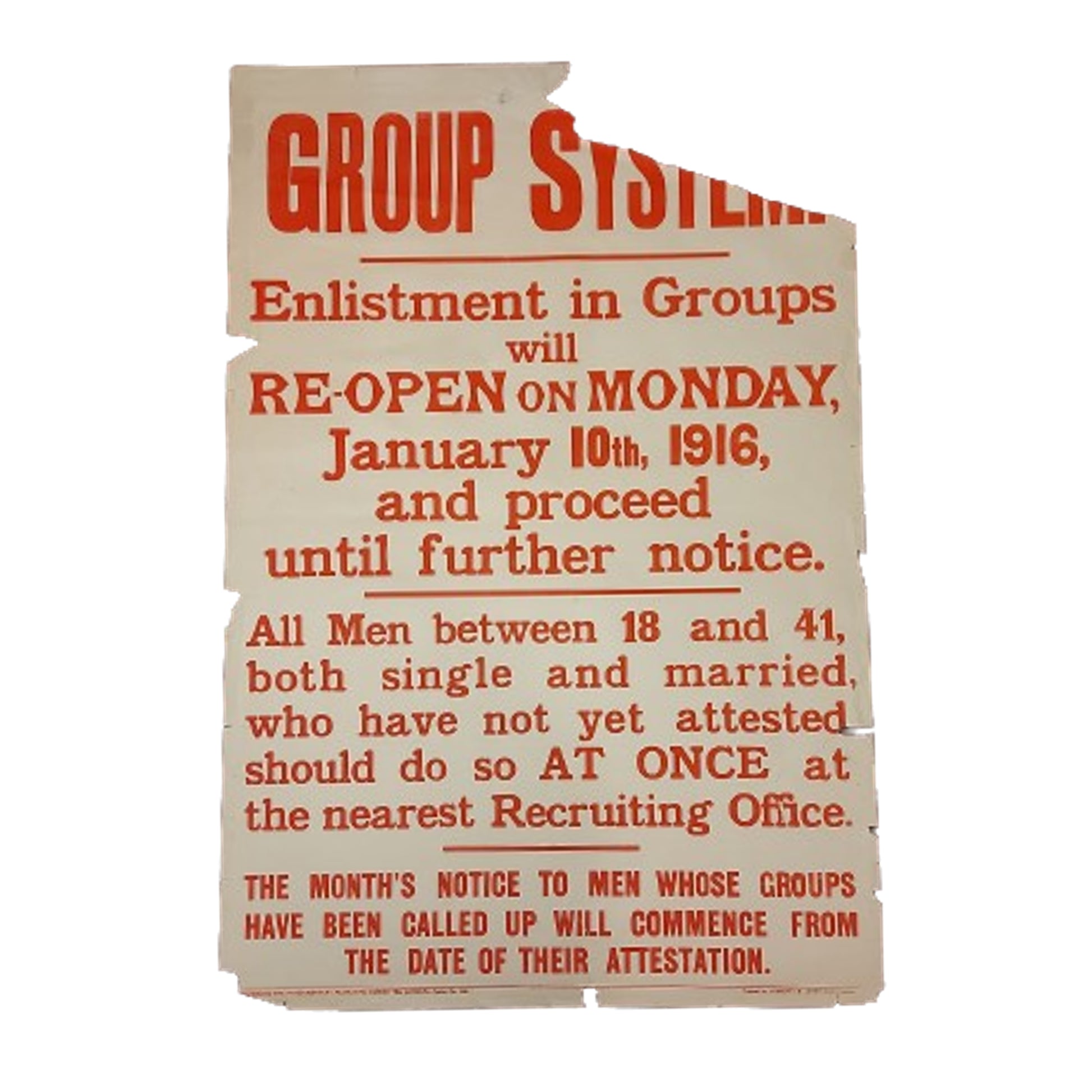 Original WW1 poster calling for enlistments in groups and dated January 10, 1916. Measures 20 by 29 1/2 inches. Printer marked to the lower edge. Large tear to the top corner with some small tears to the outer edges. SKU: 61784