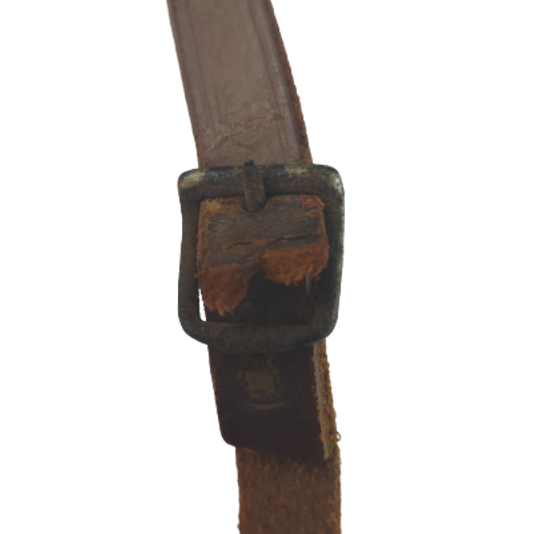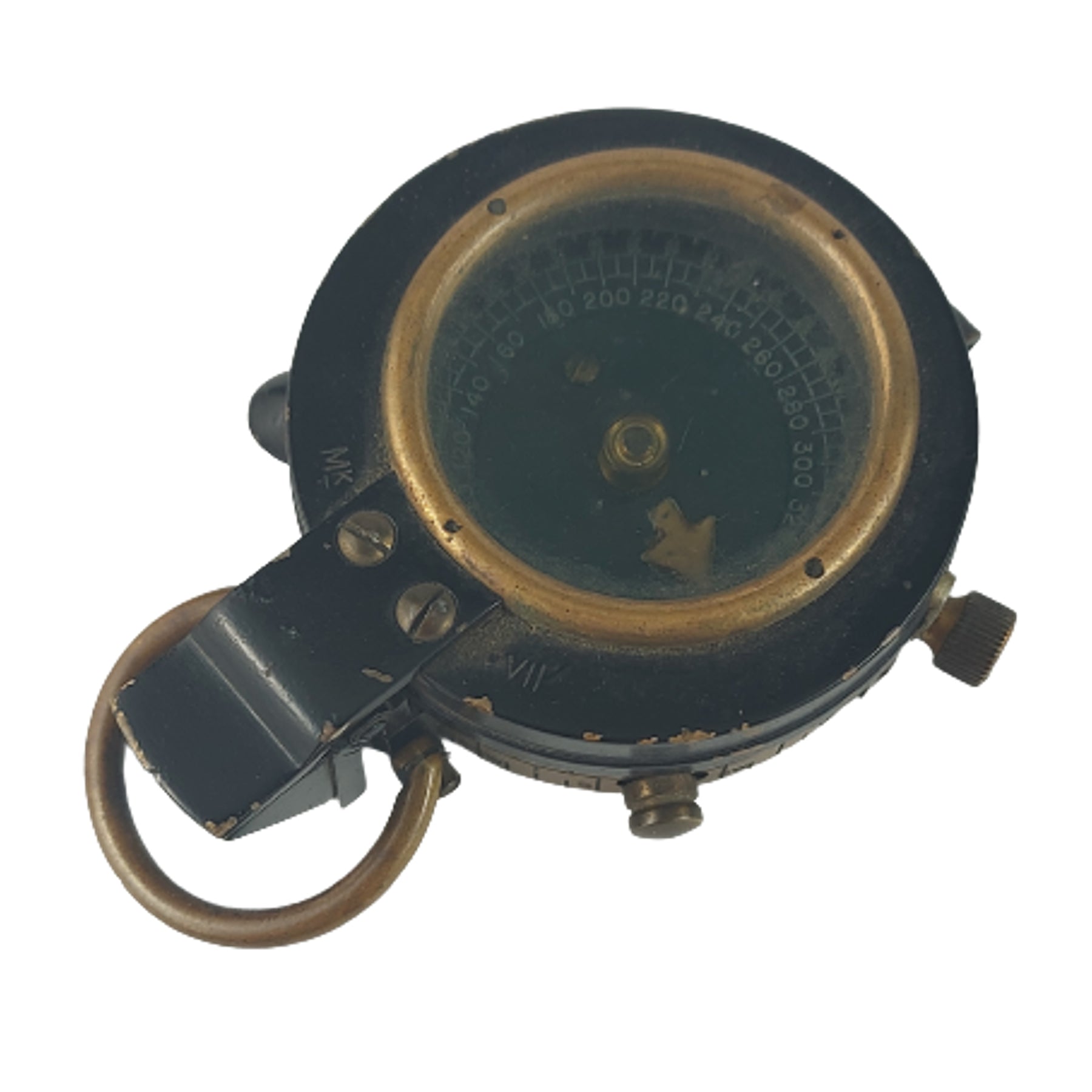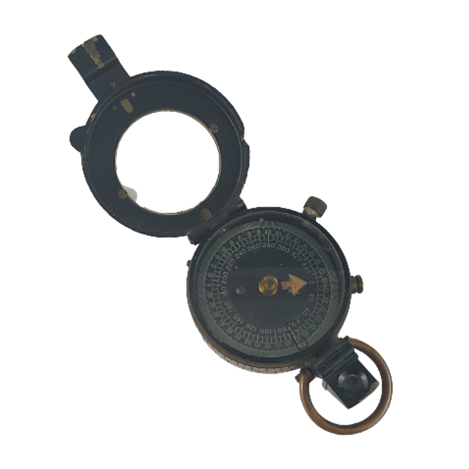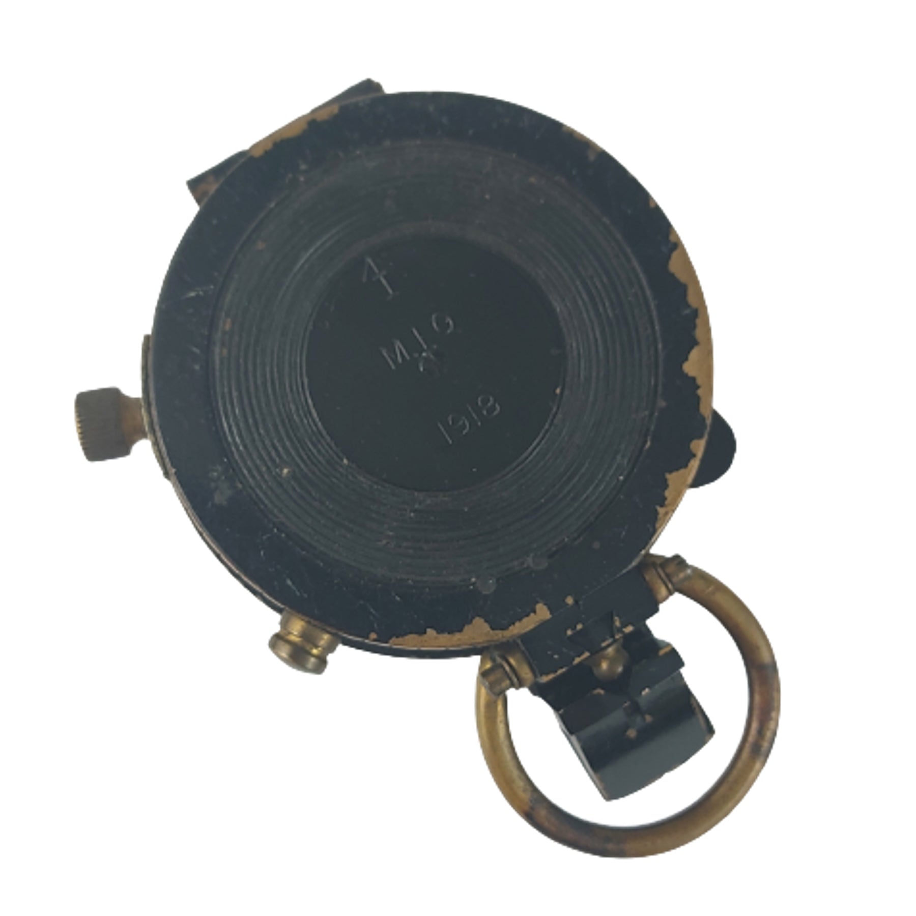 Blackened brass field compass maker marked to the reverse and dated 1918 with a British Broadarrow. Contained in a leather carrier with adjustable strap. British Broadarrow marked to the front of the case. No fluid present to the compass. SKU: 58785