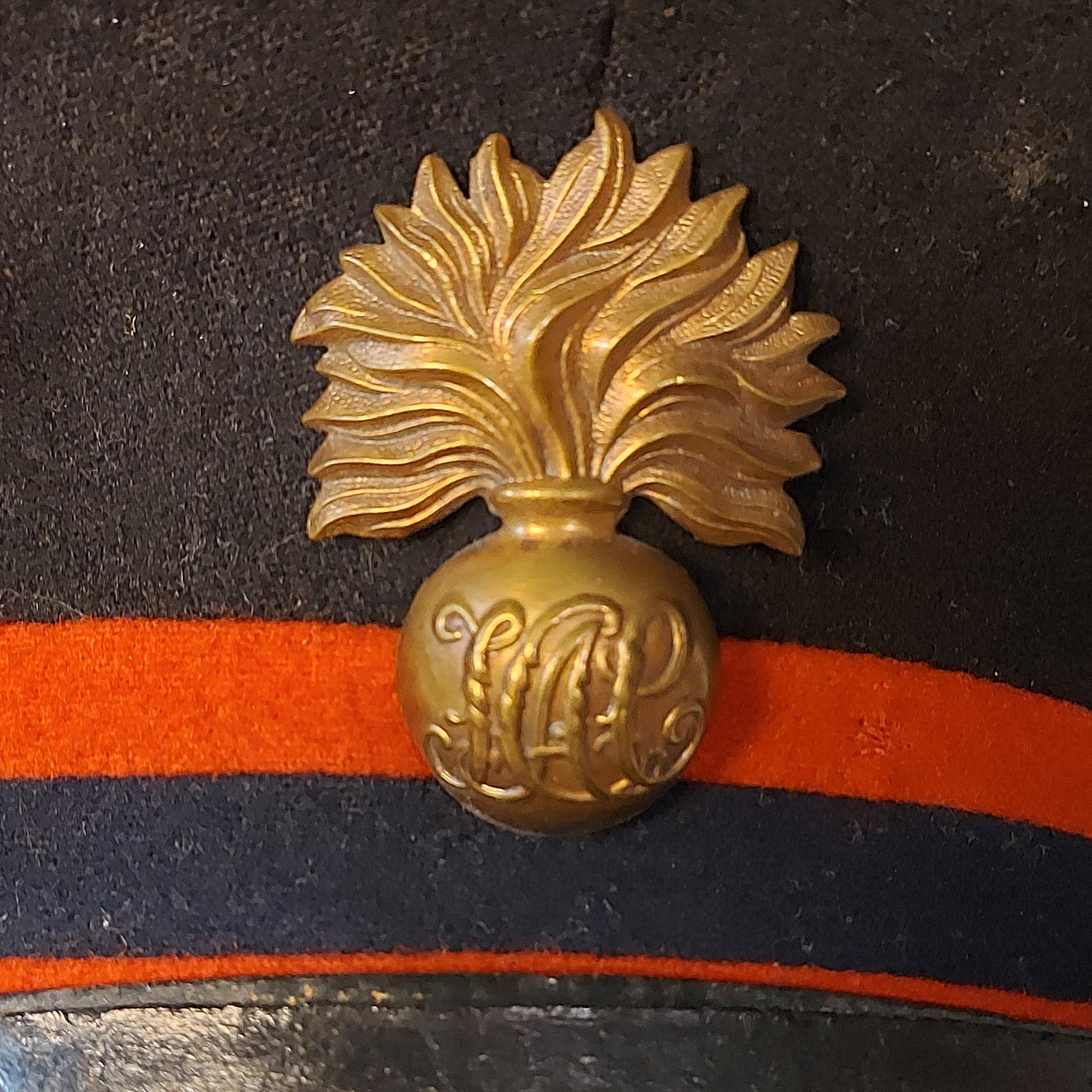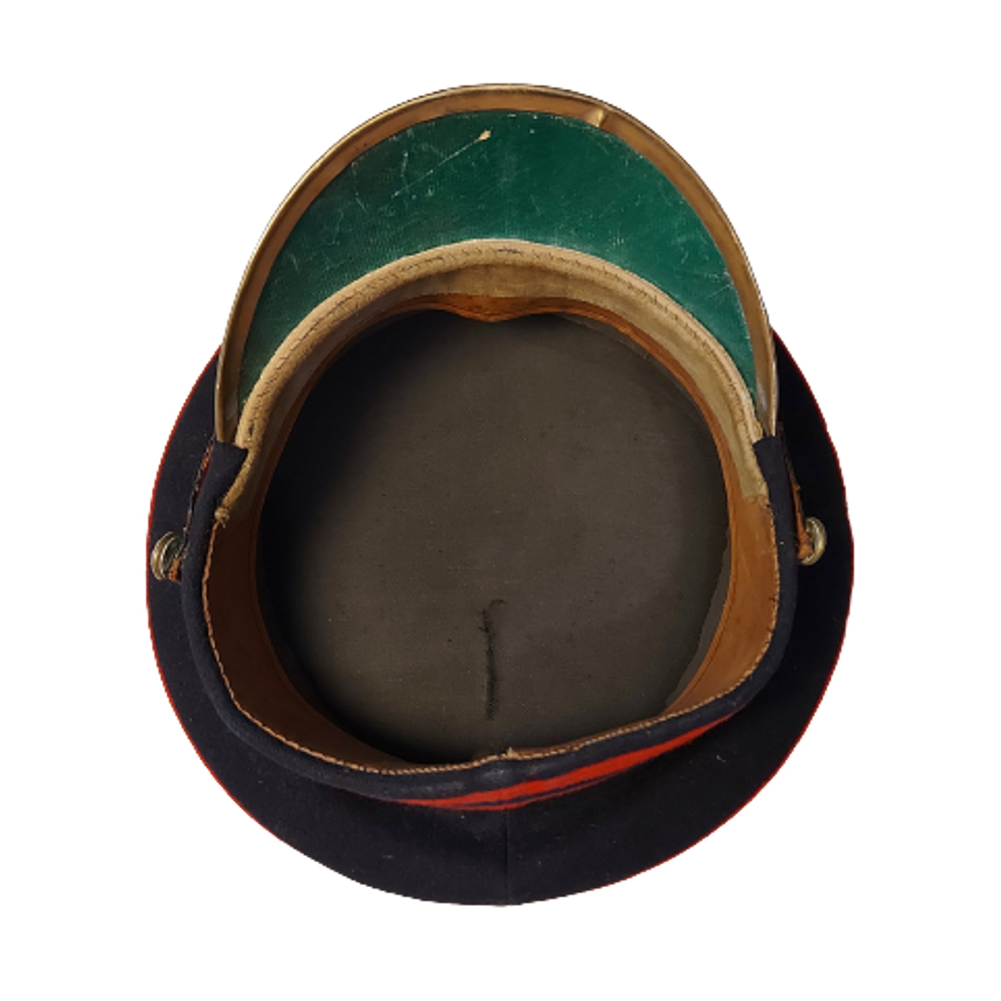 Wool construction with a leather chinstrap and 2 small brass side buttons and a leather brim with a brass band to the front edge. Leather sweatband to the interior and the issue brass badge to the front. SKU: 60223