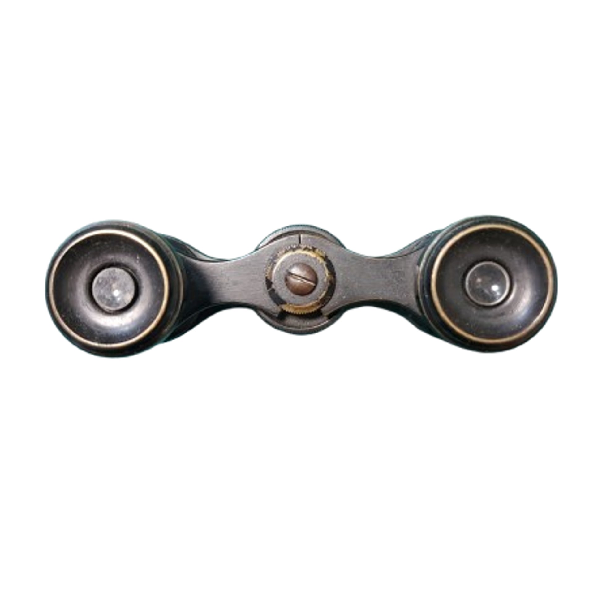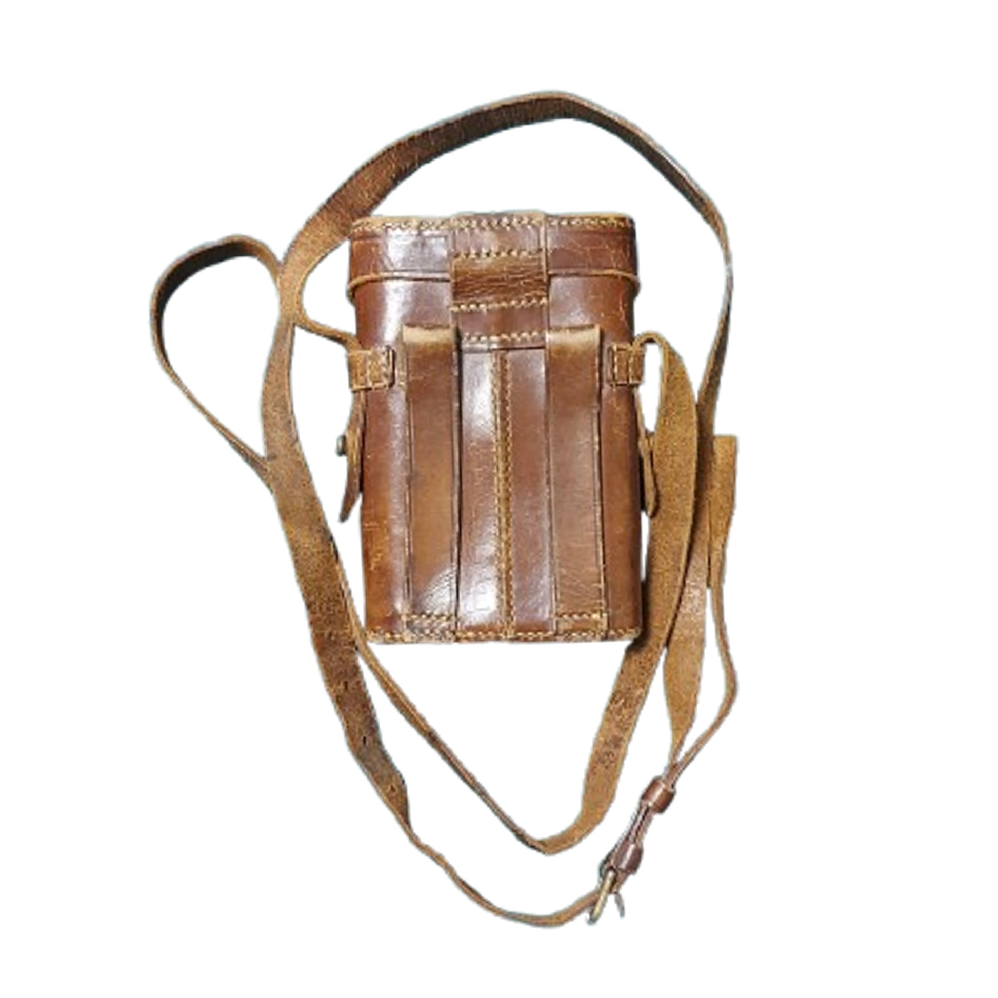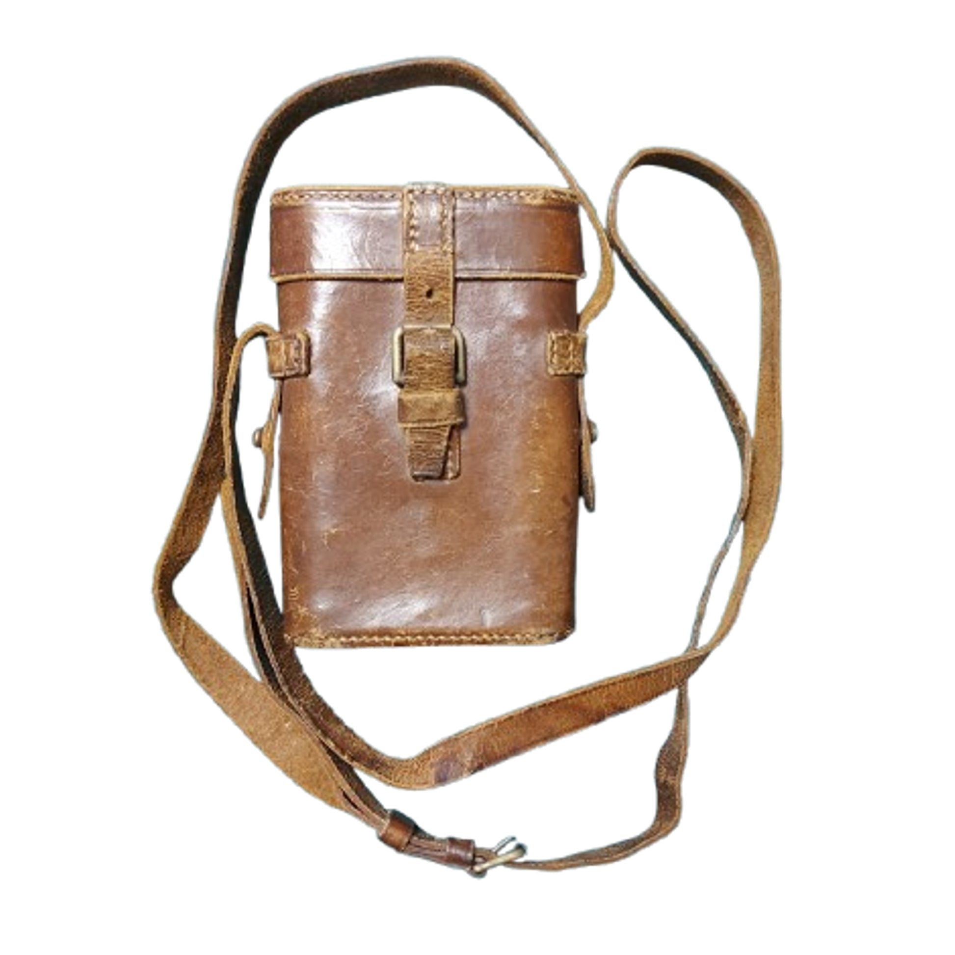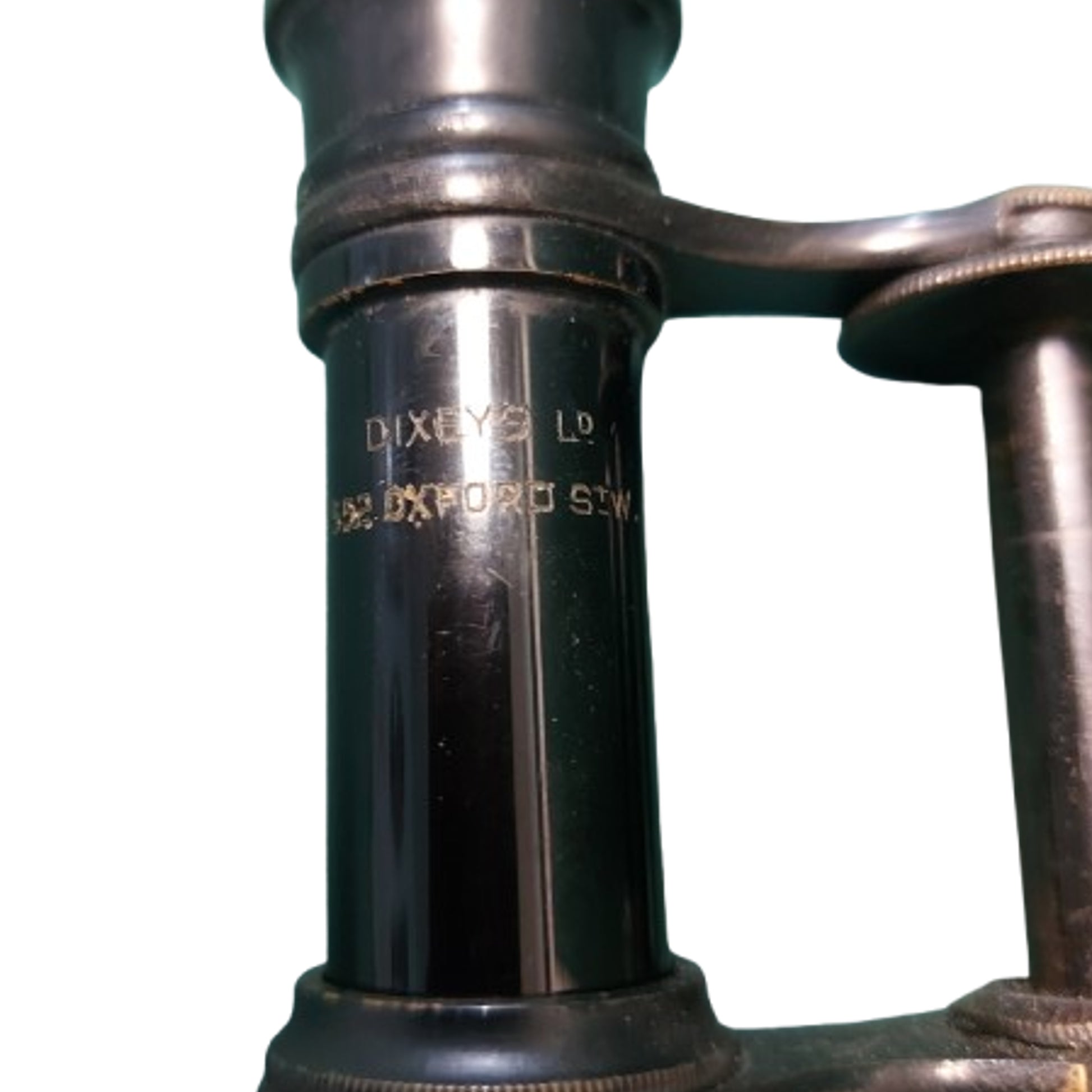 A small pair of private purchase WW1 British Officer's field binoculars measuring 5 1/2 by 3 3/4 inches in the closed position. Manufacture marked "Dixeys Ltd. 552 Oxfords St. W". to the one side, And Brighton" to the opposite side. Blacken brass with leather wrapping. The binoculars are contained in a leather field case with 2 leather belt loops to the reverse and an adjustable leather carry strap with a brass roller buckle. The bottom of the case is hand inscribed "CAPT. B. WESTBURY". with his regiment below this that is very difficult to decipher. The adjustment on the binoculars is not workings and the optics are very cloudy with no clarity, but still display well. SKU: 63415