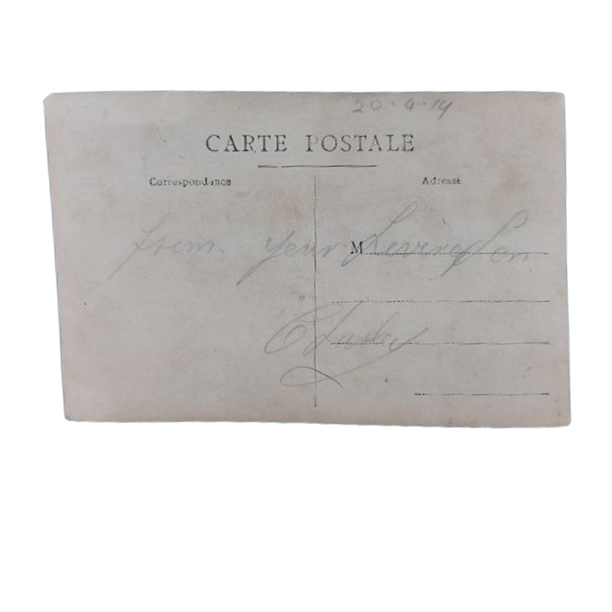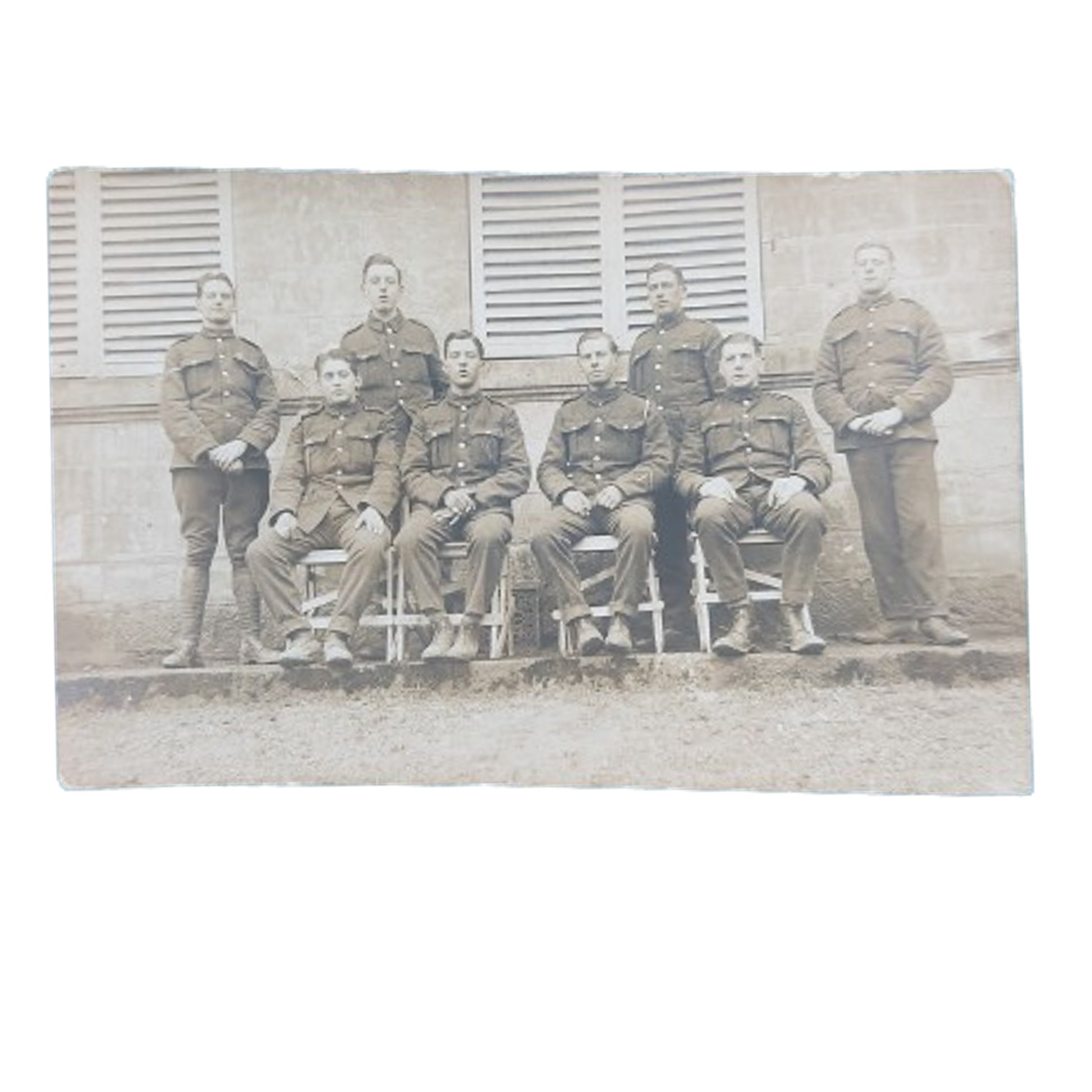 Black and white picture post card showing a group of enlisted men in uniform posing at a barracks building. Hand written dating of 1914 to the reverse. SKU: 61705