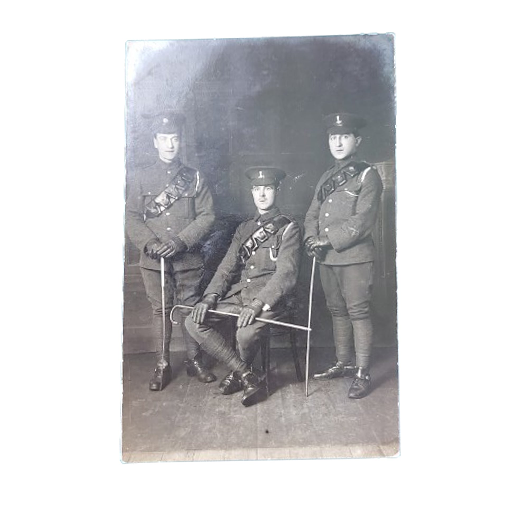 Black and white picture postcard showing 3 soldiers in uniform with leather bandoliers and visor caps with badges in view. SKU: 62051