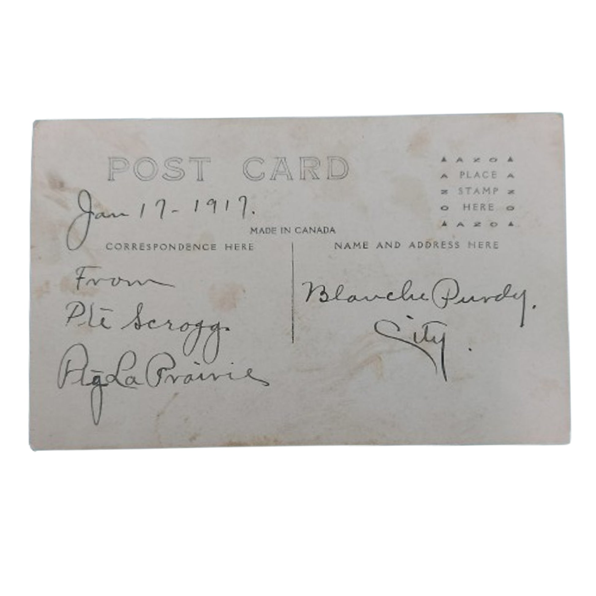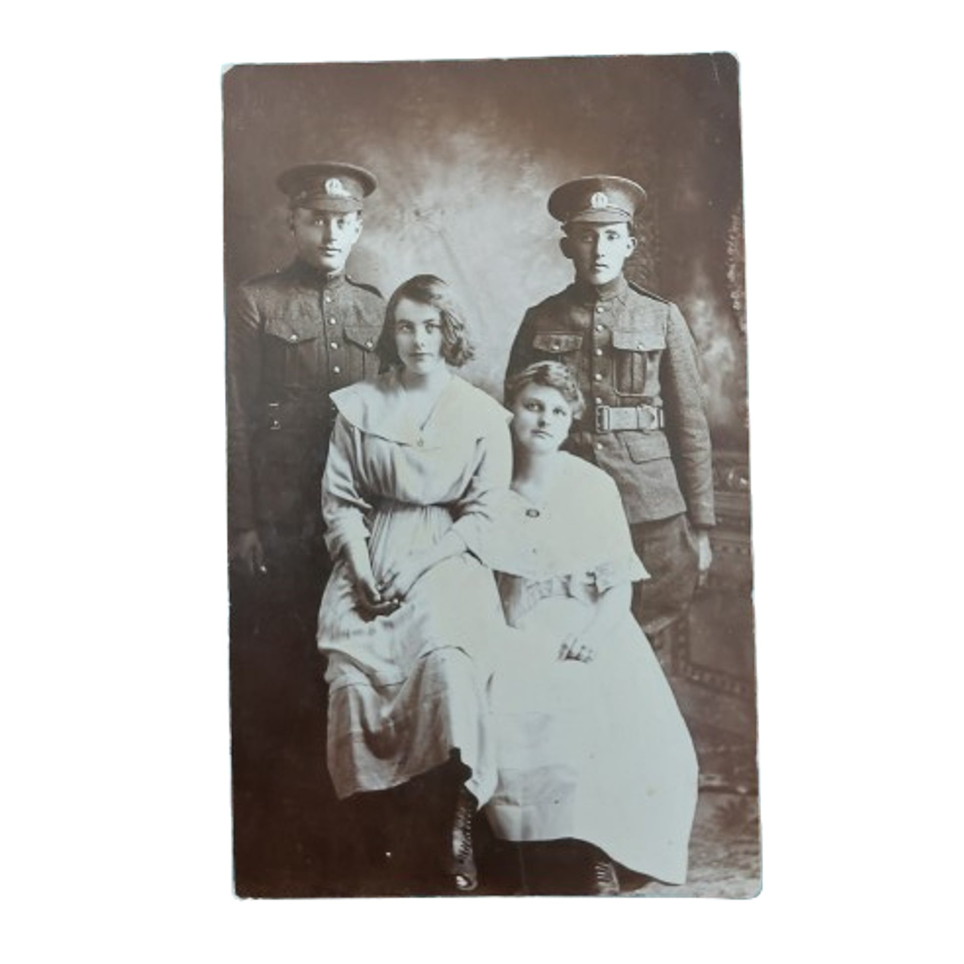 Black and white studio picture postcard showing 2 British soldiers in uniform with waist belts and visor caps with their wives or sisters. Badges are visible in the photo. Hand written period applied naming the reverse and dated 1917. SKU: 61805