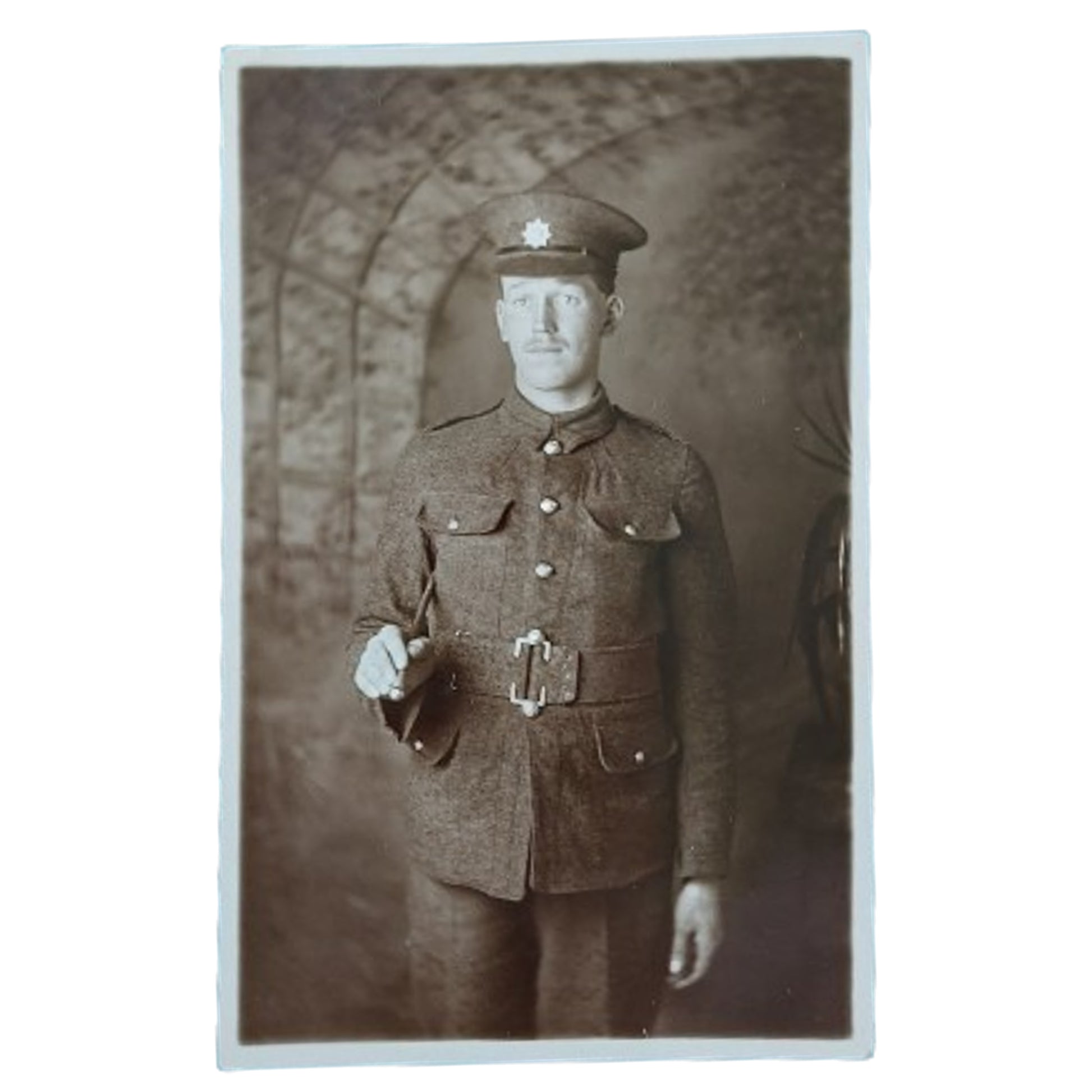 Black and white picture postcard showing a Devonshire Regiment soldier in uniform with visor cap and badge. SKU: 62052