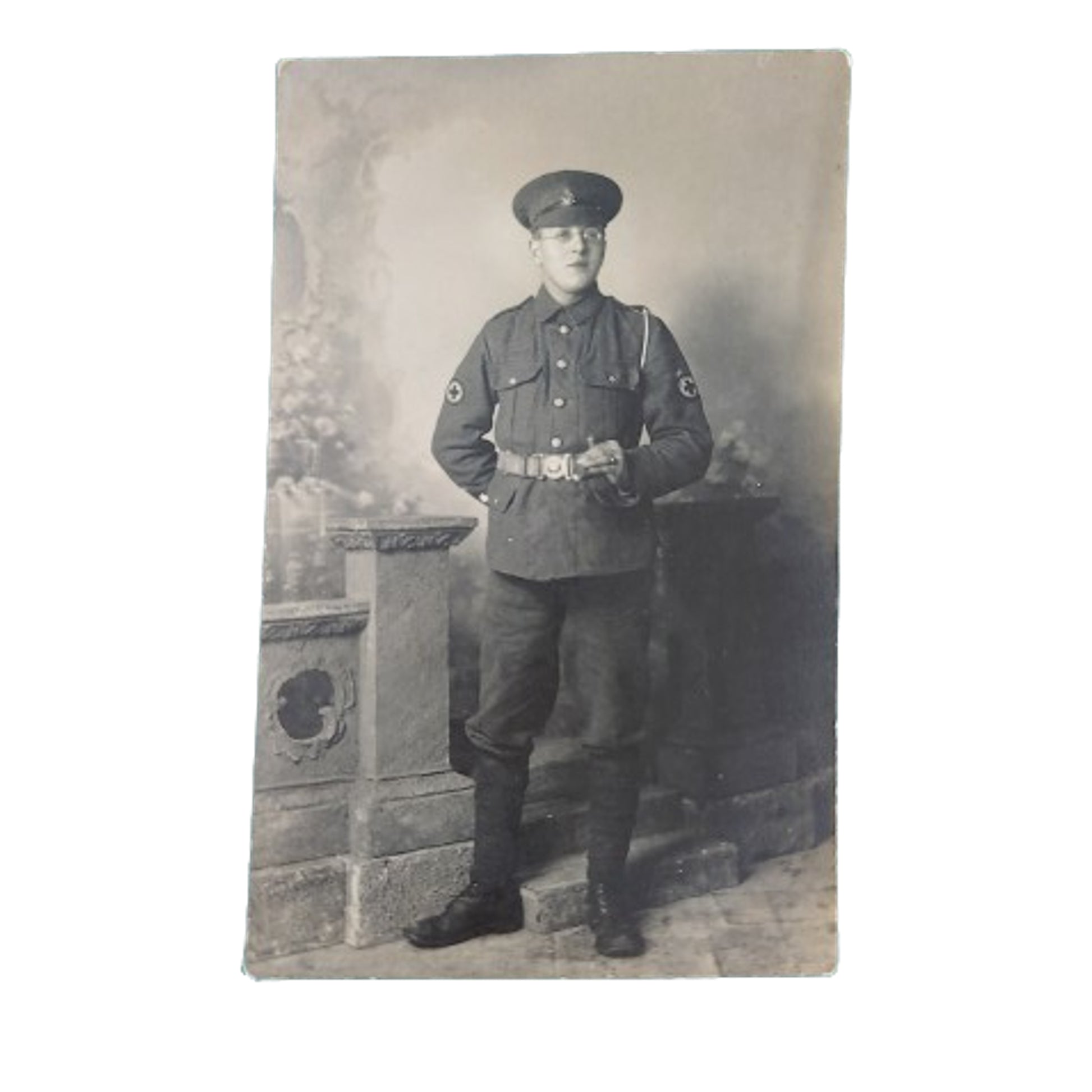 Black and white studio picture postcard showing a Medical Corps soldier in uniform with visor cap and waist belt. SKU: 61511