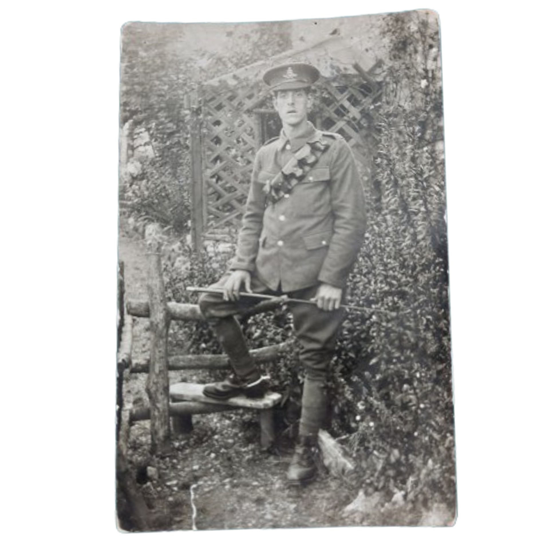 Black and white WW1 picture postcard showing studio portrait of a Royal Artillery soldier in uniform with service cap and leather bandolier. Maker marked to the reverse. SKU: 61311