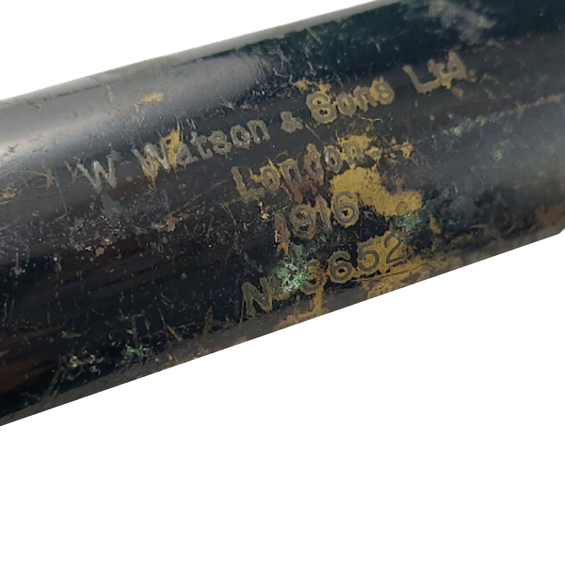 Blackened brass construction measuring 17 inches in total length with a sliding sun shade to the end. Adjustable eye piece, and marked W. Watson & Son Ltd. London 1916, Sighting Tel. No.4 Mk.III with a British Broadarrow below. SKU: 60116