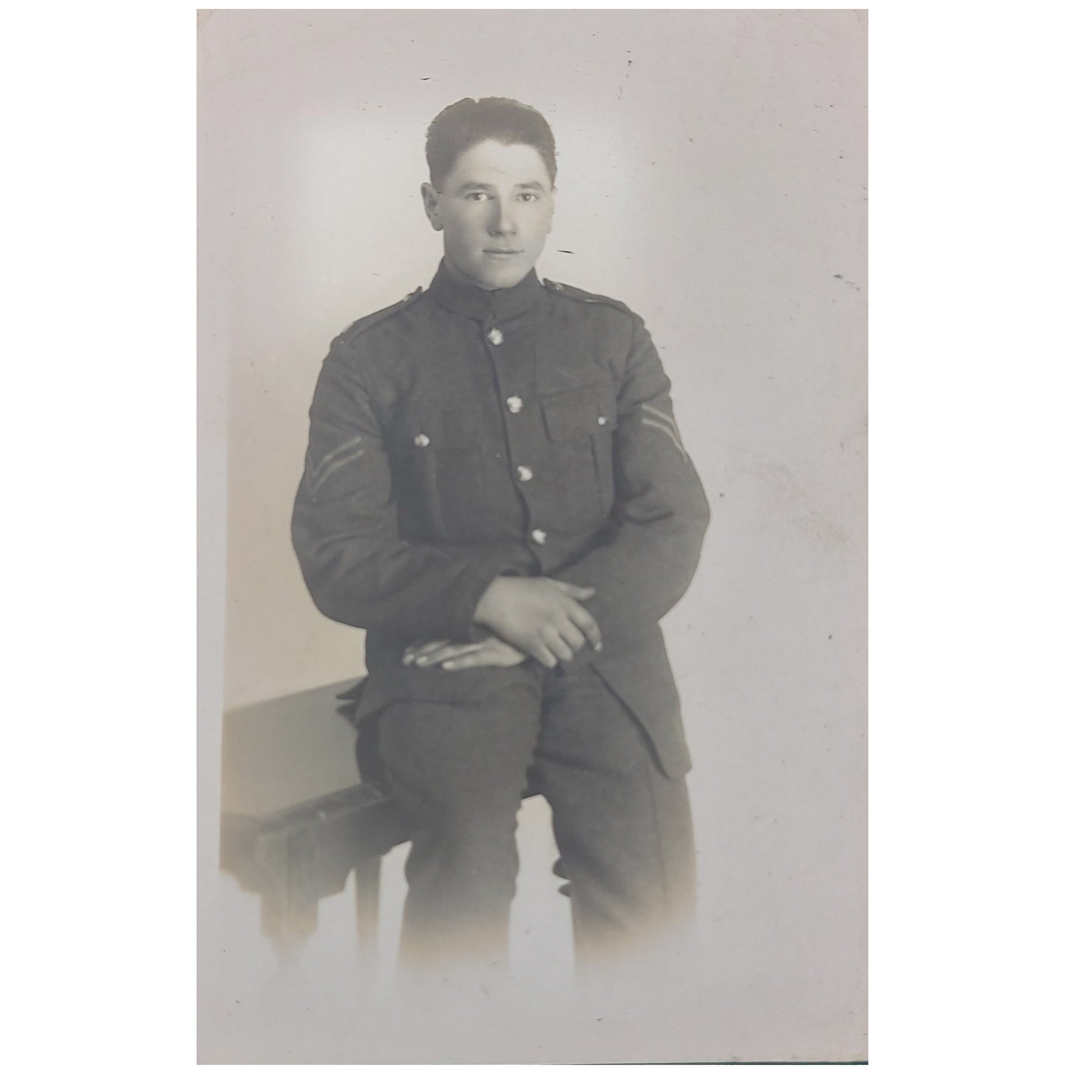 Black and white studio photo of a young WW1 British soldier in uniform. SKU: 60044