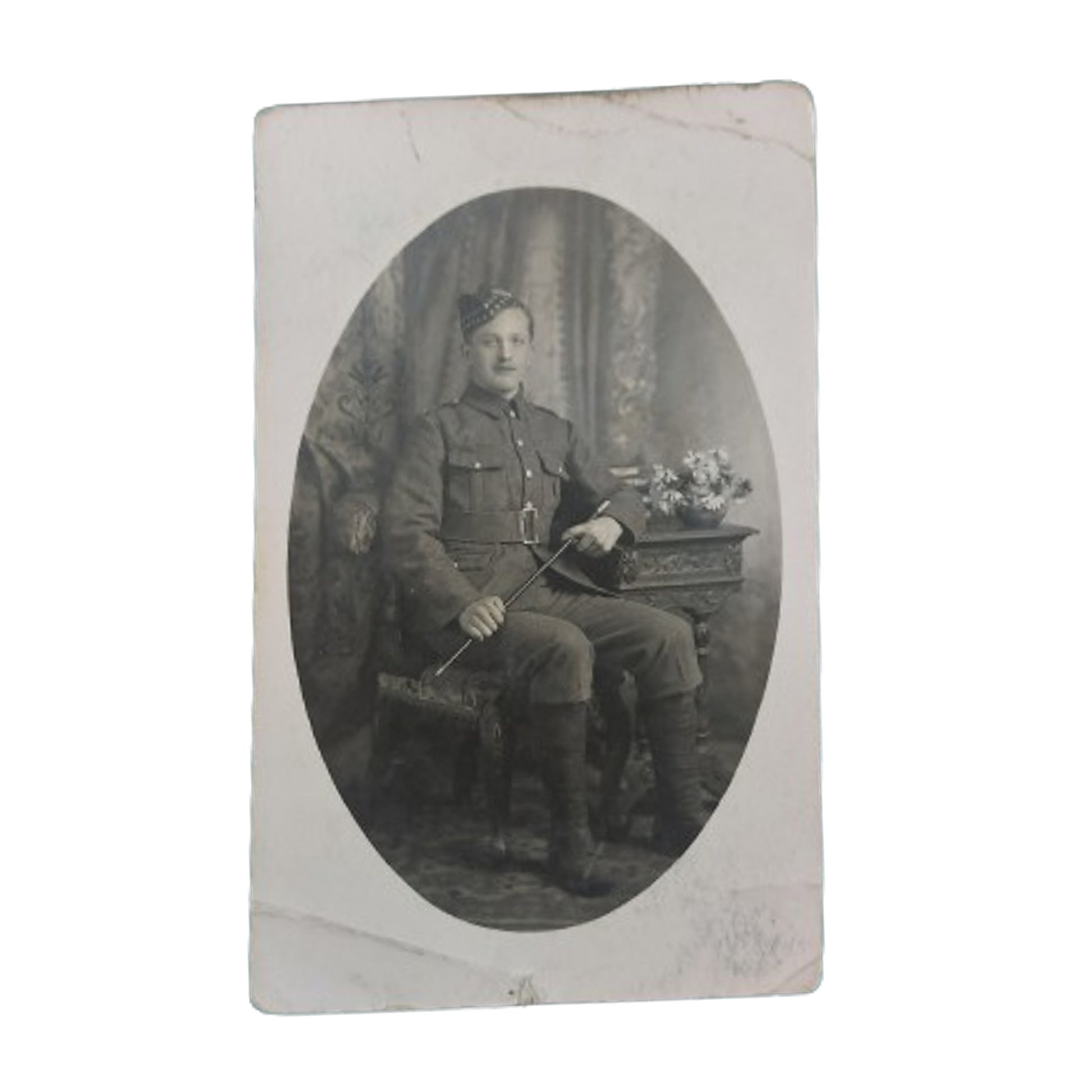 Black and white studio picture postcard showing a seated soldier in uniform with swagger stick and glengarry cap. SKU: 61680
