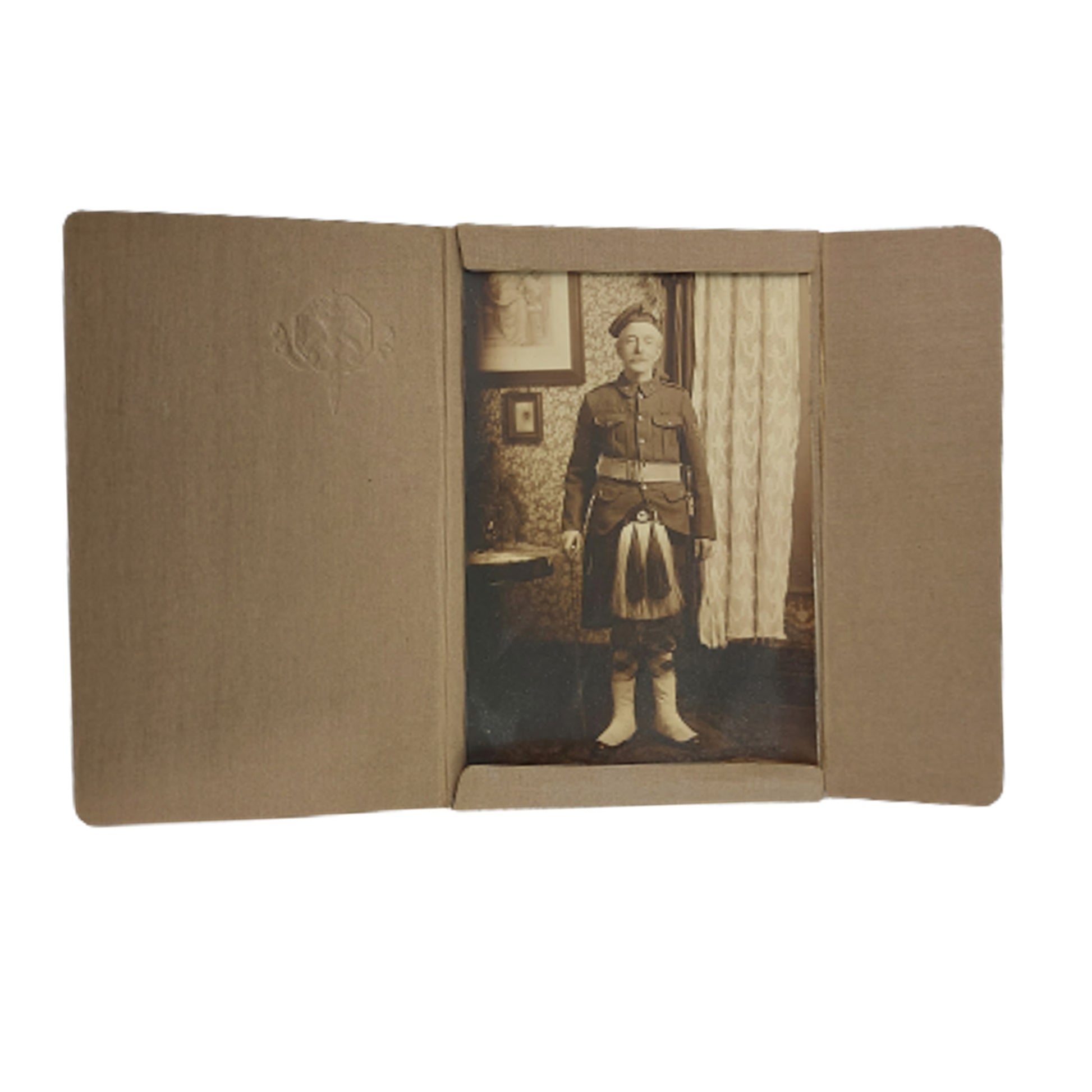 Black and white photograph measuring 3 3/4 by 6 inches in a 9 1/2 by 6 1/4 bi-fold heavy paper frame. Badge visible to the sporran.