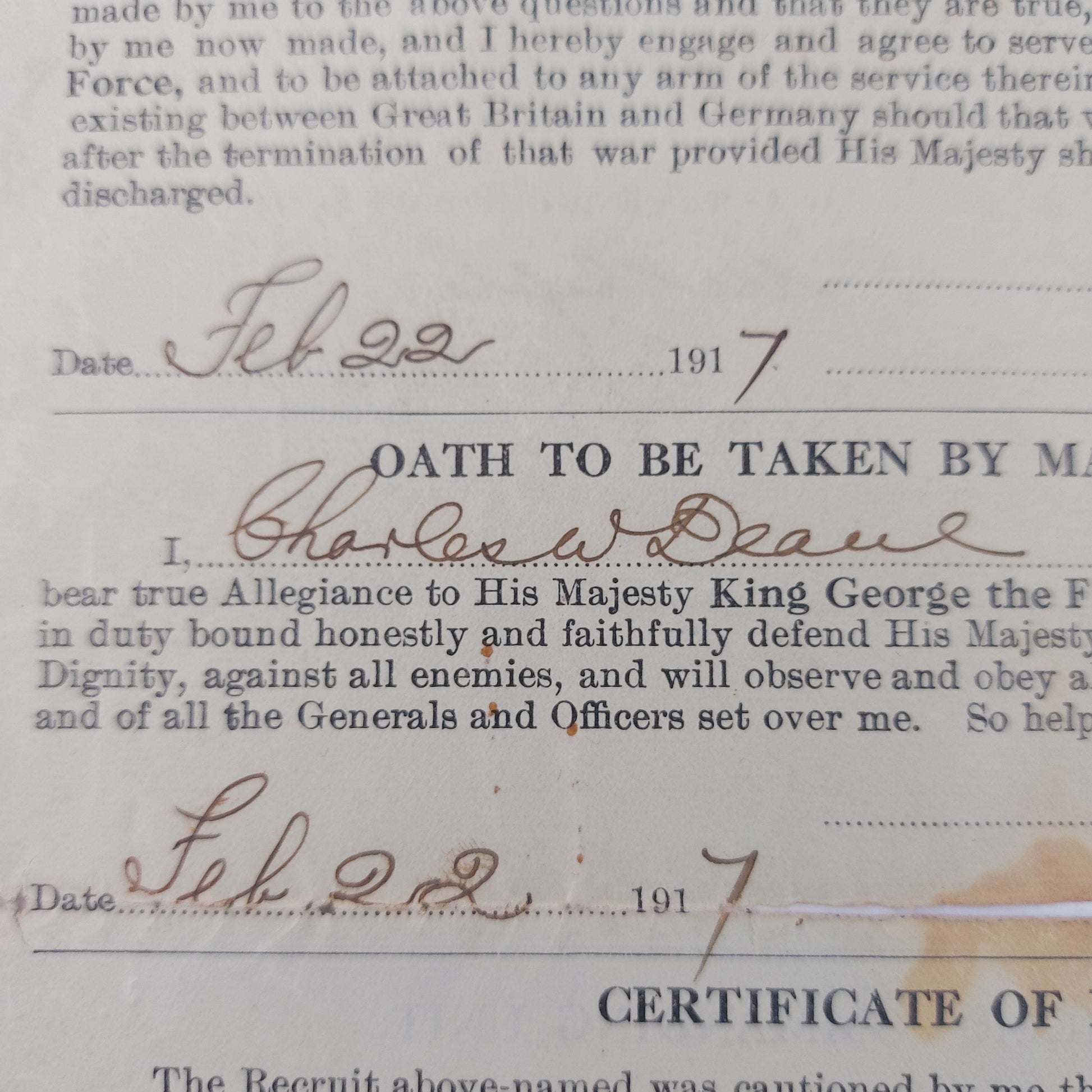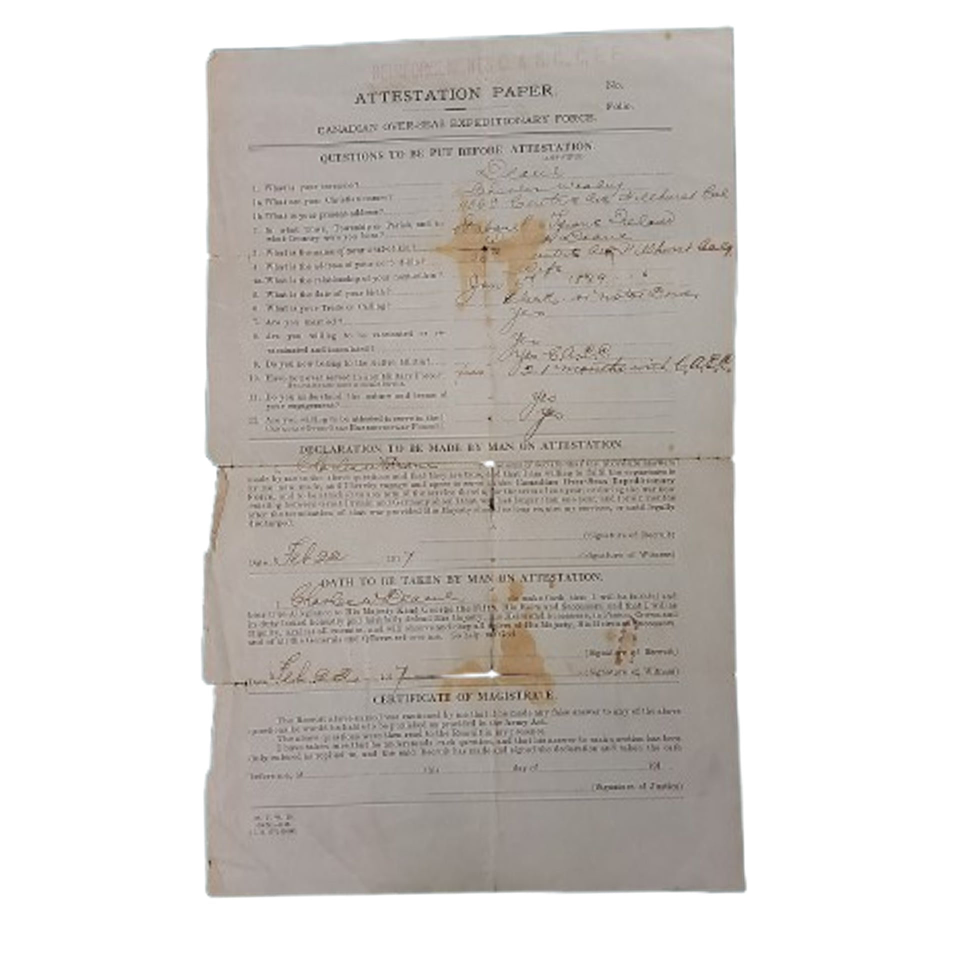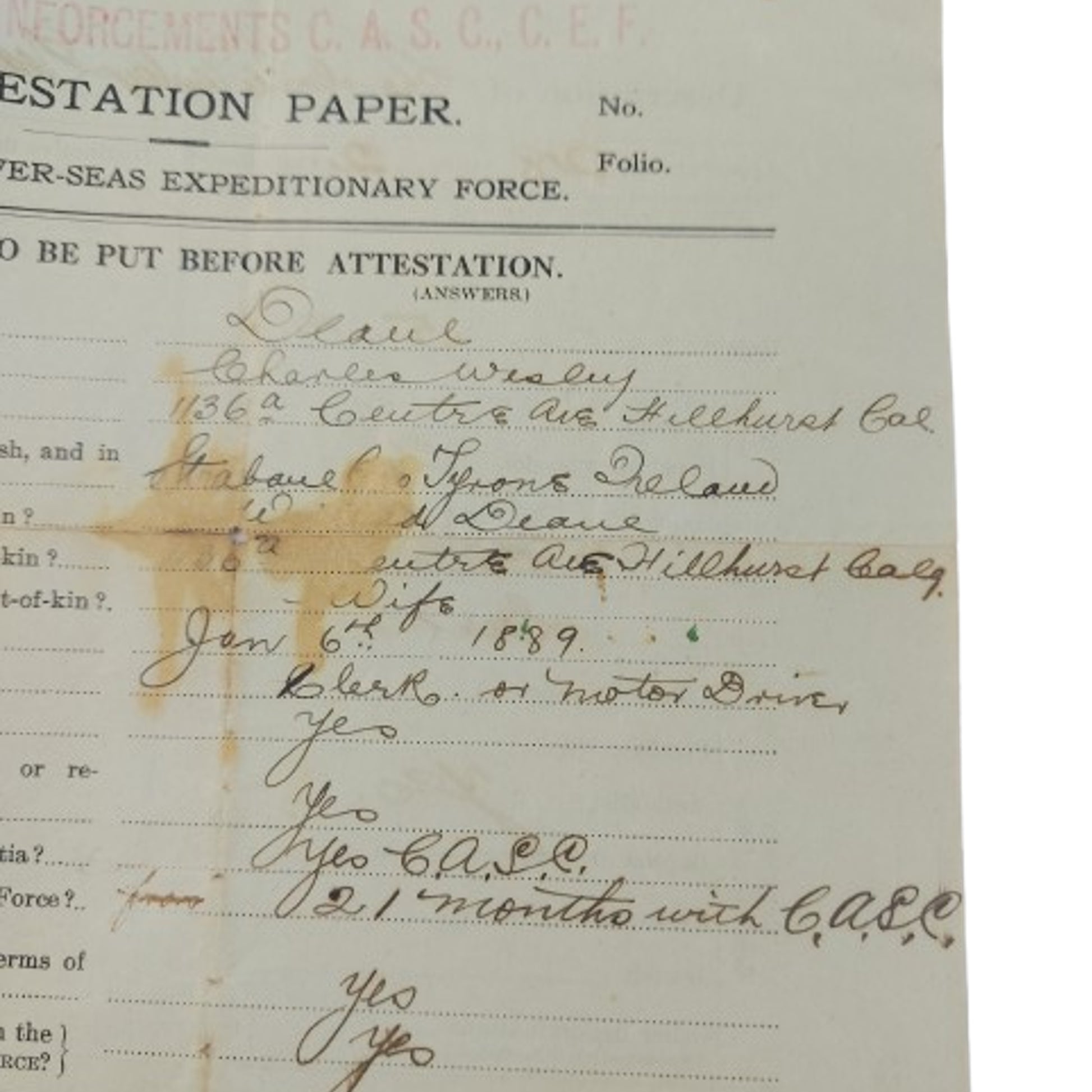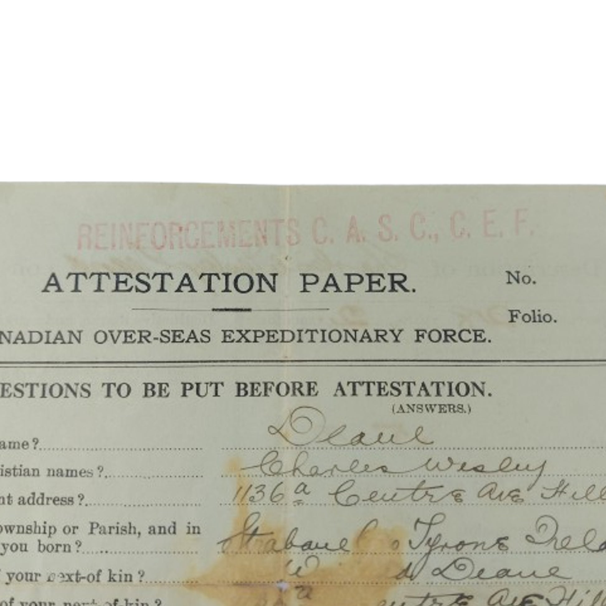 WW1 Canadian Attestation Paper CASC Canadian Army Service Corps