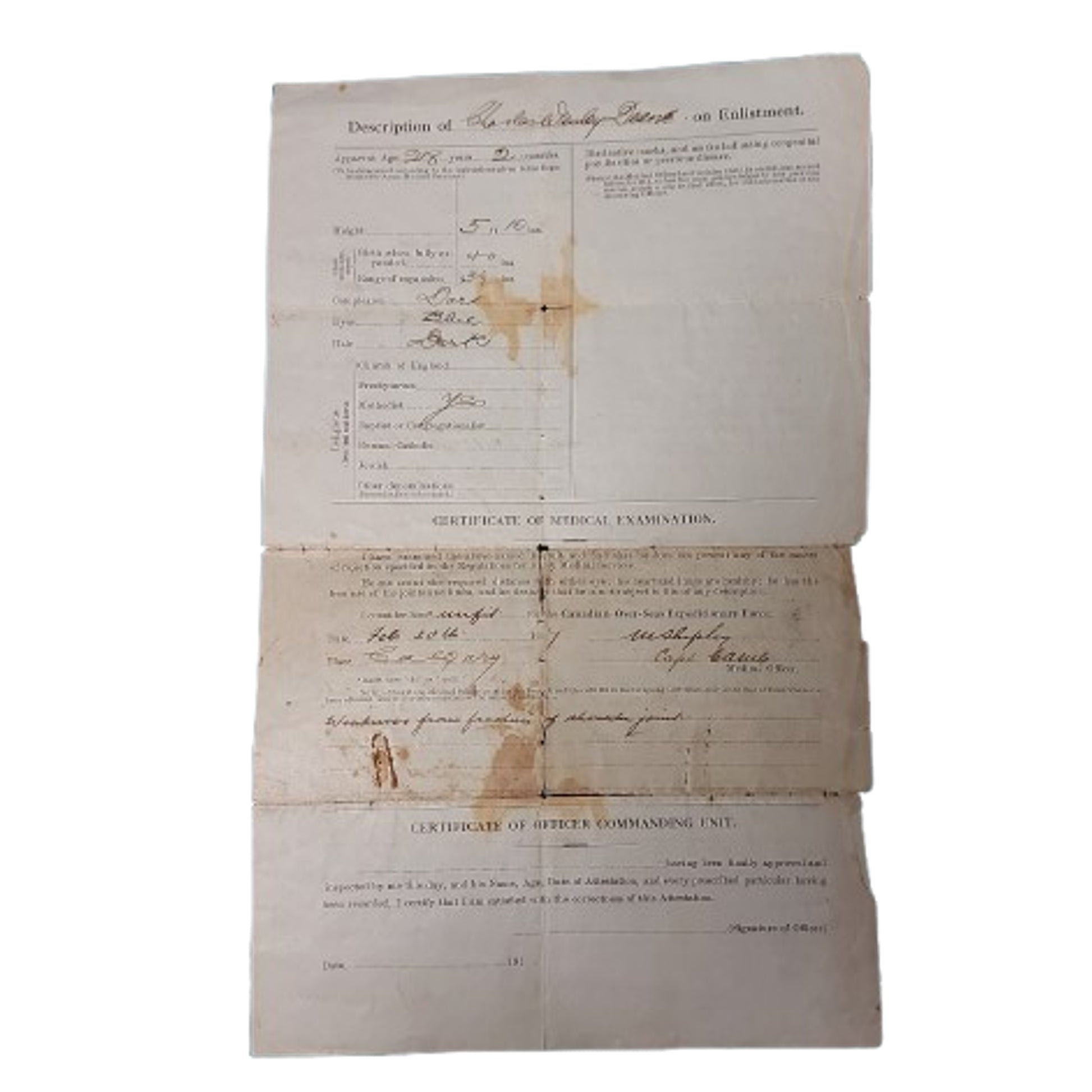 Original WW1 Canadian attestation paper, measuring 13 1/4 by 8 1/2 inches to a Calgary soldier who was rejected for health reasons. Dated February 22, 1917. Tearing to the fold lines. SKU: 62347