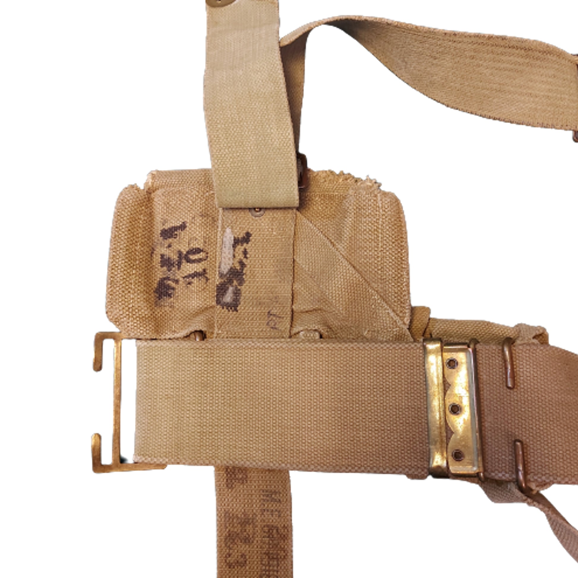 Comprising of the waist belt, cross braces, and left and right ammunition pouches. Belt and ammunition pouches are maker marked "M.E. Co." and dated 1918 with a British Broadarrow to the belt. The left ammo pouches shows traces of some applied blanco, and the pouch is complete with all functioning brass snap closures and all closure straps complete with no damage. The right ammo pouch is marked to the reverse, with all the top 2 pouches showing period field repairs to the tops. SKU: 58905