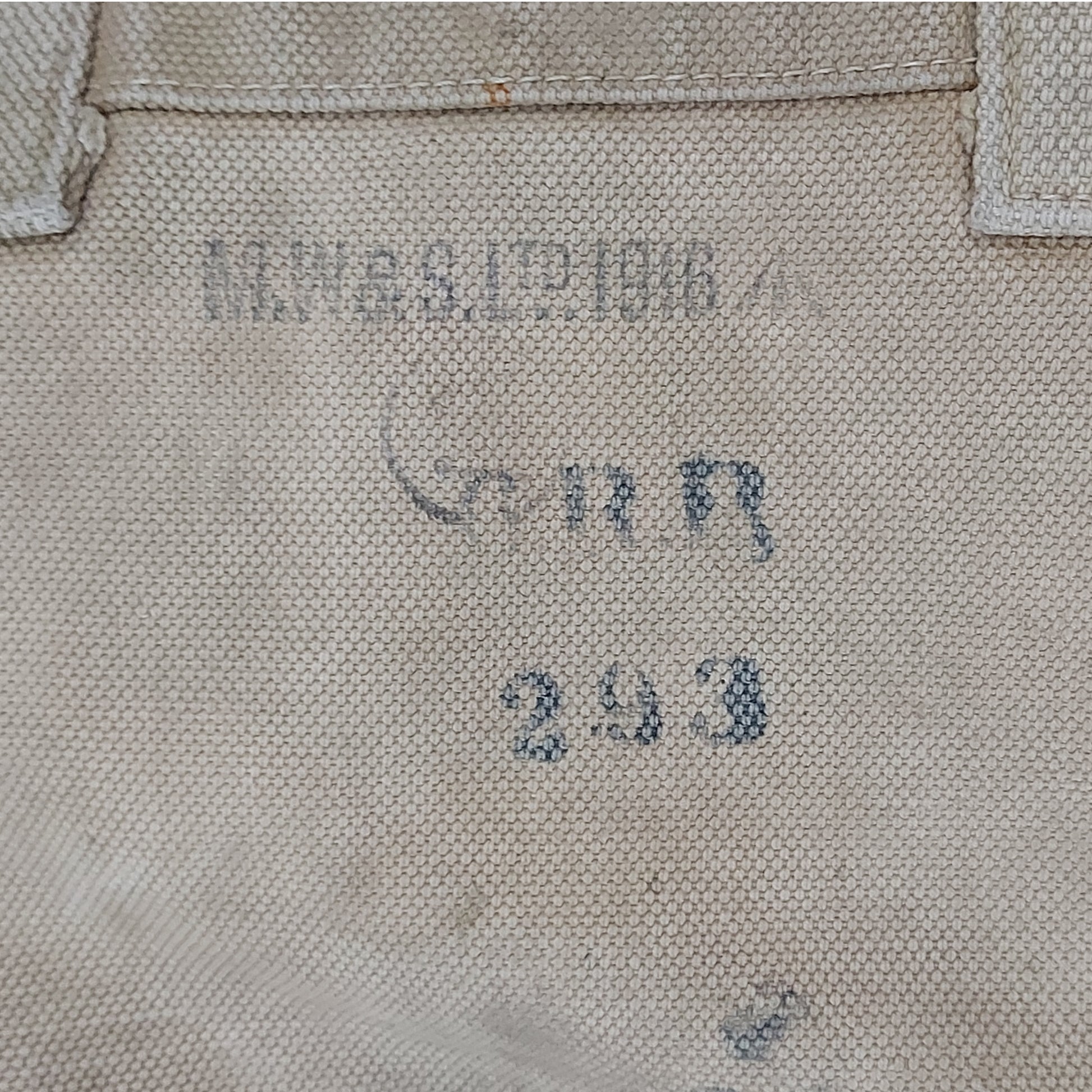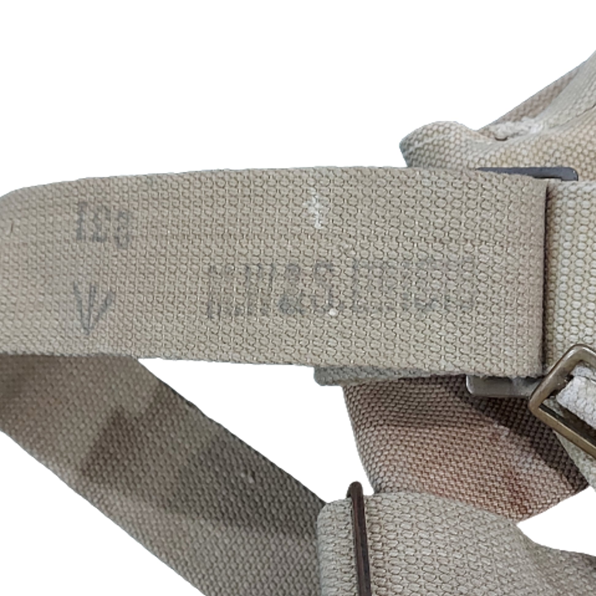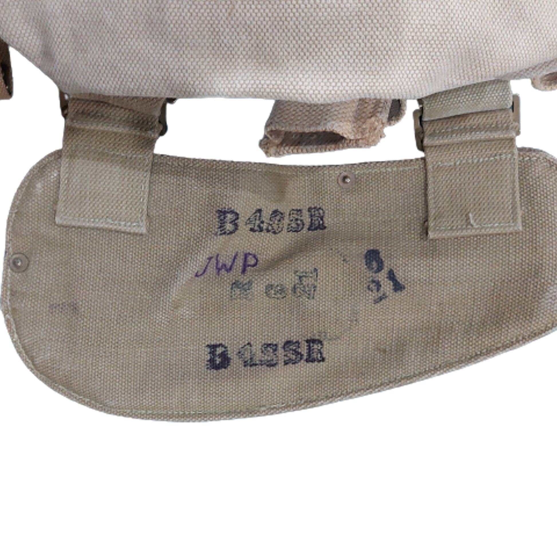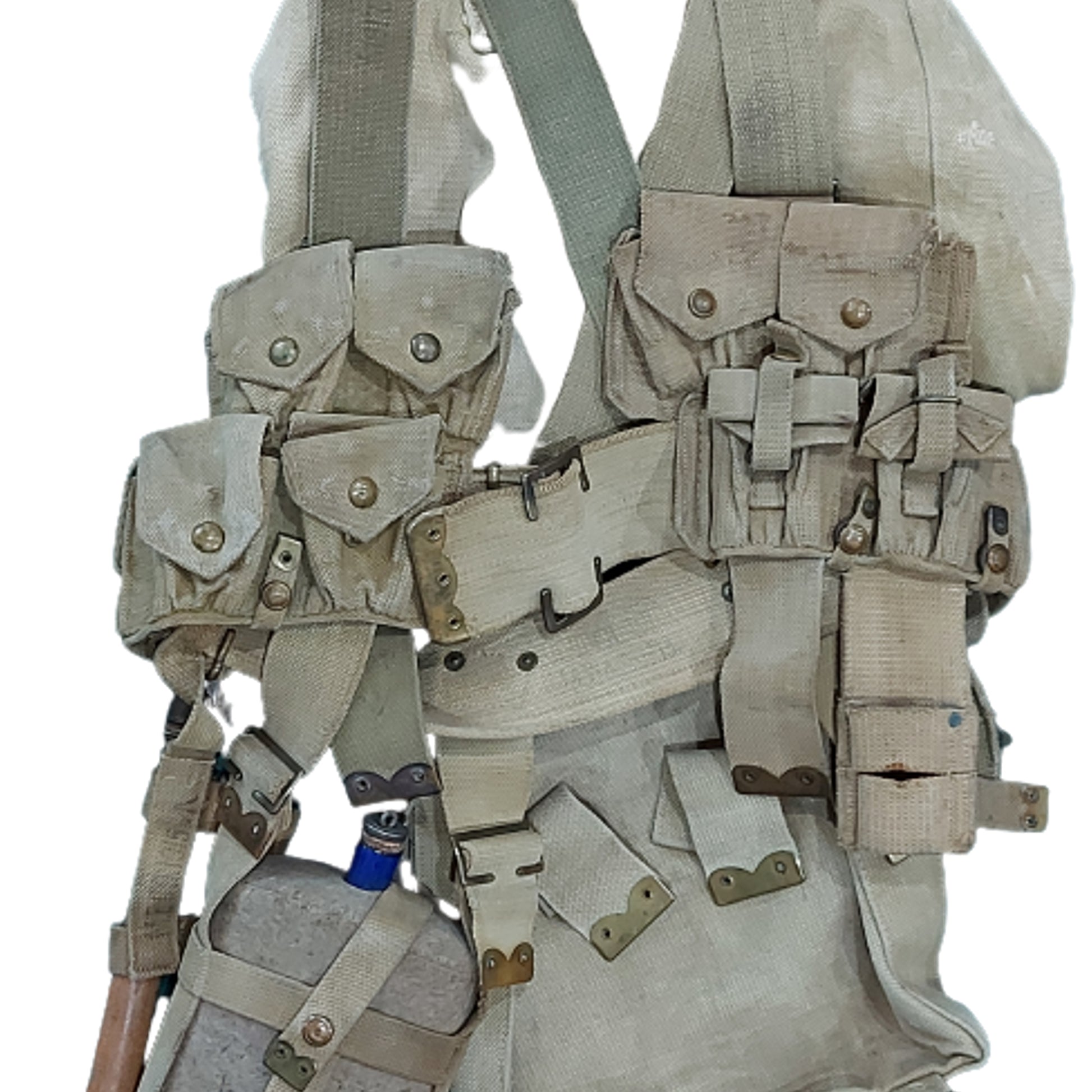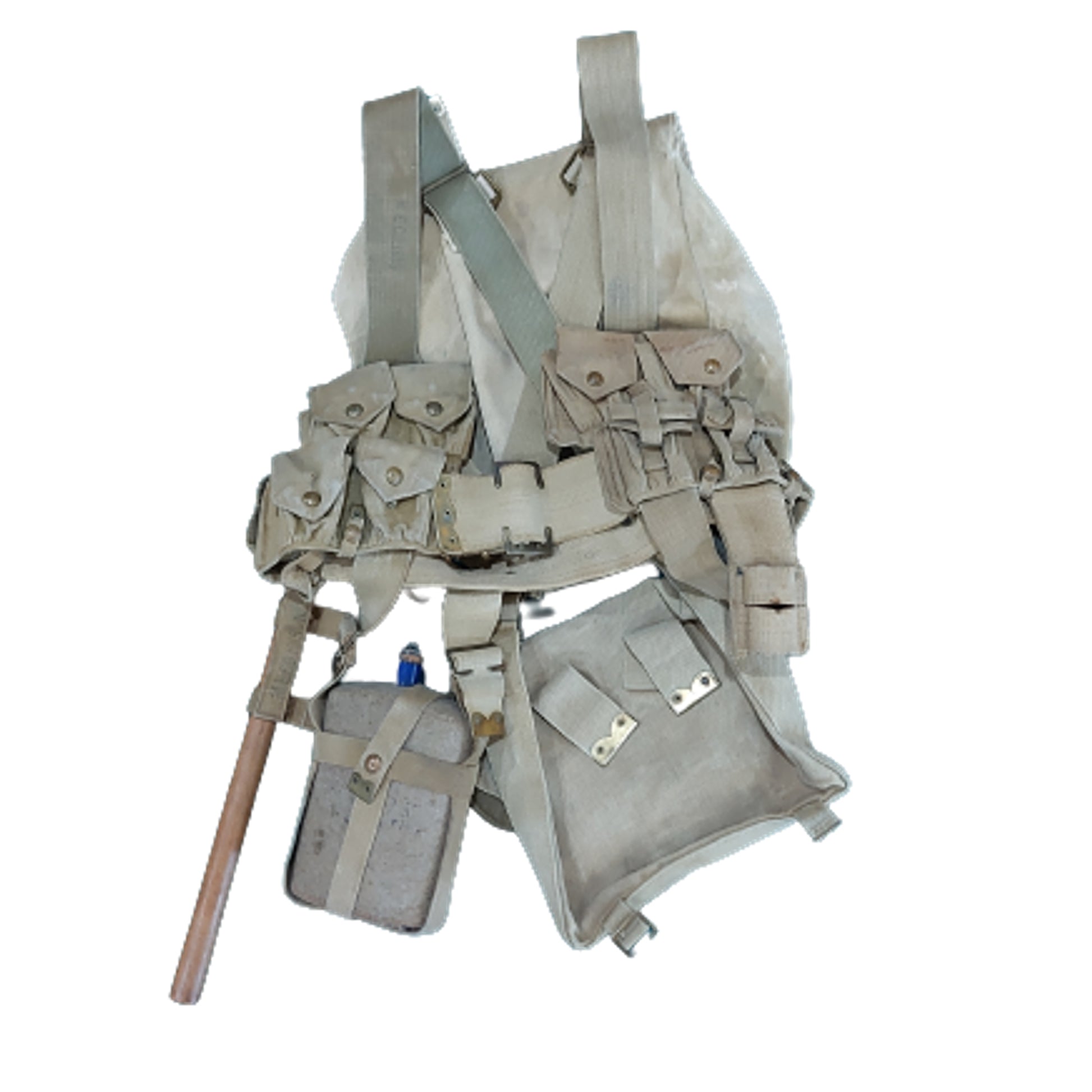 Comprising of the waist belt, cross braces, left and right ammunition pouches, large pack, small pack, entrenching tool with cover, bayonet frog, canteen in carrier and helve. Large pack is well marked to the interior, as is the helve, entrenching tool cover and head, and the cross braces, as shown in the photos. SKU: 59715.