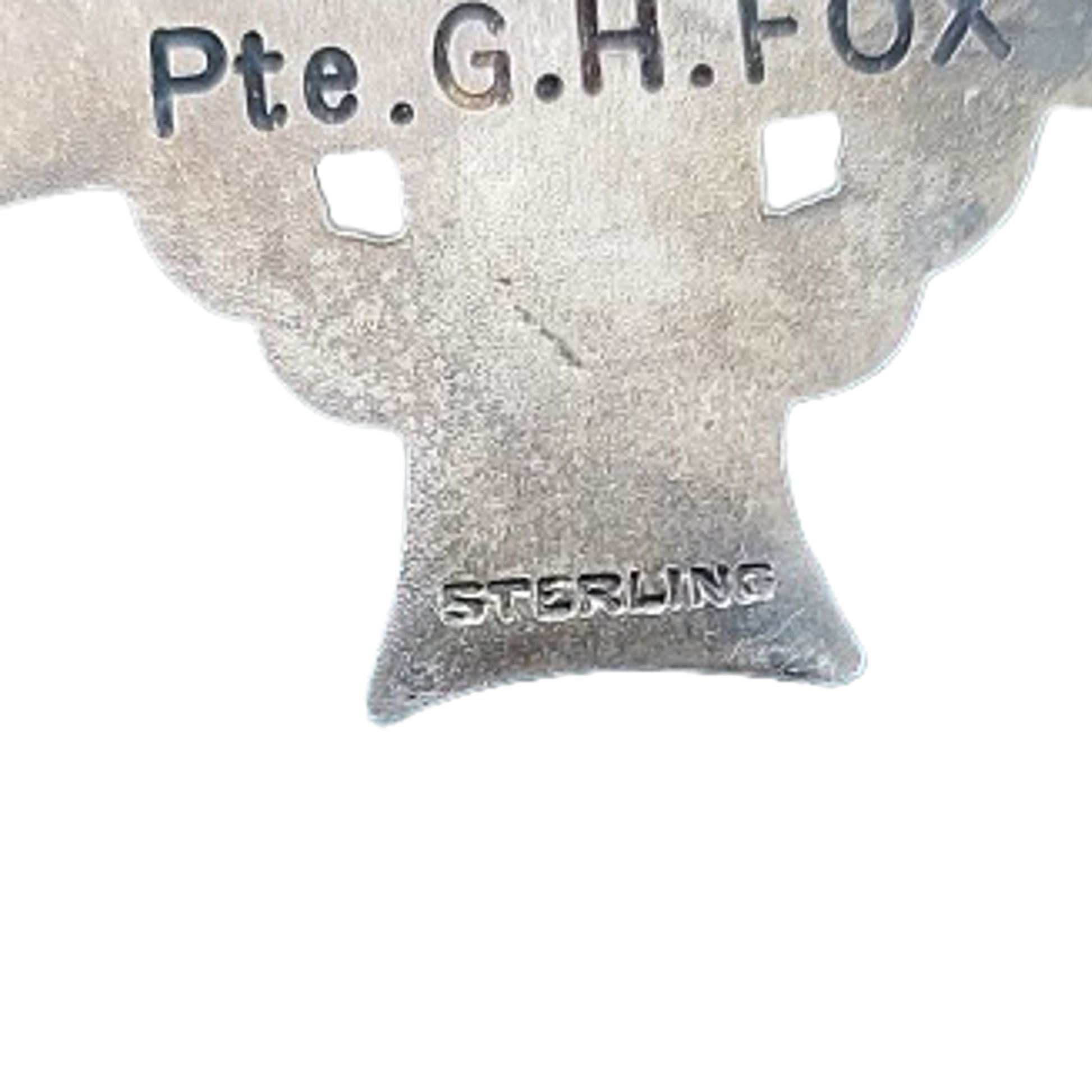 WW1 Canadian Memorial Cross named to 443132, Pte. G.H. FOX who served with the 54th Kootenay Battalion, British Columbia. Sterling marked to the reverse, and housed in the jeweler marked case, and with the compliments card. No ribbon present. SKU: 63211