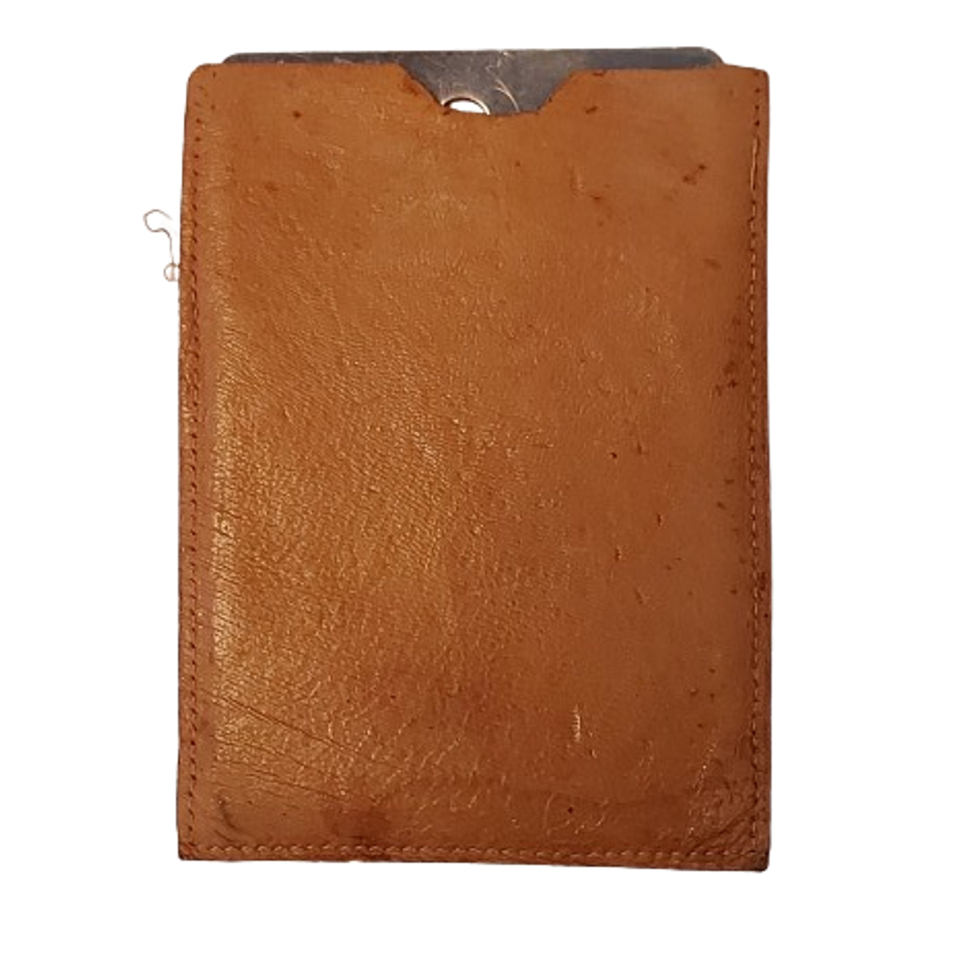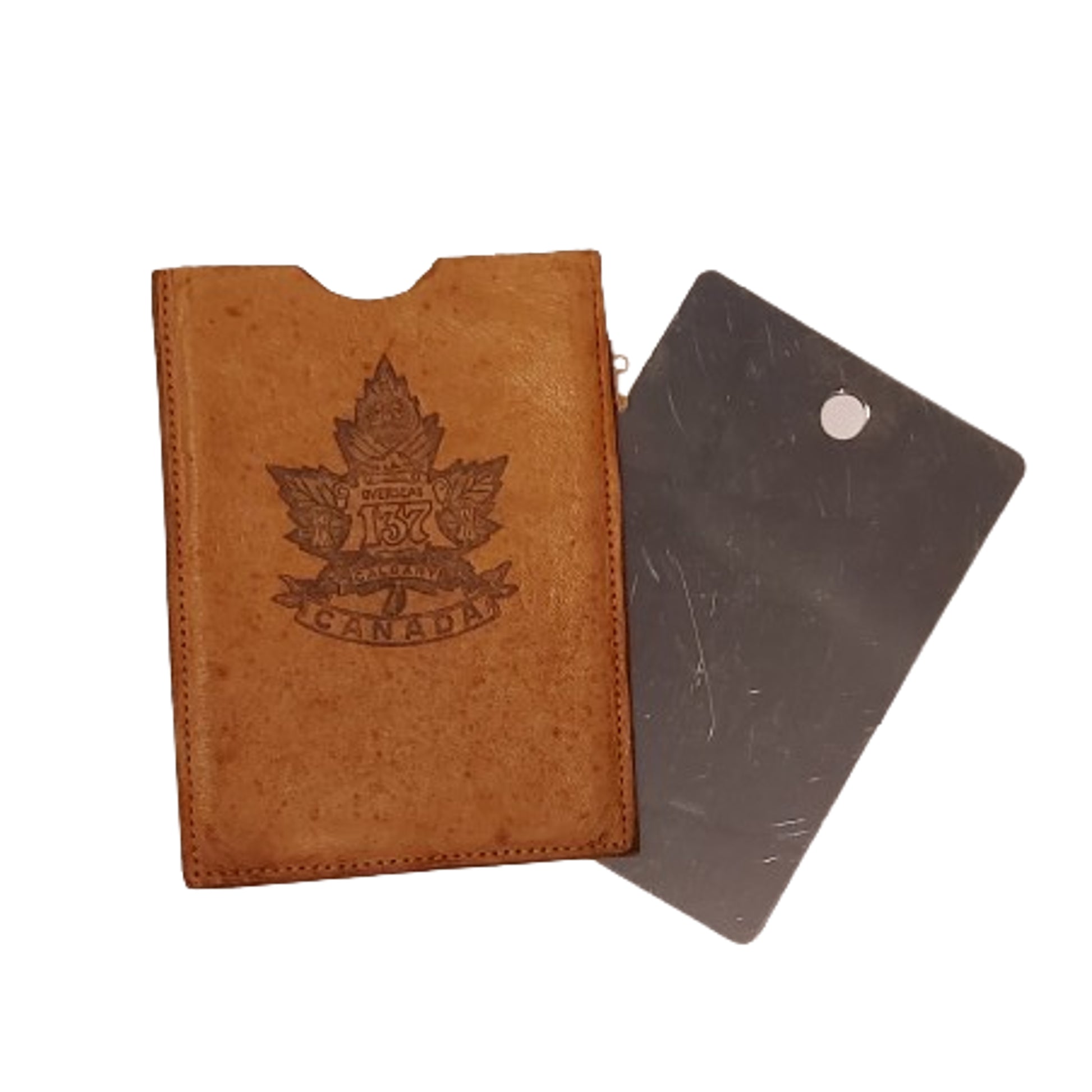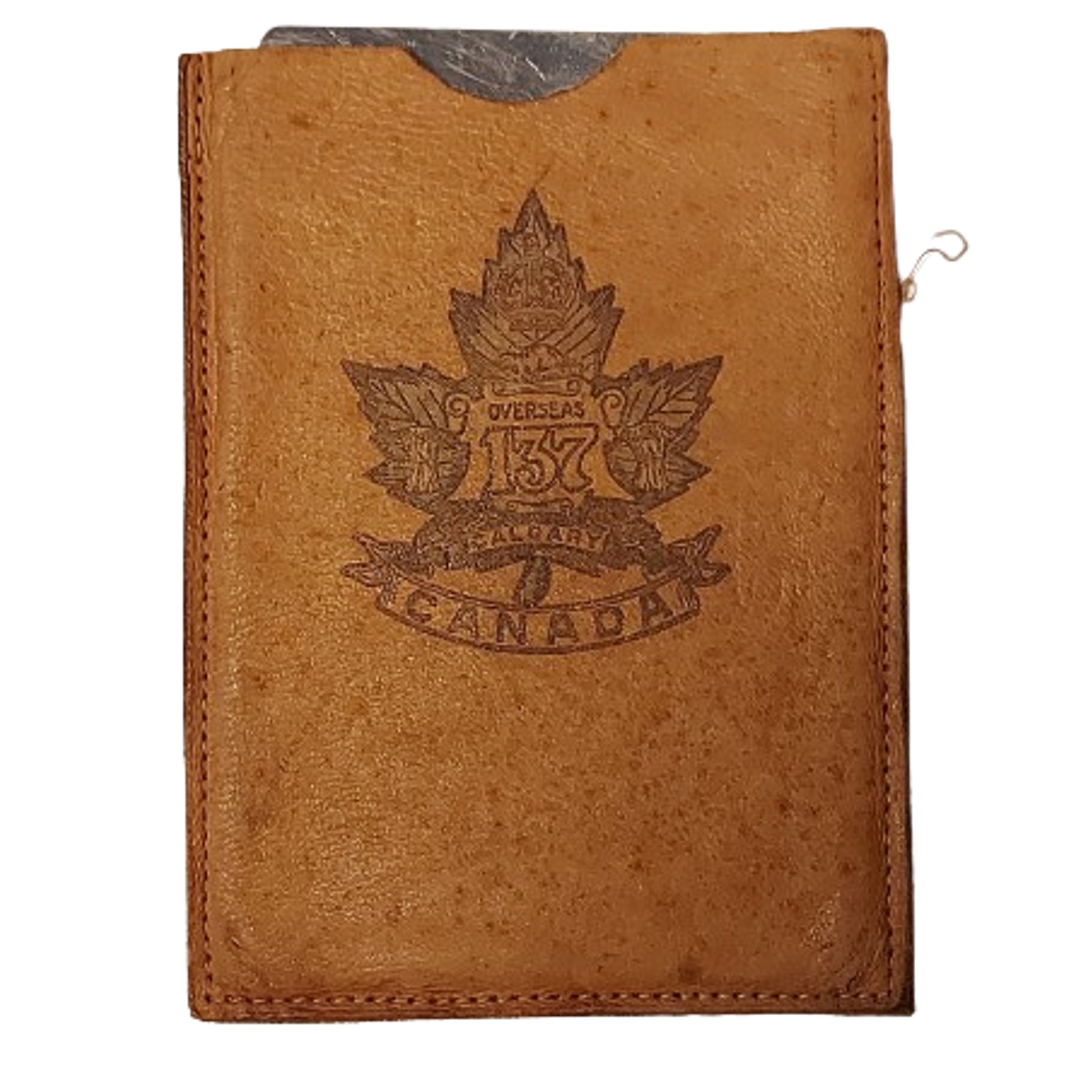 Polished steel field mirror measuring 3 by 4 1/2 inches and contained in a leather holder with a colored likeness of the WW1 137th Battalion cap badge to the front. SKU: 61078