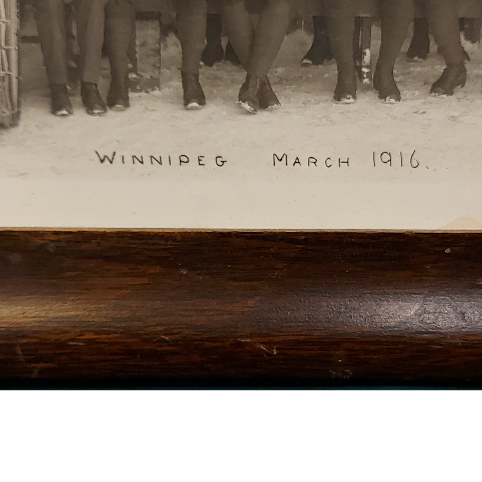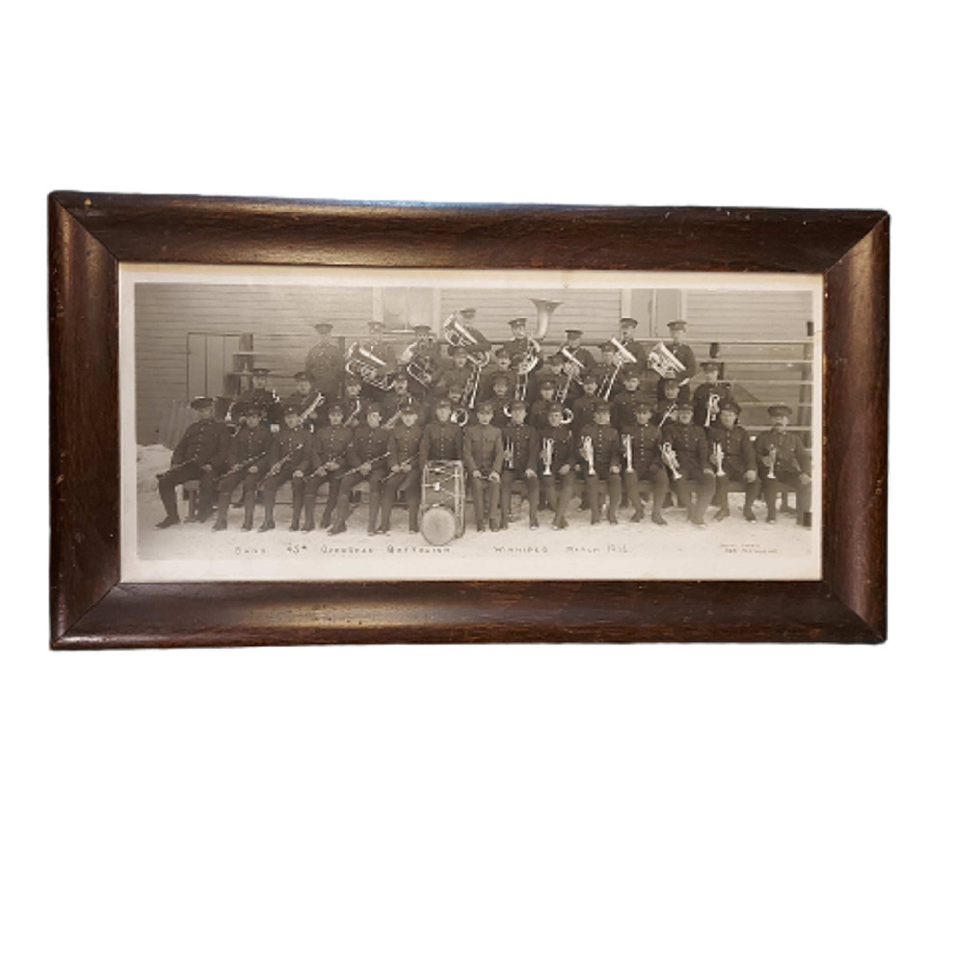 Black and white photo in original frame, measuring 20 by 10 3/4 inches showing members of the 45th Battalion Winnipeg in uniform and visor caps with instruments. Dated March 1916. No glass to the front. SKU: 59689