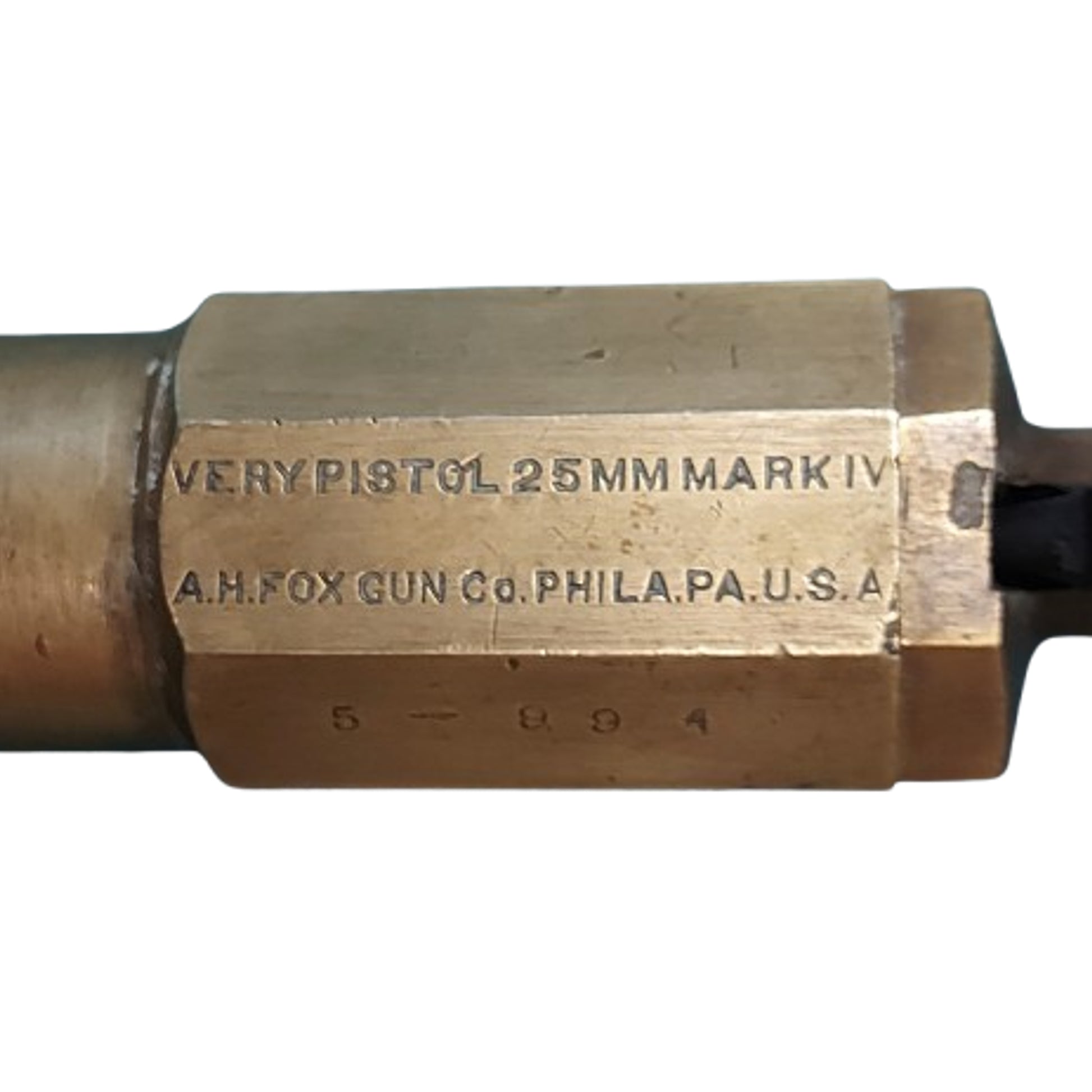 WW1 brass construction, 25mm single shot, break open, single action flare pistol with a 4 inch, half round, half octagon steel lined barrel and steel hammer, spur trigger and lanyard ring, and vertical grooved, 2 piece wooden grip panels. Manufacture marked to the top of the barrel, "Very Pistol 25mm Mk.IV, A.H. Fox Gun Co. Phila. P.A. USA." The underside of the frame is hand stamped "PPCLI" with a Canadian C-Broadarrow stamp to the right side of the frame. Mechanically very good, locking tightly and functioning correctly. SKU: 63419 CANADIAN SALES ONLY.