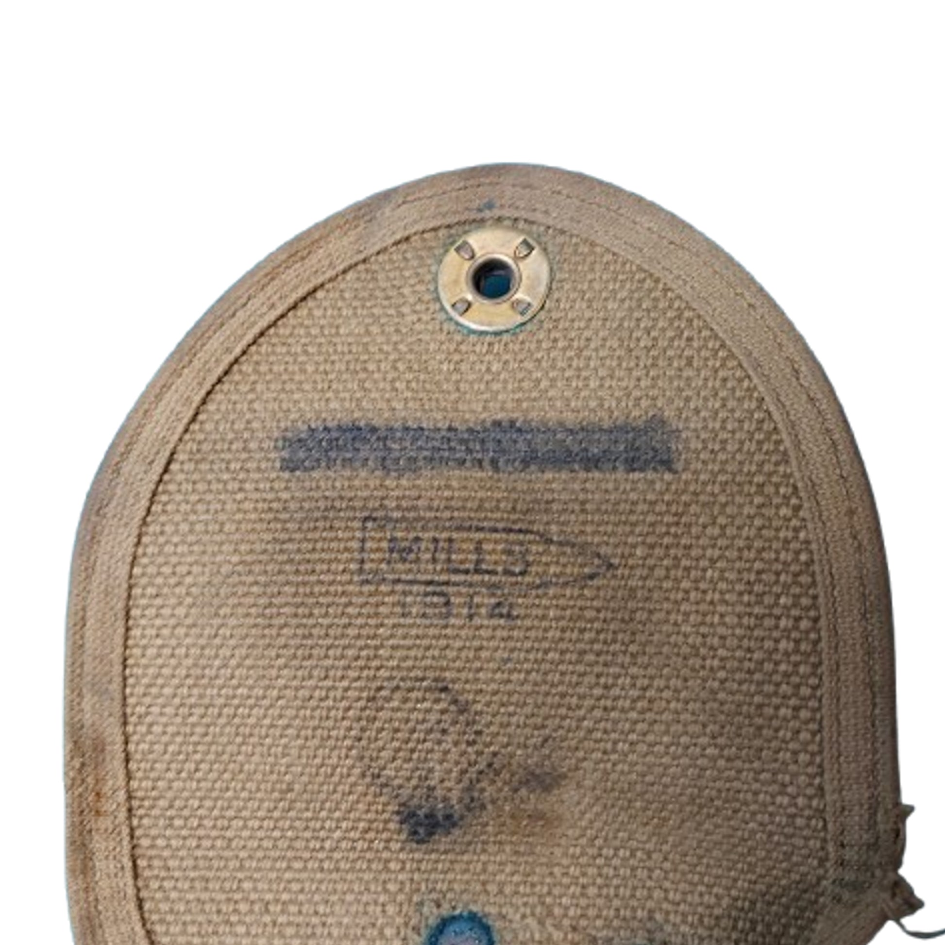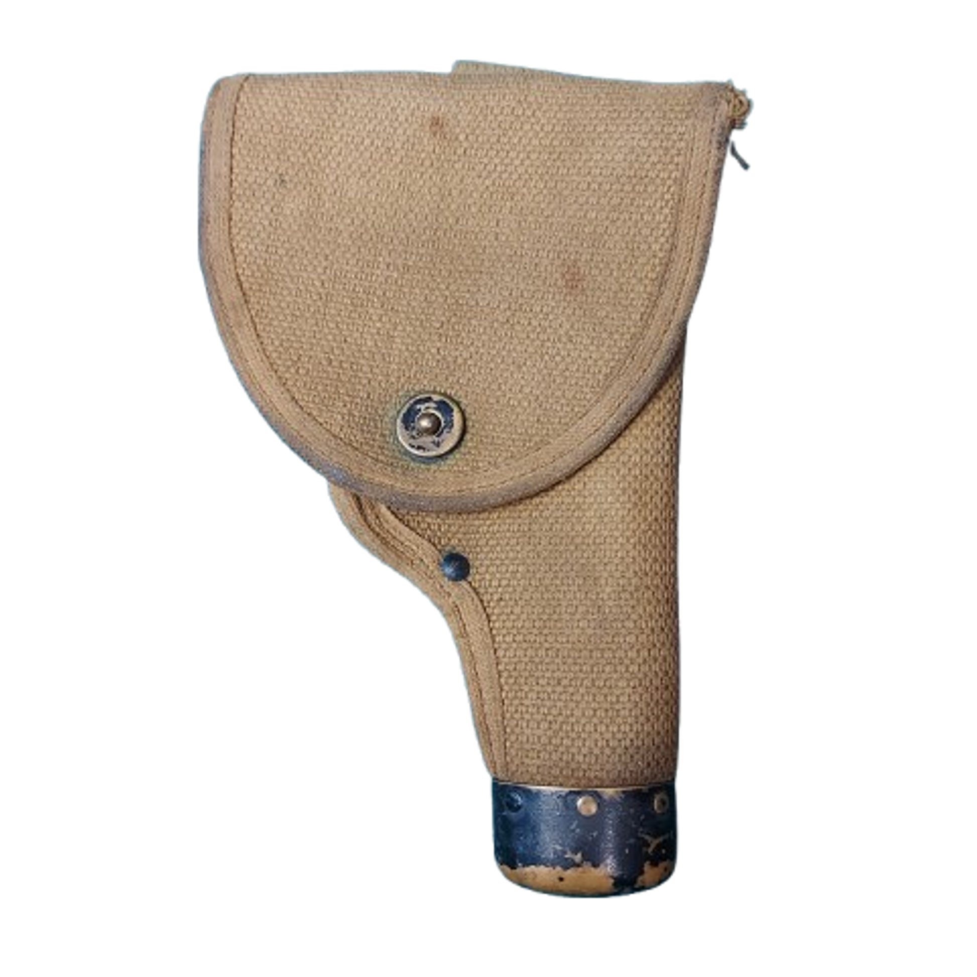 Webbed material construction with a black painted brass boot to the bottom, brass closure, and brass belt hook to the reverse. Marked to the interior with the Mills logo, and dated 1914 with a large Canadian C-Broadarrow stamp below. The interior of the closure flap also shows a naming that has been covered and marked over. End of brass cap stamped MILLS logo and patent dates. Shows expected use and wear. A rare WW1 Canadian item SKU: 63477