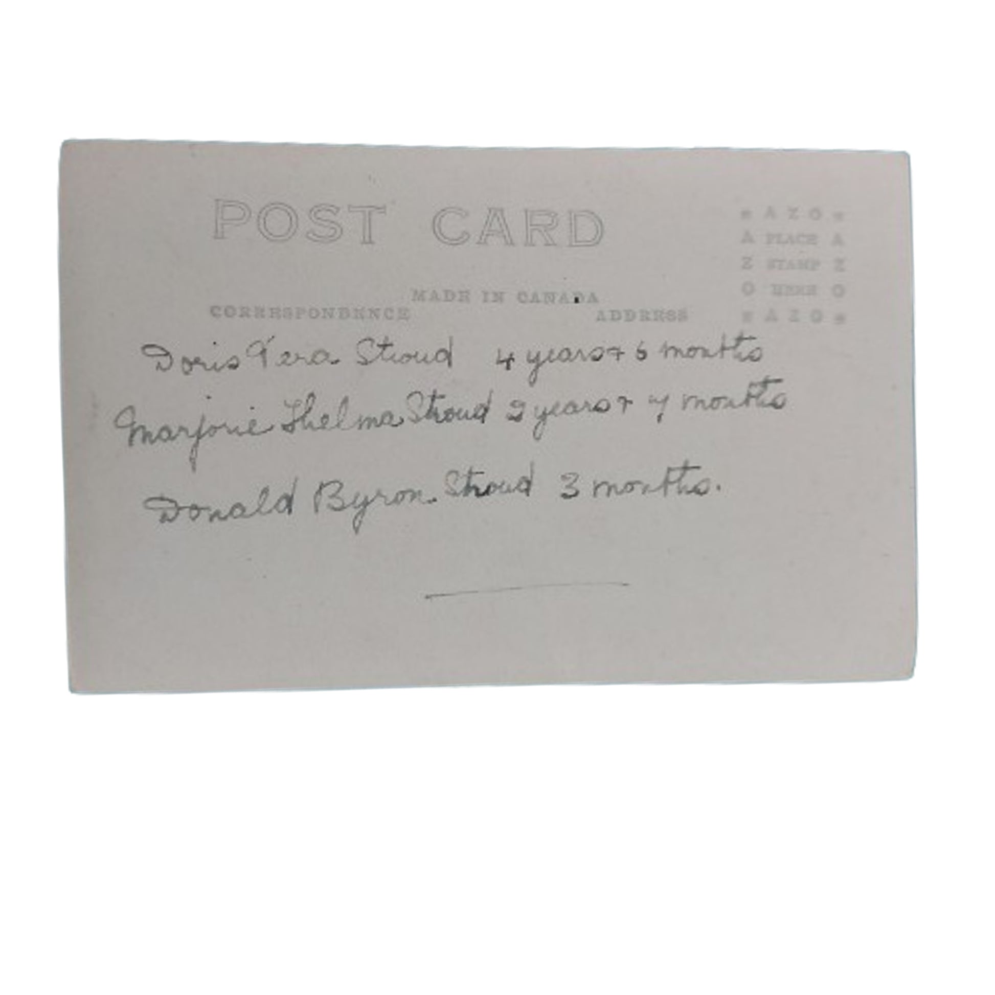 Black and white WW1 picture postcard showing a Canadian Machine Gun Corps soldier in uniform posing with his family. Period hand applied naming to the reverse. Postcard marked, Made In Canada. SKU: 61312