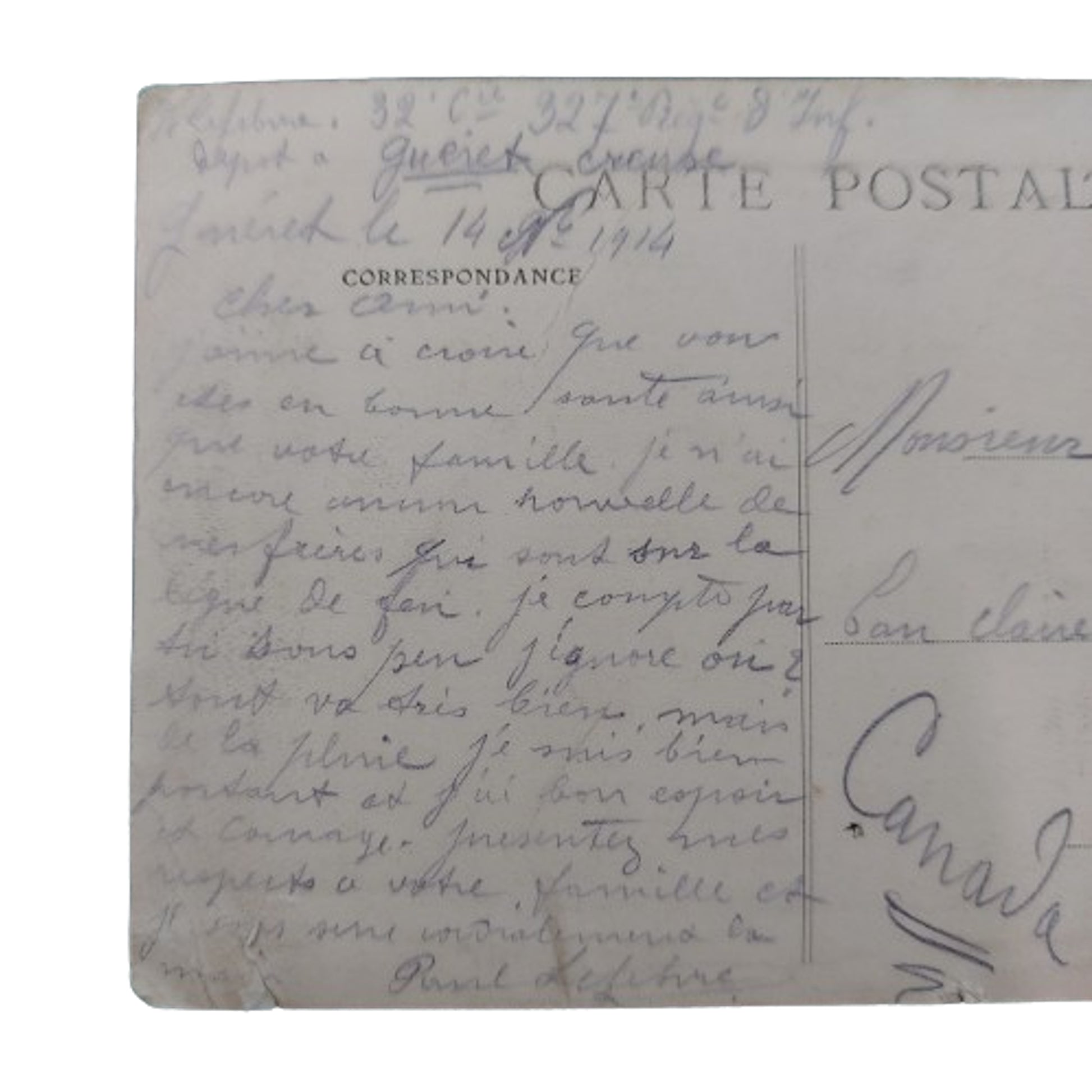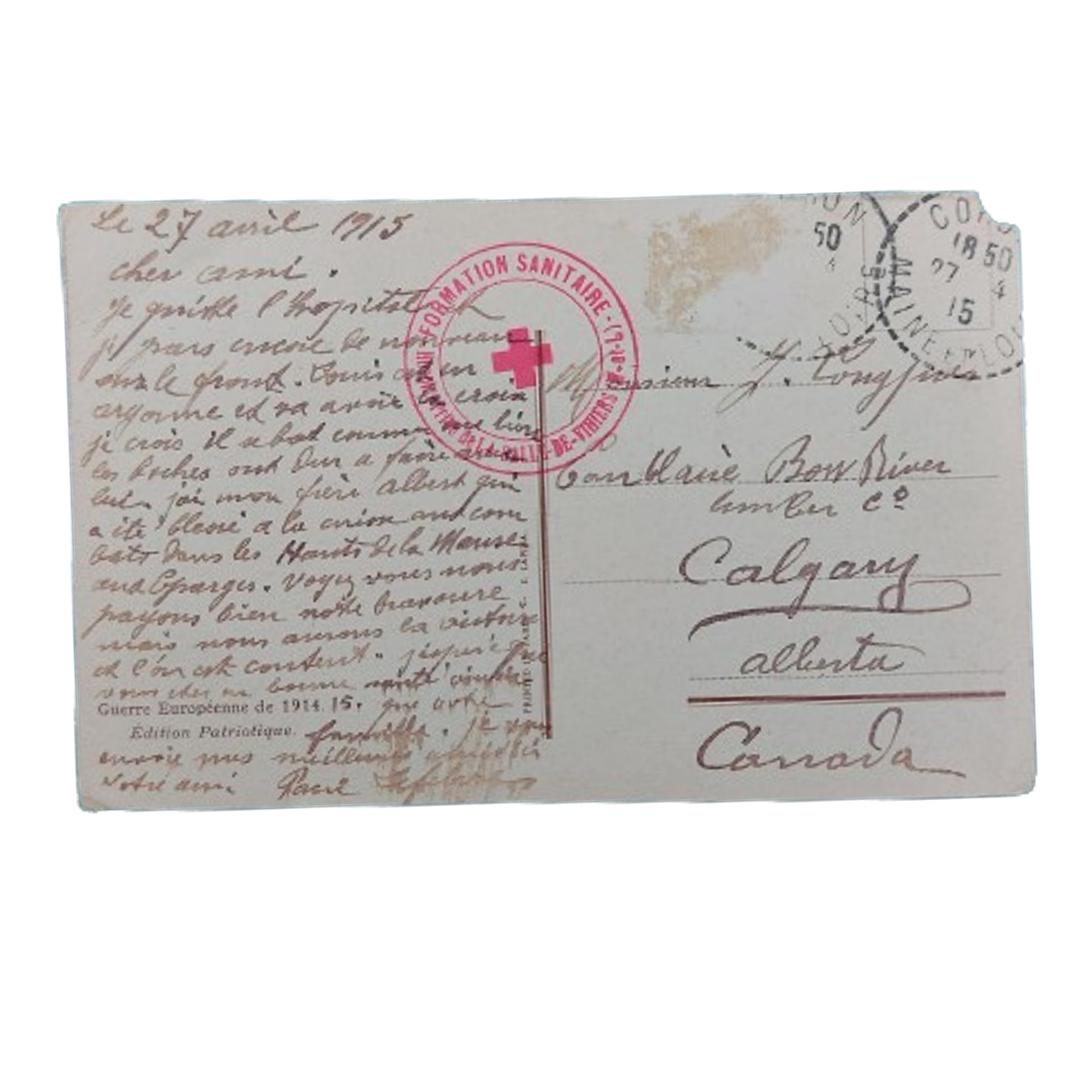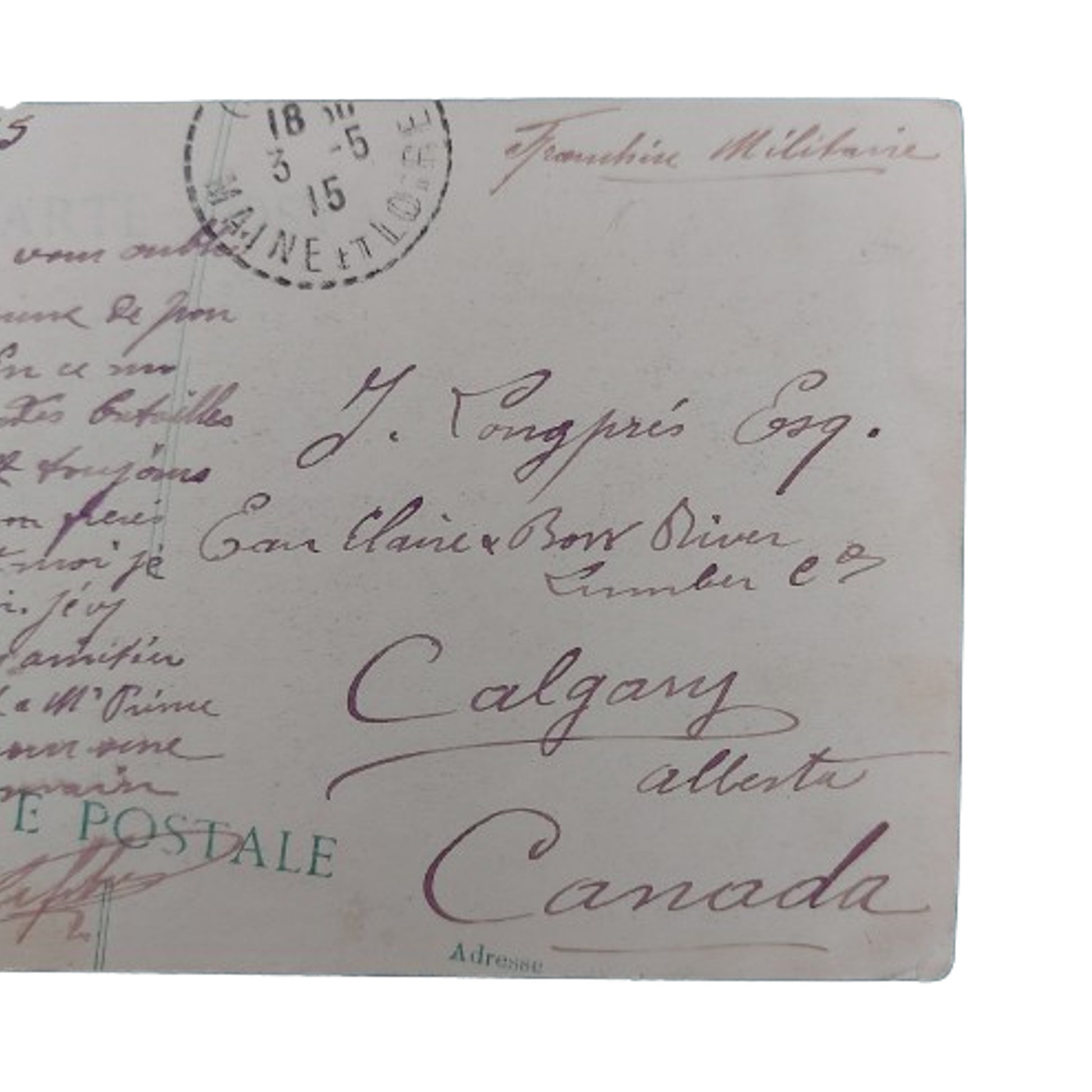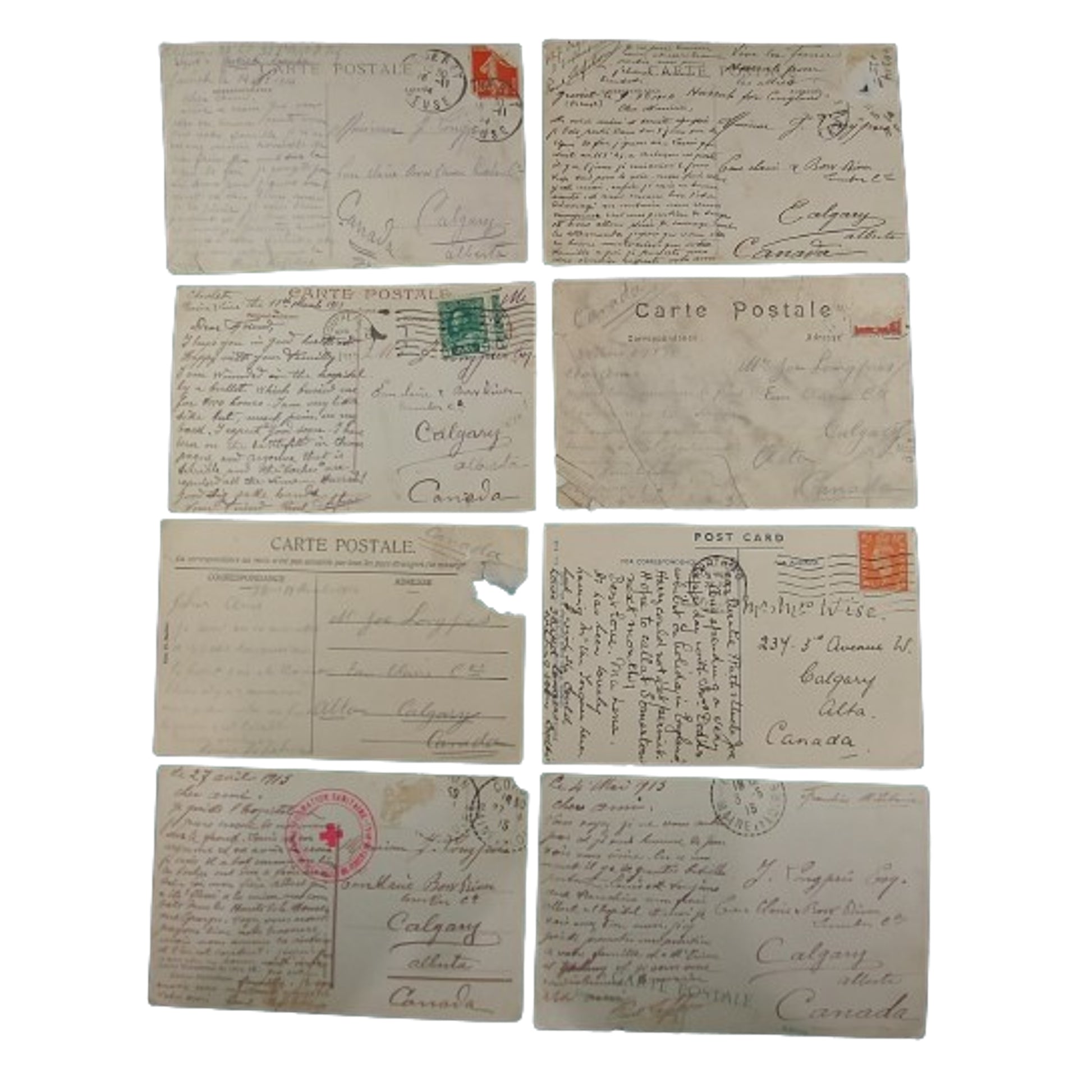Group of 8 French WW1 picture postcards from an overseas soldier to home. 7 cards address to the Eau Claire Bow River Lumber Company in Calgary Alberta, with one to the home residence on 3rd Avenue West Calgary Alberta. All with letters and addresses to the. reverse. SKU: 61329