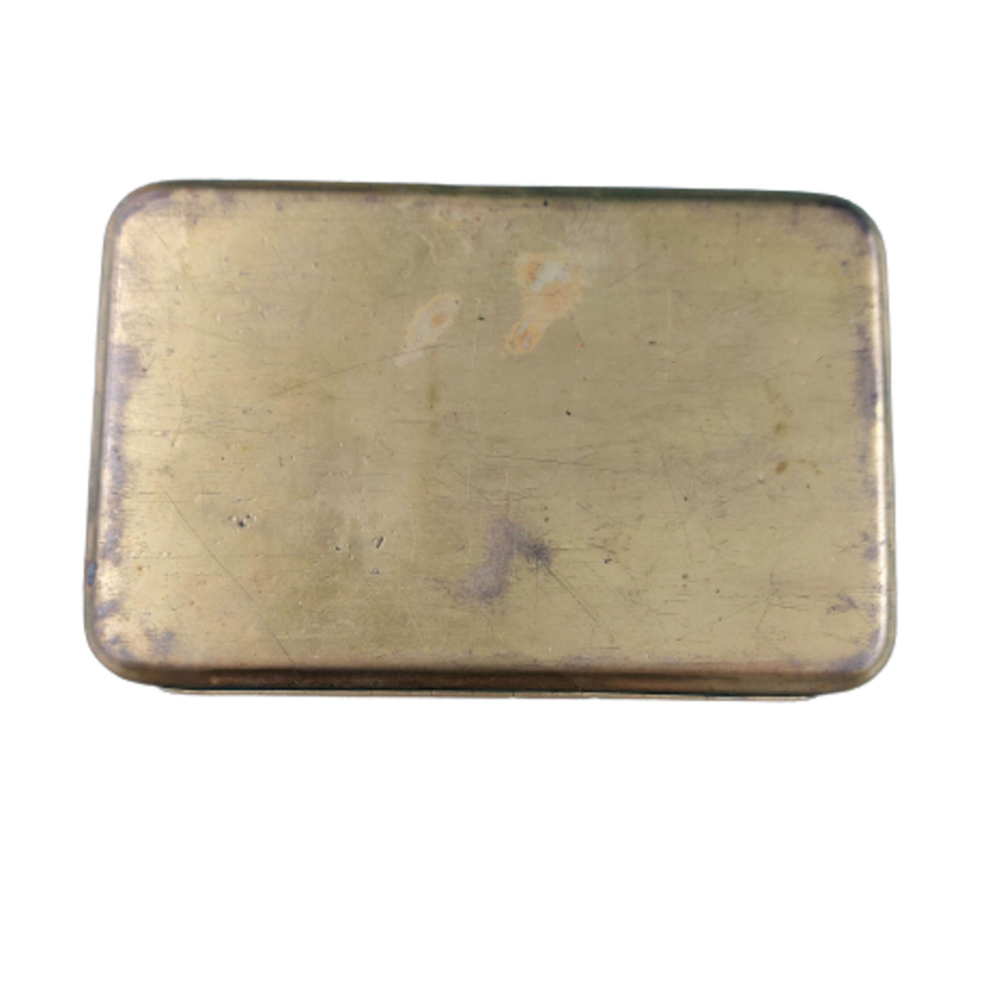 All brass construction with embossed hinged lid and dated 1914. Tin only with no contents.