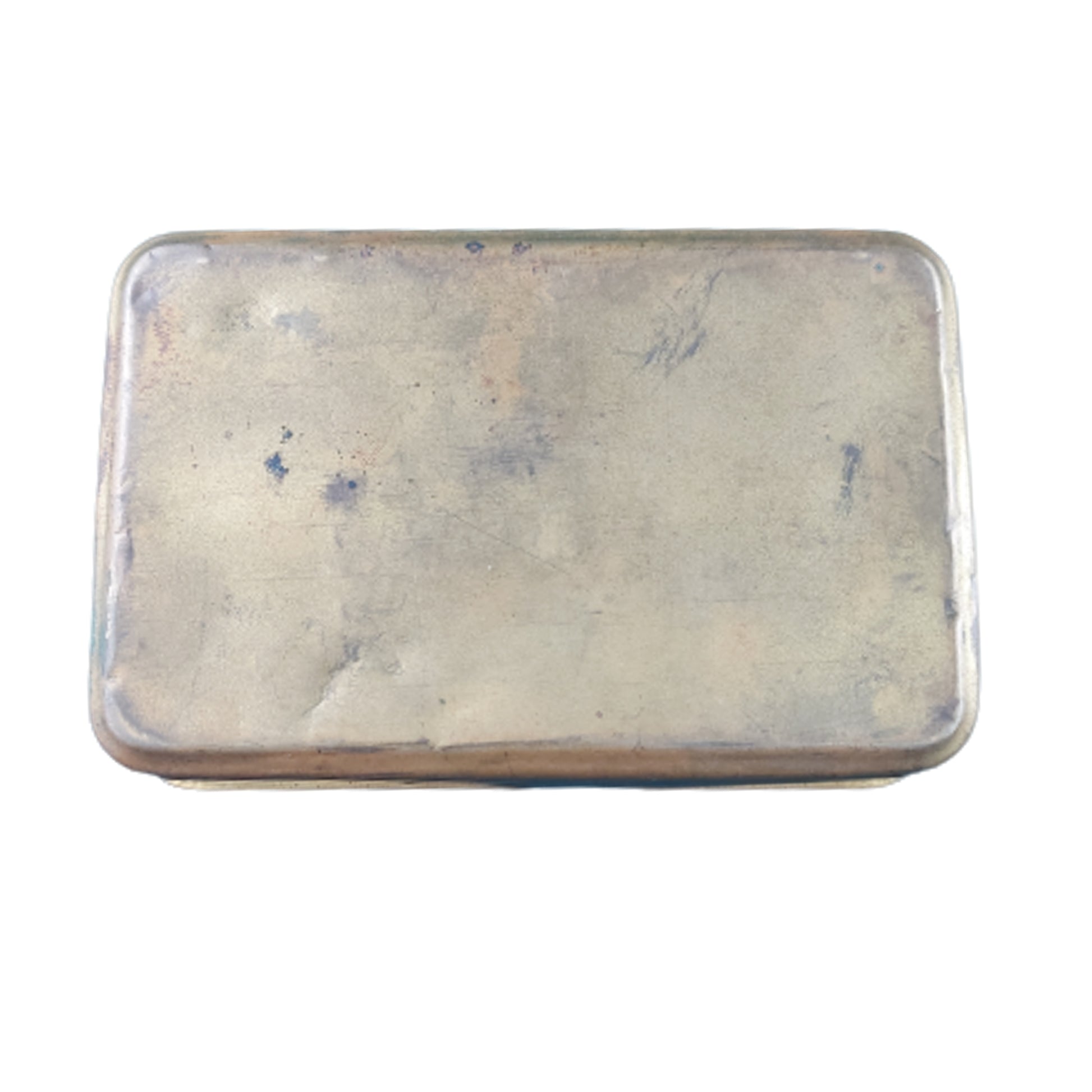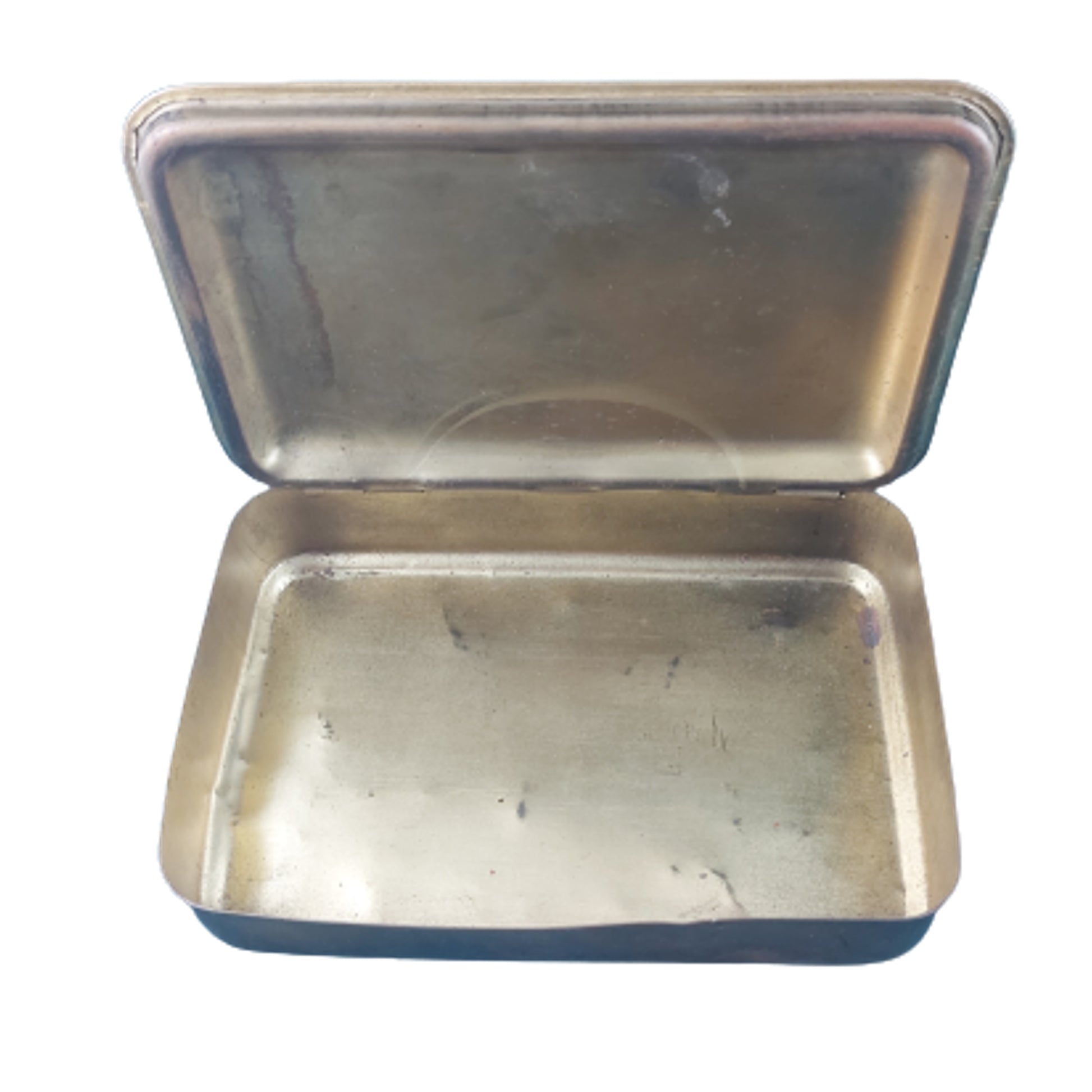 Brass, with an embossed hinged lid and dated 1914. Measures 5 by 3 14 inches. Tin only with no contents. SKU: 59895