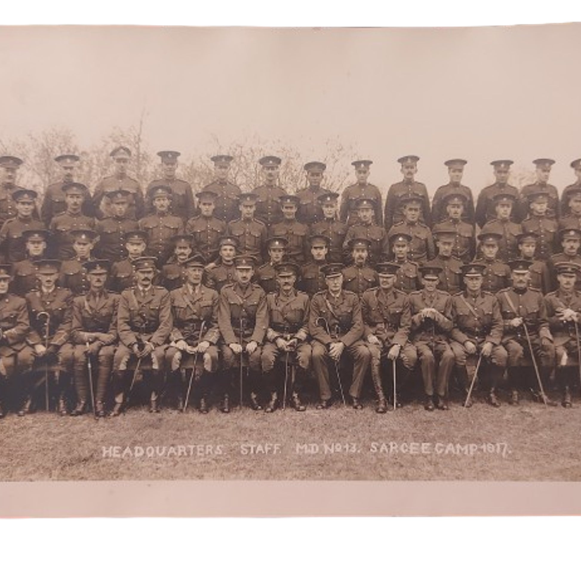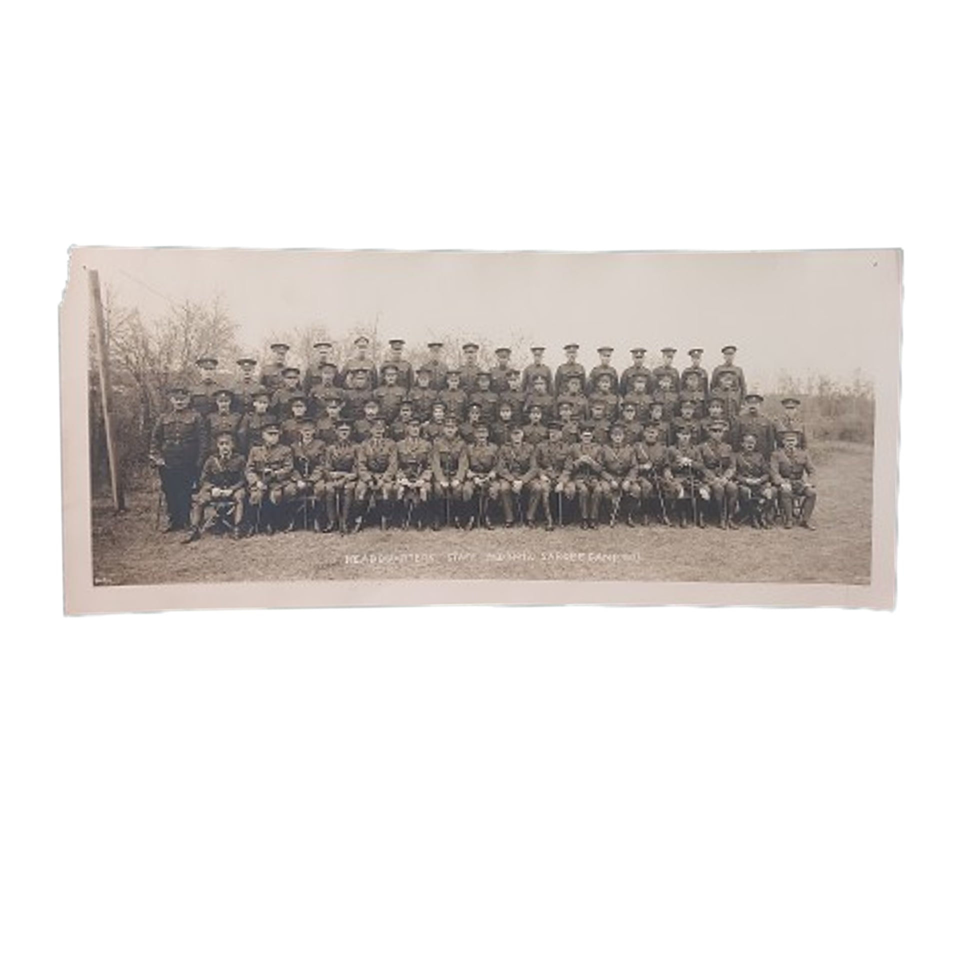 Original WW1 black and white photograph showing the Headquarters Staff, M.D. 13 at Sarcee Camp, 1917. Measures 16 by 7 inches. Small tear to the top left corner. No frame. SKU: 61856