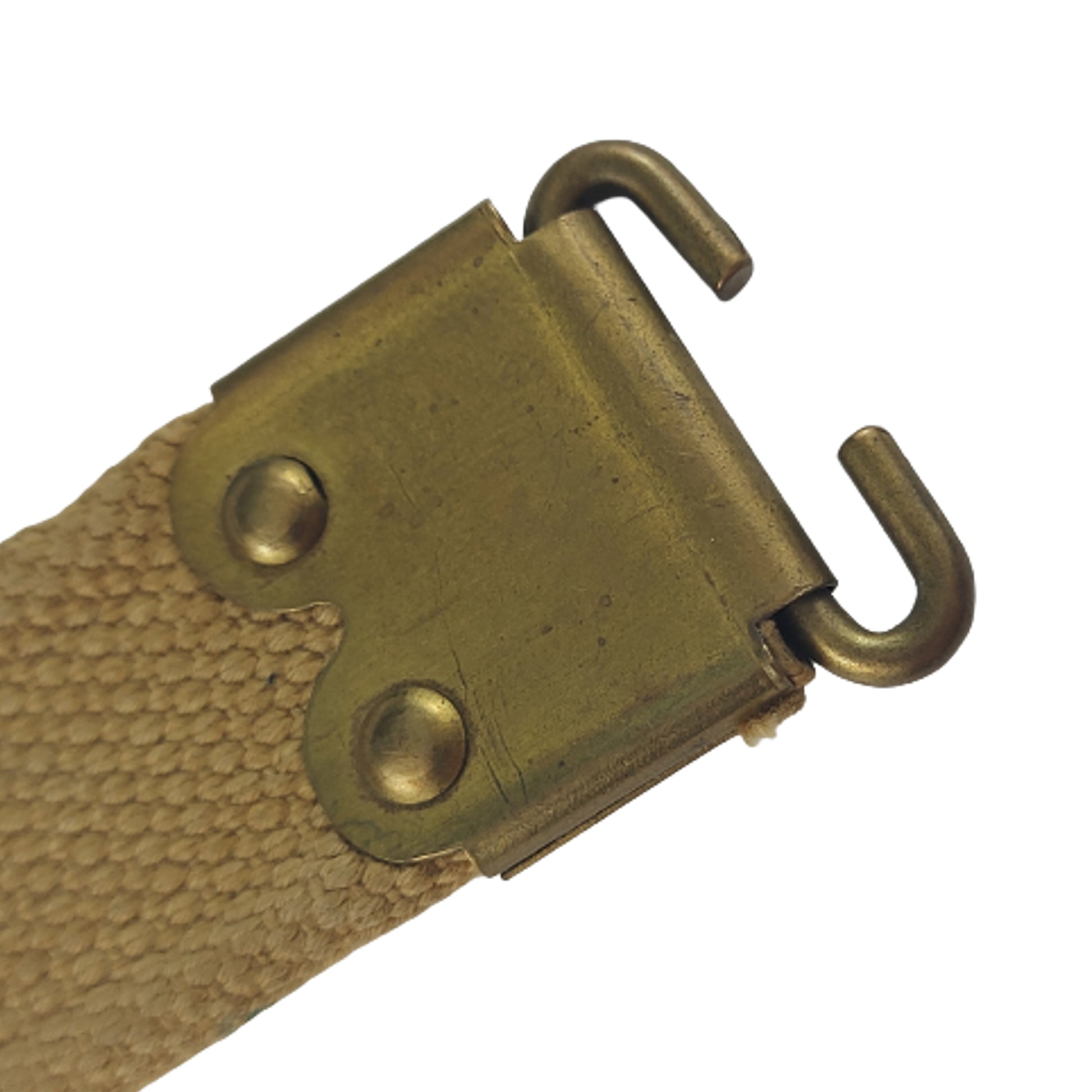 Webbed construction with brass tabs, measuring 43 inches overall, and maker marked, Hugh Carson Ltd. and with a Canadian C-Broadarrow stamp. Appears unused but with no visible date.