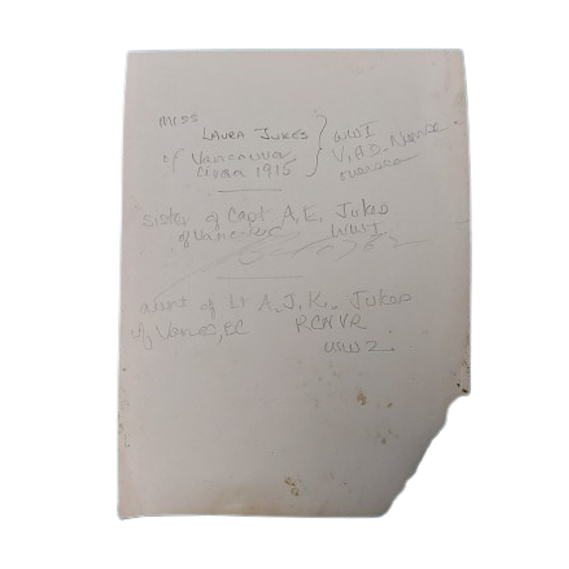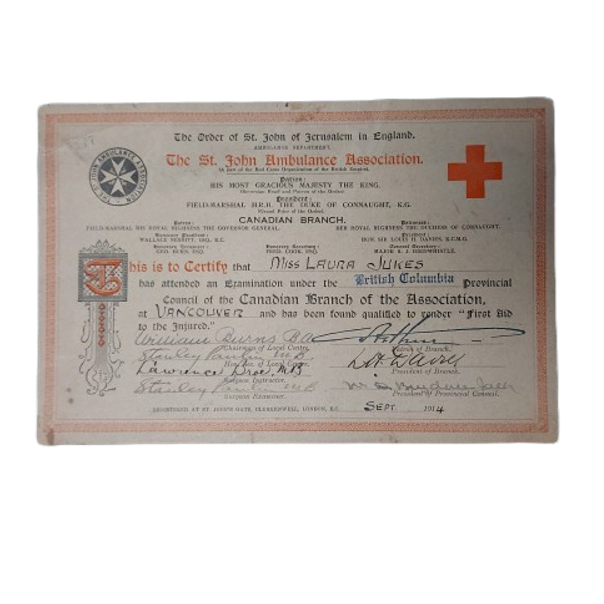 Comprising of a British Red Cross Society War Service 1914-1918 medal with issue ribbon, in the issue box, hand applied named to the reverse, and with the certificate, and a Canadian Red Cross Society medal with hanger, named to the reverse to Miss Laura Jukes and dated 1946, and manufacture marked below "Birks Ellis Sterling". The medals are accompanied with a St. Johns Ambulance Association Certificate, printed on color on heavy cardboard and measuring 9 by 6 inches, certifying Miss Laura Jukes has been found qualified to render "first aid to the injured", and dated Sept. 1914. It is also accompanied with a black and white picture postcard of Miss Laura Jukes with hand applied family information to the reverse. SKU: 63416