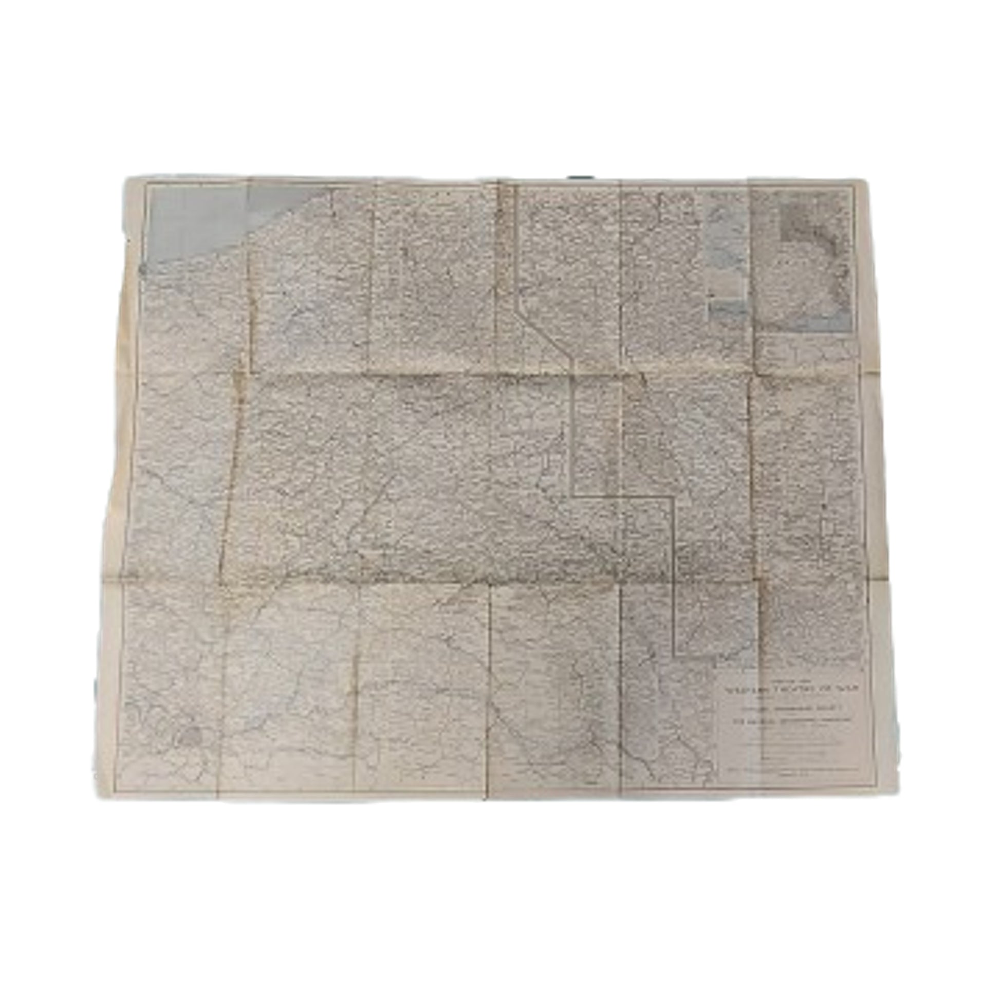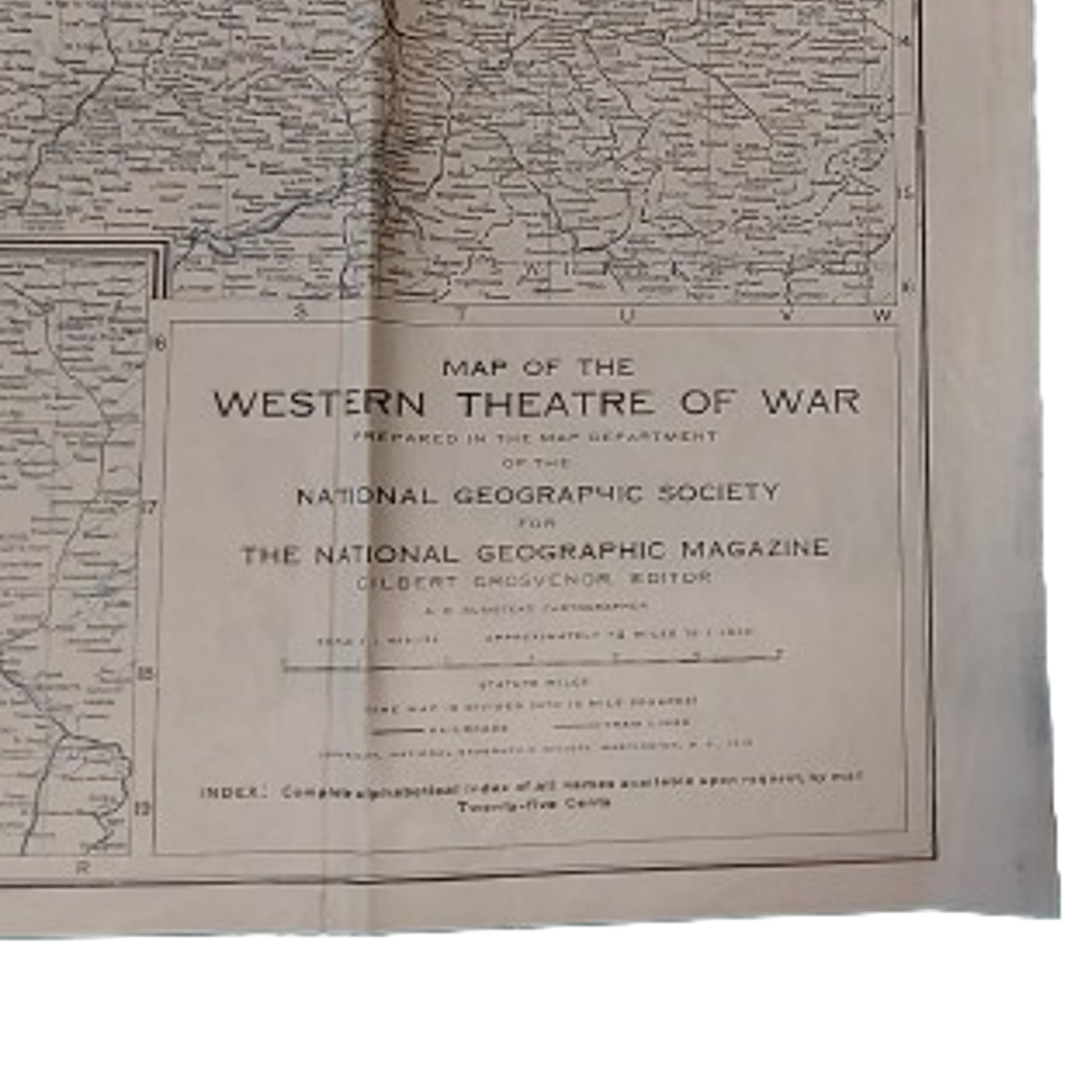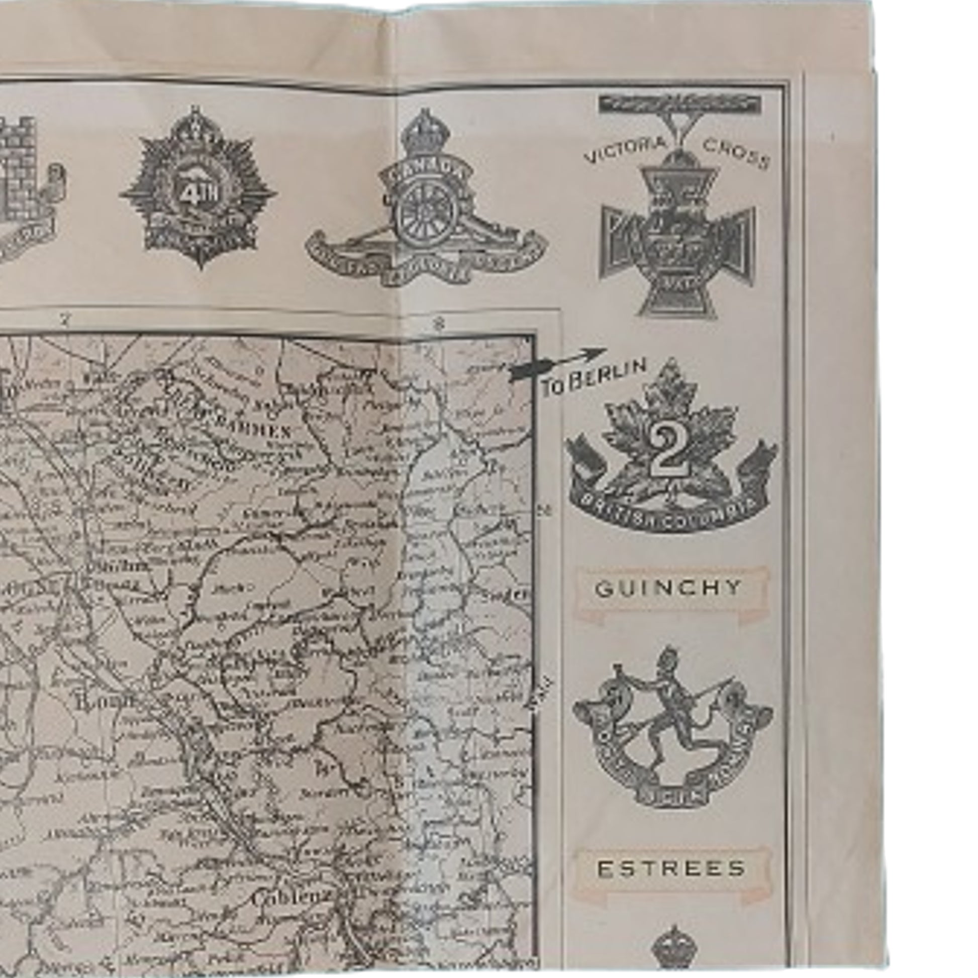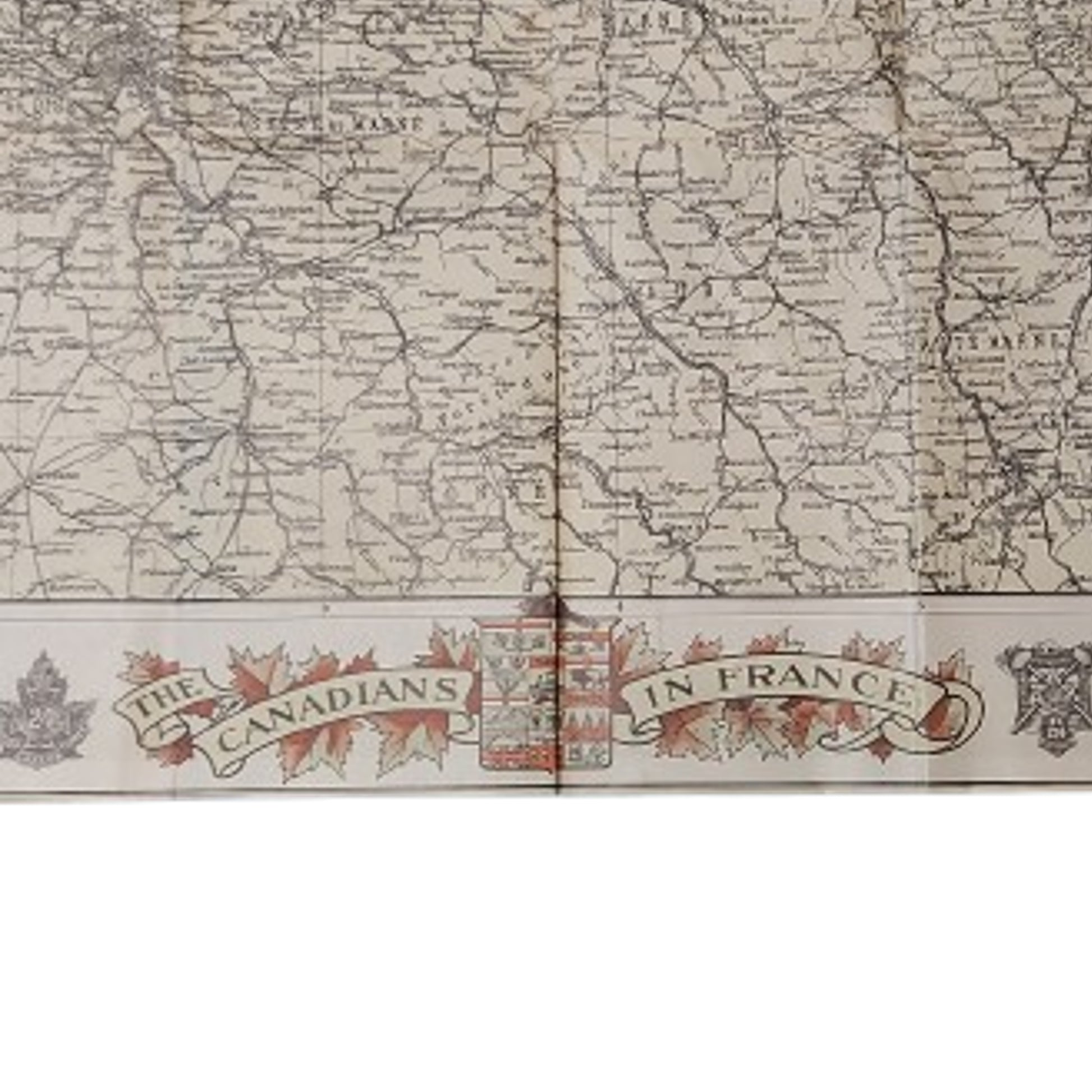 Printed in color on paper, measuring 5 by 10 inches in the folded position, and 27 1/4 by 37 inches when opened. Printed in color with WW1 Canadian CEF cap badges surrounding the border with a gallantry medal to each corner. Some tears to the folded seams and a few tape repairs to the reverse. Would present well when framed. It is also accompanied with a U.S. map of the Western Theatre Of War from the National Geographic Society. Printed in 2 colors on paper, and measures 27 by 32 1/4 inches. SKU: 63182